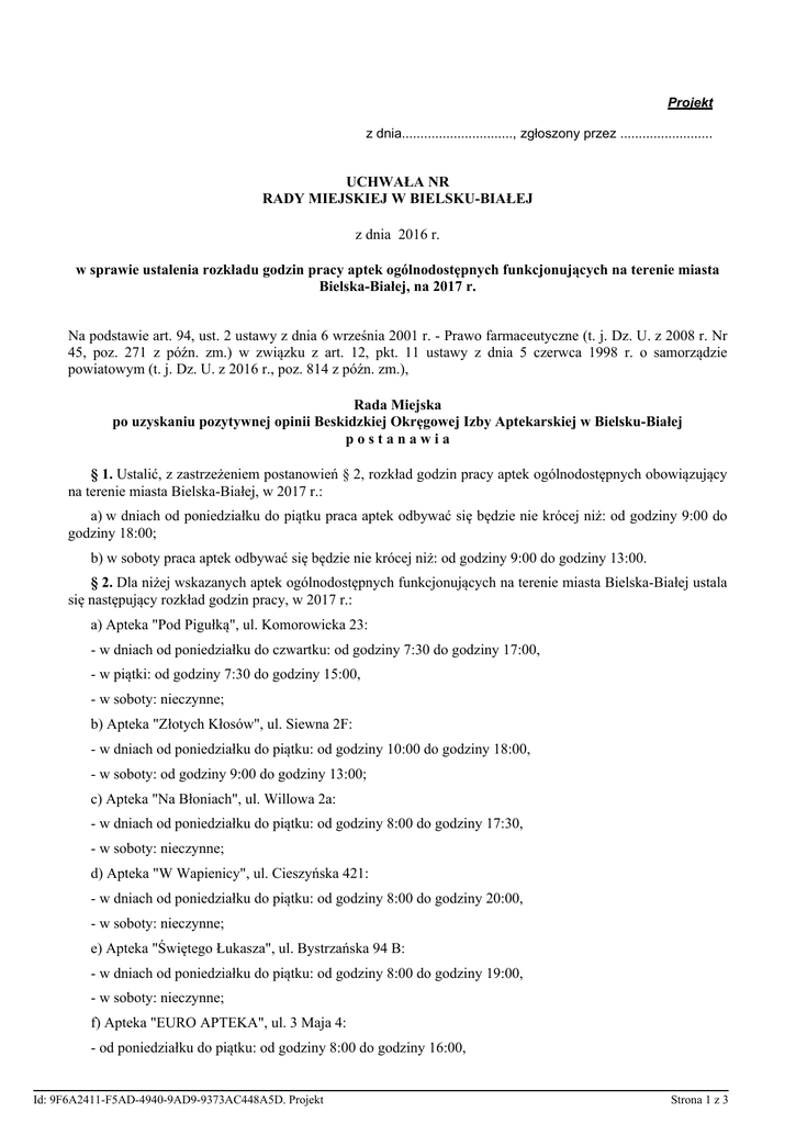 Projekt z dnia.............................., zgłoszony przez ......................... UCHWAŁA NR RADY MIEJSKIEJ W BIELSKU-BIAŁEJ z dnia 2016 r. w sprawie ustalenia rozkładu godzin pracy aptek ogólnodostępnych funkcjonujących na terenie miasta Bielska-Białej, na 2017 r. Na podstawie art. 94, ust. 2 ustawy z dnia 6 września 2001 r. - Prawo farmaceutyczne (t. j. Dz. U. z 2008 r. Nr 45, poz. 271 z późn. zm.) w związku z art. 12, pkt. 11 ustawy z dnia 5 czerwca 1998 r. o samorządzie powiatowym (t. j. Dz. U. z 2016 r., poz. 814 z późn. zm.), Rada Miejska po uzyskaniu pozytywnej opinii Beskidzkiej Okręgowej Izby Aptekarskiej w Bielsku-Białej postanawia § 1. Ustalić, z zastrzeżeniem postanowień § 2, rozkład godzin pracy aptek ogólnodostępnych obowiązujący na terenie miasta Bielska-Białej, w 2017 r.: a) w dniach od poniedziałku do piątku praca aptek odbywać się będzie nie krócej niż: od godziny 9:00 do godziny 18:00; b) w soboty praca aptek odbywać się będzie nie krócej niż: od godziny 9:00 do godziny 13:00. § 2. Dla niżej wskazanych aptek ogólnodostępnych funkcjonujących na terenie miasta Bielska-Białej ustala się następujący rozkład godzin pracy, w 2017 r.: a) Apteka "Pod Pigułką", ul. Komorowicka 23: - w dniach od poniedziałku do czwartku: od godziny 7:30 do godziny 17:00, - w piątki: od godziny 7:30 do godziny 15:00, - w soboty: nieczynne; b) Apteka "Złotych Kłosów", ul. Siewna 2F: - w dniach od poniedziałku do piątku: od godziny 10:00 do godziny 18:00, - w soboty: od godziny 9:00 do godziny 13:00; c) Apteka "Na Błoniach", ul. Willowa 2a: - w dniach od poniedziałku do piątku: od godziny 8:00 do godziny 17:30, - w soboty: nieczynne; d) Apteka "W Wapienicy", ul. Cieszyńska 421: - w dniach od poniedziałku do piątku: od godziny 8:00 do godziny 20:00, - w soboty: nieczynne; e) Apteka "Świętego Łukasza", ul. Bystrzańska 94 B: - w dniach od poniedziałku do piątku: od godziny 8:00 do godziny 19:00, - w soboty: nieczynne; f) Apteka "EURO APTEKA", ul. 3 Maja 4: - od poniedziałku do piątku: od godziny 8:00 do godziny 16:00, Id: 9F6A2411-F5AD-4940-9AD9-9373AC448A5D. Projekt Strona 1 z 3 - w soboty: nieczynne, g) Apteka "Pod Złotym Lwem", ul. Boh. Warszawy 26: - w dniach od poniedziałku do piątku: od godziny 8:00 do godziny 18:00, - w soboty: nieczynne; h) Apteka "Hipokrates", ul. Powstańców Śl. 9, - w dniach od poniedziałku do piątku: od godziny 8:00 do godziny 18:00, - w soboty: nieczynne; i) Apteka Bielskie Centrum Leków, ul. Gen. Maczka 71 b: - w dniach od poniedziałku do piątku: od godziny 8:00 do godziny 18:00, - w soboty: nieczynne. § 3. 1. Dostępność do świadczeń aptek ogólnodostępnych funkcjonujących na terenie miasta BielskaBiałej w porze nocnej, w niedziele i święta oraz w inne dni wolne od pracy, zapewniają apteki całodobowe: a) Apteka "Klimczok", ul. Cyniarska 11, b) Apteka "Na Dworcu", ul. Warszawska 2. 2. Informacja o aptekach pracujących w systemie całodobowym, przekazana zostanie do lokalnej prasy oraz pogotowia ratunkowego. § 4. Wykonywanie uchwały powierza się Prezydentowi Miasta Bielska-Białej. § 5. Traci moc Uchwała Rady Miejskiej w Bielsku-Białej Nr XVIII/419/2012 z dnia 24 kwietnia 2012 r. w sprawie ustalenia rozkładu godzin pracy aptek ogólnodostępnych funkcjonujących na terenie miasta BielskaBiałej (t. j. Uchwała Nr XLIII/1040/2014 Rady Miejskiej w Bielsku-Białej z dnia 24 czerwca 2014 r. z późniejszymi zmianami). § 6. 1. Uchwała wchodzi w życie po upływie 14 dni od jej ogłoszenia w Dzienniku Urzędowym Województwa Śląskiego. Id: 9F6A2411-F5AD-4940-9AD9-9373AC448A5D. Projekt Strona 2 z 3 UZASADNIENIE Do tut. Urzędu wpłynęło pismo z Apteki Bielskie Centrum Leków z siedzibą w Bielsku-Białej przy ul. Gen. Maczka 71 b zawiadamiające, że apteka w soboty jest nieczynna. Wpłynęło również pismo z Apteki „Złotych Kłosów” z siedzibą w Bielsku-Białej przy ul. Siewnej 2F, informujące o godzinach pracy tej apteki, która czynna jest od poniedziałku do piątku w godzinach od 10:00 do 18:00 oraz w soboty w godzinach od 9:00 do 13:00. Godziny czynności ww. aptek są odmienne od ogólnie obowiązujących, przyjętych w Uchwale Rady Miejskiej w Bielsku-Białej Nr XVIII/419/2012 z dnia 24 kwietnia 2012 r. w sprawie ustalenia rozkładu godzin pracy aptek ogólnodostępnych funkcjonujących na terenie miasta Bielska-Białej (t. j. Uchwała Nr XLIII/1040/2014 Rady Miejskiej w Bielsku-Białej z dnia 24 czerwca 2014 r., z późn. zm.), zatem zachodzi konieczność wprowadzenia tych aptek do uchwały. Apteki funkcjonujące na terenie naszego miasta często dokonują zmian w swoich godzinach czasu pracy, wykraczając poza ogólnie obowiązujący, ustalony w Uchwale, co skutkuje koniecznością dokonywania zmian, a następnie ogłaszania tekstów jednolitych uchwały. W związku z powyższym, proponuje się podejmowanie Uchwały Rady Miejskiej w Bielsku-Białej w sprawie ustalenia rozkładu godzin pracy aptek ogólnodostępnych funkcjonujących na terenie miasta Bielska-Białej, na jeden rok kalendarzowy. Mając na względzie pozytywną opinię Beskidzkiej Okręgowej Izby Aptekarskiej w Bielsku-Białej w ww. sprawie, przedkłada się niniejszy projekt uchwały. Id: 9F6A2411-F5AD-4940-9AD9-9373AC448A5D. Projekt Strona 3 z 3