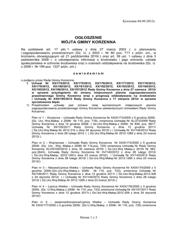 Korzenna 04.09.2012r. OGŁOSZENIE WÓJTA GMINY KORZENNA Na podstawie art. 17 pkt. 1 ustawy z dnia 27 marca 2003 r. o planowaniu i zagospodarowaniu przestrzennym (Dz. U. z 2003 r. Nr 80 poz. 717 z późn. zm., w brzmieniu obowiązującym od 21 października 2010r.) oraz art. 39 ust. 1 ustawy z dnia 3 października 2008 r. o udostępnianiu informacji o środowisku i jego ochronie, udziale społeczeństwa w ochronie środowiska oraz o ocenach oddziaływania na środowiska (Dz. U. z 2008 r. Nr 199 poz. 1227 późn. zm.) zawiadamiam o podjęciu przez Radę Gminy Korzenna: 1. Uchwał Nr XX/174/2012, XX/175/2012, XX/176/2012, XX/177/2012, XX/178/2012, XX/179/2012, XX/180/2012, XX/181/2012, XX/182/2012, XX/183/2012, XX/184/2012, XX/185/2012, XX/186/2012, XX/187/2012 Rady Gminy Korzenna z dnia 27 czerwca 2012r w sprawie przystąpienia do zmiany miejscowych planów zagospodarowania przestrzennego Gminy Korzenna wraz z prognozą oddziaływania na środowisko i Uchwały Nr XXII/195/2012 Rady Gminy Korzenna z 17 sierpnia 2012r w sprawie sprostowania błędu 1) Przedmiotem uchwały jest zmiana niżej wymienionych miejscowych planów zagospodarowania przestrzennego Gminy Korzenna zatwierdzonych Uchwałami Rady Gminy Korzenna: Plan nr 1 – Korzenna – Uchwała Rady Gminy Korzenna Nr XXIX/173/2005 z 5 grudnia 2005r. (Dz. Urz. Woj.Małop. z 2006r Nr 114, poz. 719), zmieniona Uchwałą Nr XL/273/2009 Rady Gminy Korzenna z dnia 14 grudnia 2009r. ( Dz.Urz.Woj.Małop.z 2009r. Nr 849, poz. 6817, Uchwałą Nr XII/105/2011 Rady Gminy Korzenna z dnia 12 grudnia 2011r ( Dz.Urz.Woj.Małop.Nr 2012.310 z dnia 24 stycznia 2012r.) i Uchwałą Nr XV/145/2012 Rady Gminy Korzenna z dnia 28 lutego 2012 r. ( Dz.Urz.Woj.Małop.Nr 2012.1285 z dnia 23 marca 2012r.) Plan nr 2 – Wojnarowa – Uchwała Rady Gminy Korzenna Nr XXIX/174/2005 z 5 grudnia 2005r. (Dz. Urz.. Woj. Małop.z 2006r Nr 114,poz. 720) zmieniona Uchwałą Nr Rady Gminy Korzenna XLVIII/335/2010 z dnia 30 czerwca 2010r ( Dz.Urz.Woj Małop.z 2010r Nr 383, poz.2643), Uchwałą Rady Gminy Korzenna Nr XV/140/2012 z dnia 28 lutego 2012r ( Dz.Urz.Woj.Małop. 2012.1291z dnia 23 marca 2012r) i Uchwałą Nr XV/145/2012 Rady Gminy Korzenna z dnia 28 lutego 2012r ( Dz.Urz.Woj.Małop.Nr 2012.1285 z dnia 23 marca 2012r) . Plan nr 3 – Niecew/Lipnica Wielka – Uchwała Rady Gminy Korzenna Nr XXIX/175/2005 z 5 grudnia 2005r.(Dz.Urz.Woj.Małop.z 2006r Nr 115, poz. 722), zmieniona Uchwałą Nr XII/106/2011 Rady Gminy Korzenna z dnia 12 grudnia 2011r ( Dz.Urz.Woj.Małop.2012.308 z 24 stycznia 2012r. ) i Uchwałą Nr XV/145/2012 Rady Gminy Korzenna z dnia 28 lutego 2012r ( Dz.Urz.Woj.Małop.Nr 2012.1285 z dnia 23 marca 2012r.) Plan nr 4 – Lipnica Wielka – Uchwała Rady Gminy Korzenna Nr XXIX/176/2005 z 5 grudnia 2005r. (Dz. U.Woj.Małop.z 2006r Nr 115, poz. 723) zmieniona Uchwałą Nr XII/107/2011 Rady Gminy Korzenna z dnia 12 grudnia 2011r.( Dz.Urz.Woj.Małop.2012.309 z dnia 24 stycznia 2012r) Plan nr 5 – Jasienna/Korzenna/Lipnica Wielka – Uchwała Rady Gminy Korzenna Nr XXIX/177/2005 z 5 grudnia 2005r. (Dz.U.Woj.Małop. z 2006r. Nr 116, poz. 725) zmieniona Strona 1 z 3 Uchwałą Nr XV/141/2012 Rady Gminy Korzenna ( Dz.Urz.Woj.Małop.2012.1288 z dnia 23 marca 2012r.) z dnia 28 lutego 2012r Plan nr 6 – Łęka/Koniuszowa – Uchwała Rady Gminy Korzenna Nr XXIX/178/2005 z 5 grudnia 2005r. (Dz. U.Woj.Małop. z 2006r. Nr 116, poz. 726) zmieniona Uchwałą Nr XV/142/2012 Rady Gminy Korzenna z dnia 28 lutego 2012r ( Dz.Urz.Woj.Małop.2012.1289 z dnia 23 marca 2012r) Plan nr 7 – Siedlce/Słowikowa – Uchwała Rady Gminy Korzenna Nr XXXII/200/2006 z 31 marca 2006r. (Dz. U.Woj. Małop..z 2006r Nr 250, poz. 1743) zmieniona Uchwałą Nr XII/108/2011 Rady Gminy Korzenna z dnia 12 grudnia 2011r ( Dz.Urz.Woj.Małop.2012.306 z dnia 24 stycznia 2012r.) Plan nr 8 – Trzycierz – Uchwała Rady Gminy Korzenna Nr XXXI/188/2006 z 6 marca 2006r. (Dz.Urz.Woj.Małop.z 2006r Nr. 247, poz. 1737) zmieniona Uchwałą Nr XII/109/2011 Rady Gminy Korzenna z dnia 12 grudnia 2011r . ( Dz.Urz.Woj.Małop.2012.307 z dnia 24 stycznia 2012r.) Plan nr 9 – Mogilno/Posadowa – Uchwała Rady Gminy Korzenna Nr XXXI/189/2006 z 6 marca 2006r. (Dz. Urz.Woj.Małop. z 2006r Nr 247, poz. 1738) zmieniona Uchwałą Nr XL/272/2009 Rady Gminy Korzenna z dnia 14 grudnia 2009r ( Dz.Urz.Woj.Małop.z 2009r. Nr 849 , poz. 6816 ) , Uchwałą Nr XLVII/328/2010 Rady Gminy Korzenna z dnia 31 maja 2010r ( Dz.Urz.Woj.Małop.z 2010r. Nr 344, poz.2379 ) i Uchwałą Nr XV/143/2012 Rady Gminy Korzenna z dnia 28 lutego 2012r ( Dz.Urz.Woj.Małop. 2012.1286 z dnia 23 marca 2012r.) Plan nr 10 – Koniuszowa – Uchwała Rady Gminy Korzenna Nr XXXII/201/2006 z 31 marca 2006r. (Dz. U.Woj.Małop.z 2006r. Nr 250, poz. 1744) zmieniona Uchwałą Nr XV/144/2012 Rady Gminy Korzenna z dnia 28 lutego 2012r. ( Dz.Urz.Woj.Małop.2012.1287 z dnia 23 marca 2012r) Plan nr 11 – Łyczana/Janczowa – Uchwała Rady Gminy Korzenna Nr XXXI/190/2006 z 6 marca 2006r. (Dz. Urz.Woj.Małop.z 2006r Nr 248, poz. 1739) zmieniona Uchwałą Nr XII/110/2011Rady Gminy Korzenna z dnia 12 grudnia 2011r.( Dz.Urz.Woj.Małop.2012.303 z dnia 24 stycznia 2012r.) Plan nr 12 – Miłkowa/Janczowa – Uchwała Rady Gminy Korzenna Nr XXXI/191/2006 z 6 marca 2006r. (Dz.U.Woj.Małop.z 2006r Nr 248, poz. 1740) zmieniona Uchwałą Nr XII/111/2011 Rady Gminy Korzenna z dnia 12 grudnia 2011r ( Dz.Urz.Woj.Małop.2012.304 z dnia 24 stycznia 2012r ) Plan nr 13 – Bukowiec/Jasienna – Uchwała Rady Gminy Korzenna Nr XXXI/192/2006 z 6 marca 2006r. (Dz. Urz.Woj.Małop.z 2006r Nr 249, poz. 1741) zmieniona Uchwałą Nr XII/112/2011 Rady Gminy Korzenna z dnia 12 grudnia 2011r. ( Dz.Urz.Woj.Małop.2012.305 z dnia 24 stycznia 2012r) Plan nr 14 – Mogilno/Posadowa (Podlas) – Uchwała Rady Gminy Korzenna Nr XXXI/193/2006 z 6 marca 2006r. (Dz. Urz.Woj.Małop.z 2006r Nr 249, poz. 1742) zmieniona Uchwałą Nr XII/113/2011 Rady Gminy Korzenna z dnia 12grudnia 2011r ( Dz.Urz.Woj.Małop.
