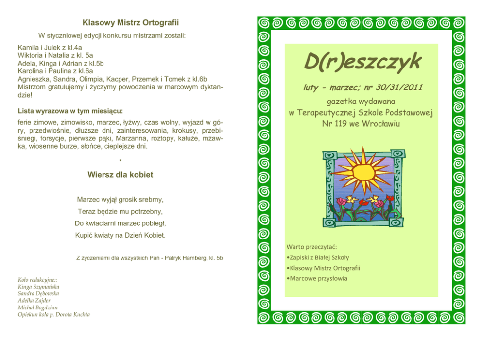 Klasowy Mistrz Ortografii W styczniowej edycji konkursu mistrzami zostali: Kamila i Julek z kl.4a Wiktoria i Natalia z kl. 5a Adela, Kinga i Adrian z kl.5b Karolina i Paulina z kl.6a Agnieszka, Sandra, Olimpia, Kacper, Przemek i Tomek z kl.6b Mistrzom gratulujemy i życzymy powodzenia w marcowym dyktandzie! Lista wyrazowa w tym miesiącu: ferie zimowe, zimowisko, marzec, łyżwy, czas wolny, wyjazd w góry, przedwiośnie, dłuższe dni, zainteresowania, krokusy, przebiśniegi, forsycje, pierwsze pąki, Marzanna, roztopy, kałuże, mżawka, wiosenne burze, słońce, cieplejsze dni. D(r)eszczyk luty - marzec; nr 30/31/2011 gazetka wydawana w Terapeutycznej Szkole Podstawowej Nr 119 we Wrocławiu * Wiersz dla kobiet Marzec wyjął grosik srebrny, Teraz będzie mu potrzebny, Do kwiaciarni marzec pobiegł, Kupić kwiaty na Dzień Kobiet. Warto przeczytać: Z życzeniami dla wszystkich Pań - Patryk Hamberg, kl. 5b •Zapiski z Białej Szkoły •Klasowy Mistrz Ortografii Koło redakcyjne:: Kinga Szymańska Sandra Dębowska Adelka Zajder Michał Bogdziun Opiekun koła p. Dorota Kuchta •Marcowe przysłowia Dziennik Białej Szkoły Marcowe przysłowia Poniedziałek 7 lutego Suchy marzec, mokry maj, będzie żytko jako gaj. Czasami w marcu zetnie wodę w garncu. Czasem marzec tak się podsadzi, że dwa kożuchy oblec nie zawadzi. W marcu jak w garncu. Słońce marcowe, owocom niezdrowe. 7 marca - Na świętego Tomasza wyrasta w polu pasza. 10 marca - Czterdziestu Męczenników jakich, czterdzieści dni po nich takich. 12 Marca - Na świętego Grzegorza idzie zima do morza. 16 marca - Hilary zapowiada, jaka pogoda na Wielkanoc przypada. 19 marca - Gdy na świętego Józefa bociek przybędzie, to już śniegu nie będzie.. Na świętego Jóźwa przez pole jest bruzda. Konkurs recytatorski W kwietniu odbędzie się w naszej szkole konkurs recytatorski wierszy Juliana Tuwima. Wszystkich uczniów zachęcamy do wzięcia w nim udziału. Jest to bowiem dobra okazja, aby spróbować swoich sił i zaprezentować umiejętności. Przyjechaliśmy autokarem do Bolesławowa. Po rozpakowaniu poszliśmy na stok z nauczycielami. Na stoku czułam się fajnie, bo fajnie się zjeżdżało, ale było niebezpiecznie. Zjeżdżałam z Wiktorią, Julką, Klaudią i Adelą. Dzisiaj na stoku przewróciłam się sześć razy, a dziewczyny pomagały mi wstać. Na stoku było dziś fantastycznie i nigdy nie zapomnę tego dnia. Wtorek 8 lutego Dziś wyszliśmy z ośrodka o 10:15. Na stoku było fajnie, ale bardzo ślisko i wiał silny wiatr. Przewróciłam się osiem razy i nawet nie płakałam, tylko się śmiałam. Czułam się fantastycznie. Środa 9 lutego Dziś pierwsza grupa wyszła z ośrodka o 10:00, a druga o 11:00. Byłam w grupie pana Jurka i pana Oktawiana. Pojechaliśmy na drugą stronę stoku, podobało mi się tam. Przewróciłam się pięć razy, Julia też, a Klaudia tylko raz. To był fajny dzień. Czwartek 10 lutego Dziś jeździłam na snowboardzie, to było fajne, ale na nartach jeździ się łatwiej. Na stoku było ślisko, ale był tylko lekki wiatr - dobrze się jeździło. Piątek 11 lutego Dziś wyszliśmy na stok o 10:30, ale wróciliśmy o 12:15, a druga grupa o 12:45, ponieważ w całej okolicy nie było prądu. Po obiedzie zanieśliśmy bagaże, buty i narty do autokaru. A potem pojechaliśmy do domu. Kinga kl.5b Od redakcji: Mamy nadzieję, że mimo licznych upadków Kinga nie zniechęci się do jazdy na nartach i będzie w przyszłości doskonalić swoje umiejętności:)
