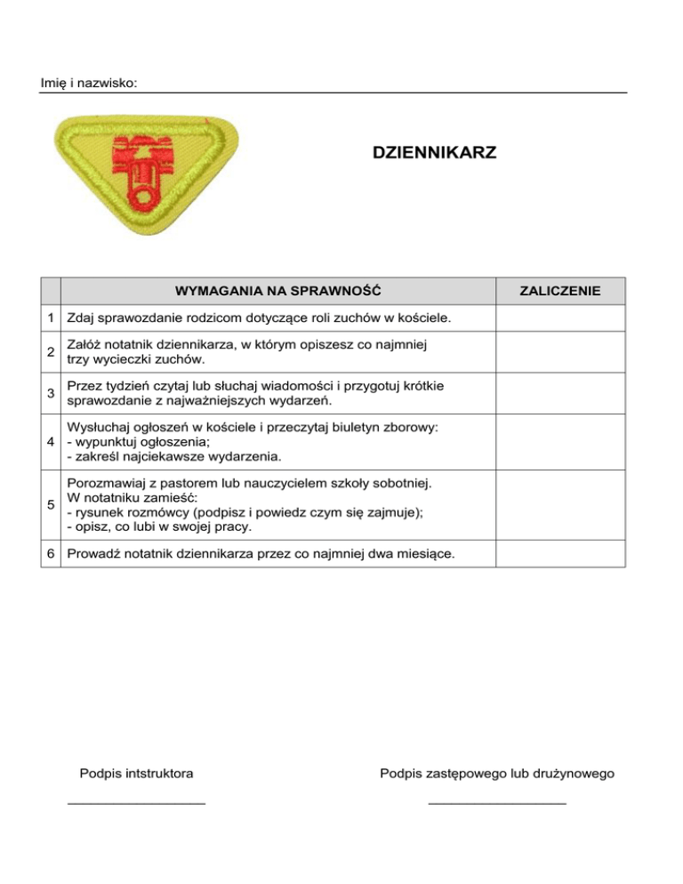 Imię i nazwisko: DZIENNIKARZ WYMAGANIA NA SPRAWNOŚĆ ZALICZENIE 1 Zdaj sprawozdanie rodzicom dotyczące roli zuchów w kościele. 2 Załóż notatnik dziennikarza, w którym opiszesz co najmniej trzy wycieczki zuchów. 3 Przez tydzień czytaj lub słuchaj wiadomości i przygotuj krótkie sprawozdanie z najważniejszych wydarzeń. Wysłuchaj ogłoszeń w kościele i przeczytaj biuletyn zborowy: 4 - wypunktuj ogłoszenia; - zakreśl najciekawsze wydarzenia. Porozmawiaj z pastorem lub nauczycielem szkoły sobotniej. W notatniku zamieść: 5 - rysunek rozmówcy (podpisz i powiedz czym się zajmuje); - opisz, co lubi w swojej pracy. 6 Prowadź notatnik dziennikarza przez co najmniej dwa miesiące. Podpis intstruktora Podpis zastępowego lub drużynowego __________________ __________________