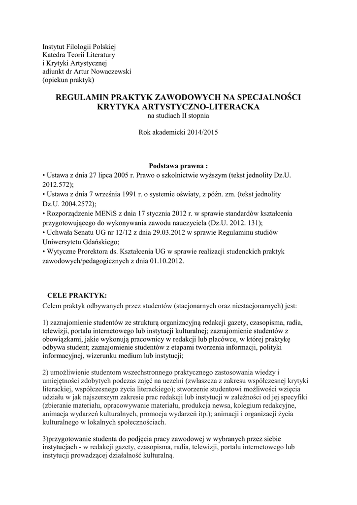Instytut Filologii Polskiej Katedra Teorii Literatury i Krytyki Artystycznej adiunkt dr Artur Nowaczewski (opiekun praktyk) REGULAMIN PRAKTYK ZAWODOWYCH NA SPECJALNOŚCI KRYTYKA ARTYSTYCZNO-LITERACKA na studiach II stopnia Rok akademicki 2014/2015 Podstawa prawna : • Ustawa z dnia 27 lipca 2005 r. Prawo o szkolnictwie wyższym (tekst jednolity Dz.U. 2012.572); • Ustawa z dnia 7 września 1991 r. o systemie oświaty, z późn. zm. (tekst jednolity Dz.U. 2004.2572); • Rozporządzenie MENiS z dnia 17 stycznia 2012 r. w sprawie standardów kształcenia przygotowującego do wykonywania zawodu nauczyciela (Dz.U. 2012. 131); • Uchwała Senatu UG nr 12/12 z dnia 29.03.2012 w sprawie Regulaminu studiów Uniwersytetu Gdańskiego; • Wytyczne Prorektora ds. Kształcenia UG w sprawie realizacji studenckich praktyk zawodowych/pedagogicznych z dnia 01.10.2012. CELE PRAKTYK: Celem praktyk odbywanych przez studentów (stacjonarnych oraz niestacjonarnych) jest: 1) zaznajomienie studentów ze strukturą organizacyjną redakcji gazety, czasopisma, radia, telewizji, portalu internetowego lub instytucji kulturalnej; zaznajomienie studentów z obowiązkami, jakie wykonują pracownicy w redakcji lub placówce, w której praktykę odbywa student; zaznajomienie studentów z etapami tworzenia informacji, polityki informacyjnej, wizerunku medium lub instytucji; 2) umożliwienie studentom wszechstronnego praktycznego zastosowania wiedzy i umiejętności zdobytych podczas zajęć na uczelni (zwłaszcza z zakresu współczesnej krytyki literackiej, współczesnego życia literackiego); stworzenie studentowi możliwości wzięcia udziału w jak najszerszym zakresie prac redakcji lub instytucji w zależności od jej specyfiki (zbieranie materiału, opracowywanie materiału, produkcja newsa, kolegium redakcyjne, animacja wydarzeń kulturalnych, promocja wydarzeń itp.); animacji i organizacji życia kulturalnego w lokalnych społecznościach. 3)przygotowanie studenta do podjęcia pracy zawodowej w wybranych przez siebie instytucjach - w redakcji gazety, czasopisma, radia, telewizji, portalu internetowego lub instytucji prowadzącej działalność kulturalną. ORGANIZACJA PRAKTYK: 1) student zobowiązany jest do odbycia 80 godzin praktyk – po drugim semestrze studiów magisterskich. 2) przed rozpoczęciem praktyk student ma obowiązek: - powiadomienia uczelni (opiekuna praktyk) o terminie zaplanowanych praktyk przynajmniej na 2 tygodnie przed ich rozpoczęciem - odebrania w tym samym terminie od opiekuna praktyk skierowania na praktyki, umowy między uczelnią a instytucją. udzielającą praktyk (w dwóch egzemplarzach) oraz druku ubezpieczenia studenta na czas praktyk. -skierowanie oraz druk ubezpieczenia należy dostarczyć do pokoju 4.9 najpóźniej na 2 tygodnie przed rozpoczęciem praktyk. Po tym terminie dokumenty te nie będą przyjmowane. 3) obowiązki studenta w trakcie odbywania praktyk: -staranne wypełnianie zadań wyznaczonych przez przełożonych/ kierownictwo wybranej instytucji. - zapoznanie się ze strukturą i organizacją pracy w miejscu odbywania praktyk. - uzyskanie opinii (opisowej oceny) poświadczonej stemplem dyrektora instytucji lub osoby przez niego wyznaczonej. 4) z tytułu odbywania praktyk uczelnia nie przewiduje wynagrodzeń dla studentów. MIEJSCE ODBYWANIA PRAKTYK 1) praktyki studenci mogą odbywać w redakcjach, działach kulturalnych gazet i czasopism, redakcjach radiowych, telewizyjnych, portalach internetowych oraz placówkach prowadzących działalność kulturalną (teatry, domy kultury, biblioteki, muzea, fundacje artystyczne). Realizacja praktyk jest dokumentowana w opinii (opisowej ocenie) wystawianej przez instytucję, gdzie student realizuje praktyki. 2) Studenci zatrudnieni, stale współpracujący bądź prowadzący wolontariat w redakcjach gazet i czasopism, radiowych, telewizyjnych lub instytucjach kulturalnych mogą za zgodą opiekuna praktyk ubiegać się o zaliczenie praktyki na podstawie wystawionego przez instytucję zaświadczenia o wykonywanej pracy (zawierającego informację o zatrudnieniu, czasie współpracy, zakresie obowiązków). Również w tym przypadku student jest zobowiązany dostarczyć uczelni opinię (opisową ocenę) przełożonego. 3) zaliczenie praktyk potwierdzone wpisem do indeksu studenci uzyskują u opiekuna praktyk na podstawie opinii wystawionej w miejscu odbywania praktyk. 4) zasady dotyczące realizacji praktyk na studiach stacjonarnych i niestacjonarnych podlegają tej samej procedurze formalnej.