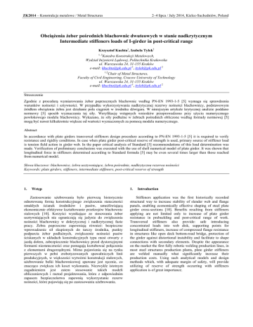 ZK2014 – Konstrukcje metalowe / Metal Structures 2–4 lipca / July 2014, Kielce-Suchedniów, Poland Obciążenia żeber pośrednich blachownic dwuteowych w stanie nadkrytycznym Intermediate stiffeners loads of I-girder in post-critical range Krzysztof Kuchta1, Izabela Tylek2 1, 2 Katedra Konstrukcji Metalowych, Wydział Inżynierii Lądowej, Politechnika Krakowska ul. Warszawska 24, 31-155 Kraków e-mail: [email protected] 1, [email protected] 2 1,2 Chair of Metal Structures, Faculty of Civil Engineering, Cracow University of Technology ul. Warszawska 24, 31-155 Kraków e-mail: [email protected] 1, [email protected] 2 Streszczenie Zgodnie z procedurą wymiarowania żeber poprzecznych blachownic według PN-EN 1993-1-5 [5] wymaga się sprawdzenia warunków nośności i sztywności. W przypadku wykorzystywania nadkrytycznej rezerwy nośności blachownicy, podstawowym źródłem obciążenia żebra jest działanie pola ciągnień w środniku dźwigara. W niniejszym artykule krytycznej analizie poddano normowy [5] sposób wyznaczania tej siły. Weryfikację wstępnych wniosków przeprowadzono przy użyciu numerycznego powłokowego modelu blachownicy. Wykazano, że siły podłużne w żebrach pośrednich obliczone według formuły normowej [5] mogą być nawet kilkukrotnie większe od wartości wyznaczonych za pomocą modelu numerycznego. Abstract In accordance with plate girders transversal stiffeners design procedure according to PN-EN 1993-1-5 [5] it is required to verify resistance and rigidity conditions. In case when plate girder post-critical reserve of strength is used, primary source of stiffener load is tension field action in girder web. In the paper critical analysis of Standard [5] recommendations of this load determination was made. Verification of preliminary conclusions was executed with the use of shell numerical model of plate girder. It was shown that longitudinal force in stiffeners determined according to Standard formula [5] may be even several times larger than those reached from numerical model. Słowa kluczowe: blachownice, żebra usztywniające, żebra pośrednie, nadkrytyczna rezerwa nośności Keywords: plate girders, stiffeners, intermediate stiffeners, post-critical reserve of strength 1. Wstęp Zastosowanie użebrowania było pierwszą historycznie odnotowaną formą konstrukcyjnego zwiększenia stateczności smukłych ścianek środników i pasów, umożliwiającą ekonomicznie efektywne kształtowanie przekrojów blachownic stalowych [10]. Korzyści wynikające ze stosowania żeber usztywniających nie ograniczają się jedynie do zwiększenia nośności blachownicy w dokrytycznej i nadkrytycznej fazie pracy. Żebra poprzeczne zapewniają również: bezpieczne wprowadzenie sił skupionych do tarczy środnika, punkty podparcia żeber podłużnych, zwiększenie nośności pasów ściskanych w układach konstrukcyjnych typu most otwarty z jazdą dołem, zabezpieczenie blachownicy przed dystorsyjnymi formami niestateczności oraz pomagają kształtować połączenia z elementami drugorzędnymi. Mimo pojawienia się na rynku pierwszych w pełni zrobotyzowanych spawalniczych linii produkcyjnych, w większości wytwórni konstrukcji stalowych, użebrowanie belki blachownicowej spawane jest ręcznie, co znacząco zwiększa ich koszt wykonania. Niezwykle istotnym zagadnieniem jest zatem stosowanie takich modeli obliczeniowych i metod projektowania, które z odpowiednim zapasem bezpieczeństwa zapewnią wykorzystanie rezerw nośności, które pojawiają się po zastosowaniu użebrowania. 1. Introduction Stiffeners application was the first historically recorded structural way to increase stability of slender web and flange panels, enabling economically effective shaping of steel plate girder cross-sections [10]. Benefits resulting from stiffeners applying are not limited only to increase of plate girder resistance in prebuckling and post-critical range of work. Transversal stiffeners also provide: safe introducing concentrated loads into web disk, supporting points for longitudinal stiffeners, increase of compressed flange resistance in structures like open deck bottom-road bridge, protection of the girder against distortional instability and facilitate to shape connections with secondary elements. Despite the appearance on the market the first fully robotic welding production lines, in most steel structures production plants, plate girder stiffeners are welded manually what significantly increase their production costs. Using such analytical models and design methods which, with adequate margin of safety, will provide utilizing of reserve of strength occurring with stiffeners application is of great importance. ZK2014 – Konstrukcje metalowe / Metal Structures 2. 2–4 lipca / July 2014, Kielce-Suchedniów, Poland Wymiarowanie żeber pośrednich w świetle wymagań normy PN-EN 1993-1-5 [5] 2. Model obliczeniowy i procedura wymiarowania żeber poprzecznych blachownic zawarta w normie PN-EN 1993-1-5 [5] w sposób istotny różni się od wymagań projektowych poprzedniej normy polskiej PN-B-03200:1990 [4]. Ze względu na to, że w normie PN-EN 1993-2 [6] nie podano przepisów dotyczących weryfikacji stateczności dźwigarów blachownicowych, norma [5] jest obecnie dokumentem wspólnym zarówno dla projektantów obiektów kubaturowych jak i mostowych. Konieczność uwzględnienia przypadków projektowych, w których żebro poprzeczne może być prętem o wielometrowej rozpiętości, wymusiła przyjęcie modelu obliczeniowego w postaci ściskanego i zginanego pręta z wstępną imperfekcją geometryczną w postaci półfali sinusoidy o strzałce wygięcia w0 (rys.1). Design of intermediate stiffeners in the light of requirements of PN-EN 1993-1-5 [5] Analytical model and design procedure of plate girder transverse stiffeners contained in PN-EN 1993-1-5 [5] considerably differs from design requirements of previous Polish Standard PN-B-03200:1990 [4]. For the reason that 