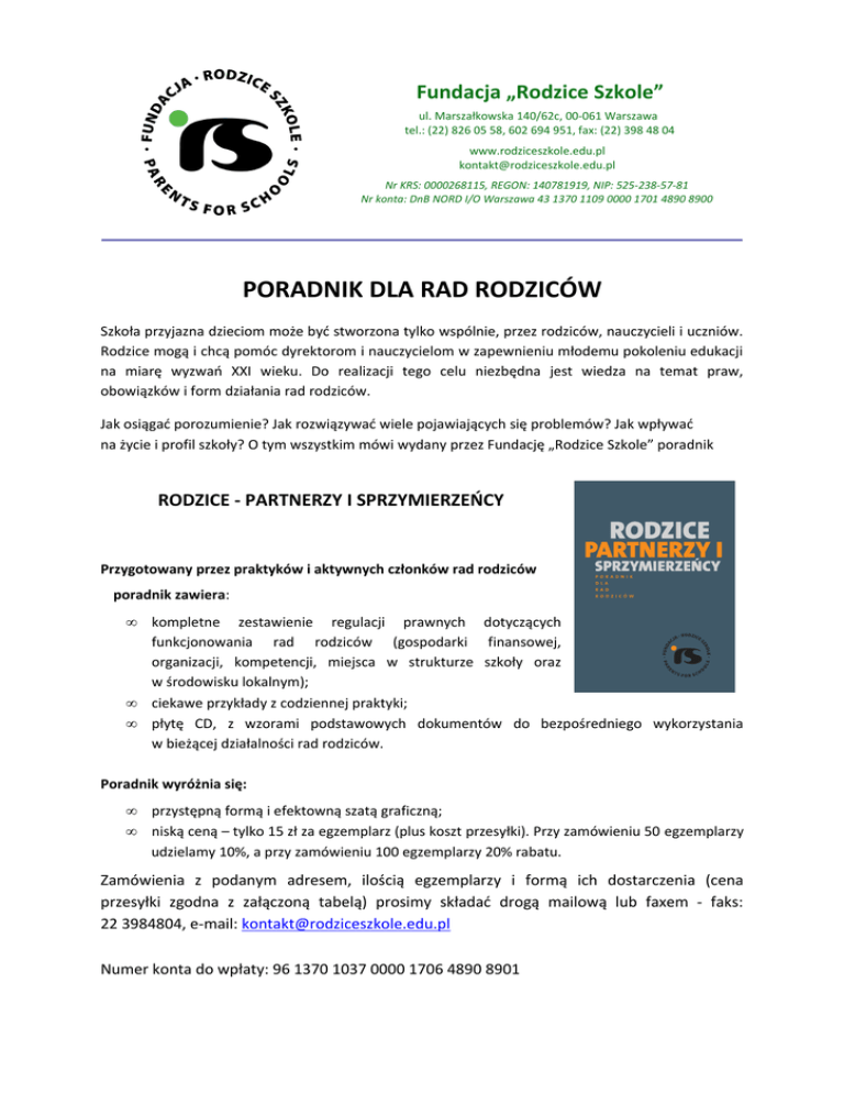 Fundacja „Rodzice Szkole” ul. Marszałkowska 140/62c, 00-061 Warszawa tel.: (22) 826 05 58, 602 694 951, fax: (22) 398 48 04 www.rodziceszkole.edu.pl [email protected] Nr KRS: 0000268115, REGON: 140781919, NIP: 525-238-57-81 Nr konta: DnB NORD I/O Warszawa 43 1370 1109 0000 1701 4890 8900 PORADNIK DLA RAD RODZICÓW Szkoła przyjazna dzieciom może być stworzona tylko wspólnie, przez rodziców, nauczycieli i uczniów. Rodzice mogą i chcą pomóc dyrektorom i nauczycielom w zapewnieniu młodemu pokoleniu edukacji na miarę wyzwań XXI wieku. Do realizacji tego celu niezbędna jest wiedza na temat praw, obowiązków i form działania rad rodziców. Jak osiągać porozumienie? Jak rozwiązywać wiele pojawiających się problemów? Jak wpływać na życie i profil szkoły? O tym wszystkim mówi wydany przez Fundację „Rodzice Szkole” poradnik RODZICE - PARTNERZY I SPRZYMIERZEŃCY Przygotowany przez praktyków i aktywnych członków rad rodziców poradnik zawiera: • • • kompletne zestawienie regulacji prawnych dotyczących funkcjonowania rad rodziców (gospodarki finansowej, organizacji, kompetencji, miejsca w strukturze szkoły oraz w środowisku lokalnym); ciekawe przykłady z codziennej praktyki; płytę CD, z wzorami podstawowych dokumentów do bezpośredniego wykorzystania w bieżącej działalności rad rodziców. Poradnik wyróżnia się: • • przystępną formą i efektowną szatą graficzną; niską ceną – tylko 15 zł za egzemplarz (plus koszt przesyłki). Przy zamówieniu 50 egzemplarzy udzielamy 10%, a przy zamówieniu 100 egzemplarzy 20% rabatu. Zamówienia z podanym adresem, ilością egzemplarzy i formą ich dostarczenia (cena przesyłki zgodna z załączoną tabelą) prosimy składać drogą mailową lub faxem - faks: 22 3984804, e-mail: [email protected] Numer konta do wpłaty: 96 1370 1037 0000 1706 4890 8901 Tabela opłat za przesyłkę Ilość zamówionych egzemplarzy Poczta Polska In Post List Ekonomiczny List Priorytetowy List Ekonomiczny List Ekspresowy 1-3 1,90 2,90 1,50 2,20 4-5 2,70 3,60 1,90 2,60 6-10 4,80 6,30 3,80 4,50 11-20 6,30 8,80 4,80 5,90 Paczka Ekonomiczna Paczka ekspresowa Paczka 21-50 13,00 14,50 10 51-100 18,00 20,50 Brak możliwości wysyłki Zamówione egzemplarze wysyłamy niezwłocznie po otrzymaniu wpłaty. Zarząd Fundacji „Rodzice Szkole”