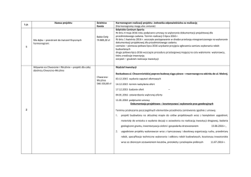 L.p. Nazwa projektu Siła dębu – przestrzeń do ćwiczeń fizycznych harmonogram: Dzielnica Kwota Babie Doły 74 869,20 zł 1 Aktywnie na Chwarznie i Wiczlinie – projekt dla całej dzielnicy Chwarzno-Wiczlino Harmonogram realizacji projektu Jednostka odpowiedzialna za realizację (Harmonogramy mogą ulec zmianie) Gdyńskie Centrum Sportu W dniu 4 maja 2016 roku podpisano umowę na wykonanie dokumentacji projektowej dla przedmiotowego zadania. Termin realizacji 3 lipca 2016 r. W dniu 1 kwietnia 2016 r. wszczęto postępowanie w drodze przetargu nieograniczonego na wykonanie dokumentacji projektowej dla przedmiotowego zadania. czerwiec – pierwsza połowa lipca 2016 uzyskanie przyjęcia zgłoszenia zamiaru wykonania robót budowlanych druga połowa lipca 2016 wszczęcie procedury przetargowej mającej na celu wyłonienie wykonawcy, który zrealizuje inwestycję sierpień – grudzień realizacja inwestycji Wydział Inwestycji Rozbudowa ul. Chwarznieńskiej poprzez budowę ciągu pieszo – rowerowego na odcinku do ul. Mokrej. ChwarznoWiczlino 546 150,00 zł 03.12.2015 wysłanie zapytań ofertowych 14.12.2015 termin nadsyłania ofert 17.12.2015 badanie ofert – 04.01.2016 zatwierdzenie wybranej oferty 11.01.2016 podpisanie umowy Dokumentacja projektowo – kosztorysowa i wykonanie prac geodezyjnych 2 Terminy przekazania poszczególnych elementów przedmiotu zamówienia zgodnie z umową: 1. projekt budowlany na aktualnej mapie do celów projektowych wraz z kompletem uzgodnień, materiały do wniosku o wydanie decyzji o zezwoleniu na realizację inwestycji drogowej, badania geologiczne gruntu, inwentaryzacja zieleni i gospodarka drzewostanem 2. 13.06.2016 r., uzgodnione projekty wykonawcze wraz z tymczasową i docelową organizacją ruchu, przedmiary robót, specyfikacje techniczne wykonania i odbioru robót budowlanych, kosztorysy inwestorskie wraz ze zbiorczym zestawieniem kosztów, protokoły z przekopów próbnych 11.07.2016 r. 3. potwierdzone projekty podziału do wniosku o zgodę na realizację inwestycji drogowej (ZRID) – 11.05.2016 4. weryfikacja projektu budowlanego i złożenie wniosku ZRID – 13.07.2016 r. 5. weryfikacja projektów wykonawczych, KI i ST – 11.08.2016 r. 6. uzyskanie decyzji ZRiD – 3 miesiące od złożenia wniosku – 13.10.2016 r. Ustalenie terminu realizacji prac budowlanych będzie możliwe po wykonaniu dokumentacji projektowej Gdyńskie Centrum Sportu Budowa siłowni zewnętrznej przy ul. Okrężnej W dniu 4 maja 2016 r. podpisano umowę na wykonanie dokumentacji projektowej dla przedmiotowego zadania. Termin realizacji: 3 lipca 2016 roku. W przygotowaniu przetarg nieograniczony na wykonanie dokumentacji projektowej. marzec – maj 2016 przygotowanie dokumentacji projektowej - wraz z uzyskaniem niezbędnych uzgodnień z uwzględnieniem uwag wnioskodawców; sprawdzenie dokumentacji czerwiec – pierwsza połowa lipca 2016 uzyskanie przyjęcia zgłoszenia zamiaru wykonania robót budowlanych druga połowa lipca 2016 wszczęcie procedury przetargowej mającej na celu wyłonienie wykonawcy, który zrealizuje inwestycję sierpień – grudzień 2016 realizacja inwestycji Gdyńskie Centrum Sportu budowa boiska o nawierzchni poliuretanowej i skoczni w dal wraz z wyposażeniem Aktywna Chylonia 3 4 Cisowa PlayGround Chylonia 350 000,00 zł Cisowa 258 680,00 zł Aktualnie trwa etap wykonania dokumentacji projektowej. W dniu 30 marca 2016 r. podpisano umowę na wykonanie dokumentacji projektowej dla przedmiotowej inwestycji. Planowany termin wykonania dokumentacji: 20 czerwca 2016 roku. czerwiec – pierwsza połowa lipca 2016 uzyskanie przyjęcia zgłoszenia zamiaru wykonania robót budowlanych druga połowa lipca 2016 wszczęcie procedury przetargowej mającej na celu wyłonienie wykonawcy, który zrealizuje inwestycję sierpień – grudzień 2016 realizacja inwestycji Zarząd Dróg i Zieleni zadanie inwestycyjne Podpisana została umowa z wykonawcą dokumentacji projektowo- kosztorysowej. Termin wykonania 21.05.2016r. Wystąpiono do Wydz. Gosp. Nieruch. o zawarcie umowy użyczenia . Uzyskano mapę do celów informacyjnych. Rozpoczęte zostało postepowanie o zamówienie publiczne na wybór wykonawcy dokumentacji projektowo-kosztorysowej. do 30. 05.2016 projekt i zgłoszenie robót budowlanych do Wydz. Arch. - Bud. 30.06.2016 przetarg, zawarcie umowy z wykonawcą 30.09.2016 realizacja w terenie Gdyńskie Centrum Sportu 5 Mini Boisko Szkolne przy ZWE nr 1 Gdynia Dąbrowa, ul. Wiczlińska Dąbrowa 187 000,00 zł W dniu 19 kwietnia 2016 roku wszczęto postępowanie w trybie przetargu nieograniczonego dotyczące wykonania dokumentacji projektowej dla przedmiotowego zadania. W dniu 29 kwietnia 2016 roku nastąpiło otwarcie ofert. Obecnie trwa sprawdzanie ofert. W dniu 4 maja 2016 roku podpisano umowę na wykonanie dokumentacji projektowej dla przedmiotowego zadania. Termin realizacji: 23 lipca 2016 roku W przygotowaniu przetarg nieograniczony na wykonanie dokumentacji projektowej. marzec – maj 2016 Przygotowanie dokumentacji projektowej - wraz z uzyskaniem niezbędnych uzgodnień z uwzględnieniem uwag wnioskodawców; sprawdzenie dokumentacji czerwiec – lipiec 2016 uzyskanie pozwolenia na budowę sierpień 2016 wszczęcie procedury przetargowej mającej na celu wyłonienie wykonawcy, który zrealizuje inwestycję wrzesień – grudzień 2016 realizacja inwestycji Gdyńskie Centrum Sportu budowa boiska o nawierzchni poliuretanowej i skoczni w dal wraz z wyposażeniem 6 Rozbudowa terenów sportowych w Zespole Szkół nr 14 Boisko z bezpieczną nawierzchnią przy Gimnazjum nr 2 7 Dąbrowa 50 000,00 zł Działki Leśne 119 891,00 zł W dniu 1 kwietnia 2016 r. wpłynęła decyzja o ustaleniu inwestycji celu publicznego. W przygotowaniu przetarg nieograniczony na wykonanie dokumentacji projektowej. czerwiec – pierwsza połowa lipca 2016 uzyskanie przyjęcia zgłoszenia zamiaru wykonania robót budowlanych druga połowa lipca 2016 wszczęcie procedury przetargo