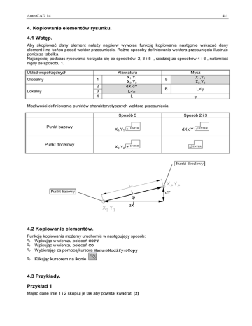 Auto CAD 14 4-1 4. Kopiowanie elementów rysunku. 4.1 Wstęp. Aby skopiować dany element należy najpierw wywołać funkcję kopiowania następnie wskazać dany element i na końcu podać wektor przesunięcia. Rożne sposoby definiowania wektora przesunięcia ilustruje poniższa tabelka. Najczęściej podczas rysowania korzysta się ze sposobów: 2, 3 i 5 , rzadziej ze sposobów 4 i 6 , natomiast nigdy ze sposobu 1. Układ współrzędnych Globalny 1 Lokalny 2 3 4 Klawiatura X1,Y1 X2,Y2 dX,dY L<ϕ L 5 Mysz X1,Y1 X2,Y2 6 L<ϕ ϕ Możliwości definiowania punktów charakterystycznych wektora przesunięcia. Sposób 5 Punkt bazowy Punkt docelowy X1,Y1 ENTER X2,Y2 ENTER Sposób 2 i 3 dX,dY ENTER ENTER Punkt docelowy Punkt bazowy ϕ dX 4.2 Kopiowanie elementów. Funkcję kopiowania możemy uruchomić w następujący sposób: !"Wpisując w wierszu poleceń COPY !"Wpisując w wierszu poleceń CO !"Wybierając za pomocą kursora Menu⇒ ⇒Modify⇒ ⇒Copy !"Klikając kursorem na ikonie 4.3 Przykłady. Przykład 1 Mając dane linie 1 i 2 skopiuj je tak aby powstał kwadrat. (2) dY Auto CAD 14 4-2 Narysuj linie 1 i 2. Kliknij kursorem na ikonie Select objects: wskaż linię 1 i naciśnij ENTER <Base point or displacement>/Multiple: 20,0 Second point of displacement: ENTER ENTER Select objects: wskaż linię 2 i naciśnij ENTER <Base point or displacement>/Multiple: 0,20 Second point of displacement: ENTER ENTER Przykład 2 Za pomocą klawiatury skopiuj poniższą linię. (3) 30 10° Narysuj linię Kliknij kursorem na ikonie Select objects: wskaż linię i naciśnij ENTER <Base point or displacement>/Multiple: 30<10 Secon point of displacement: ENTER ENTER Przykład 3 Za pomocą myszki i klawiatury skopiuj poniższą linię. (4) 30 Włącz SNAP za pomocą klawisza F9 i GRID za pomocą klawisza F7 Narysuj linię Auto CAD 14 4-3 Kliknij kursorem na ikonie Select objects: wskaż linię i naciśnij ENTER <Base point or displacement>/Multiple: kliknij kursorem w dowolnym miejscu Secon point of displacement: przesuń tak aby otrzymać kąt 0° wpisz z klawiatury 30 i naciśnij ENTER Przykład 4 Za pomocą myszki skopiuj poniższą linię. 40 1 2 Włącz SNAP za pomocą klawisza F9 i GRID za pomocą klawisza F7 Narysuj linię Kliknij kursorem na ikonie Select objects: wskaż linię i naciśnij ENTER <Base point or displacement>/Multiple: kliknij myszą w dowolnym punkcie 1 ENTER Secon point of displacement: kliknij myszą w punkcie 2 (takim aby uzyskać pożądany wektor) ENTER Przykład 5 Za pomocą myszki skopiuj poniższą linię. (6) 30 40 Włącz SNAP za pomocą klawisza F9 i GRID za pomocą klawisza F7 Narysuj linię Kliknij kursorem na ikonie Select objects: wskaż linię i naciśnij ENTER <Base point or displacement>/Multiple: kliknij kursorem w dowolnym miejscu Secon point of displacement: przesuń kursor w prawo o 40 i w górę o 30 następnie kliknij w tym miejscu 4.4 Zadania Zadanie 1 Auto CAD 14 4-4 Narysuj poniższy profil a następnie skopiuj linie po linii sposobem drugim a następnie trzecim. Zadanie 2 Narysuj linię 1 i 2 a następnie skopiuj je kolejno sposobem drugim, trzecim i piątym tak aby otrzymać poniższy profil. Zadanie 3 Narysuj linię 1 i 2 a następnie skopiuj je sposobem trzecim tak aby otrzymać poniższy kształt. 45°°