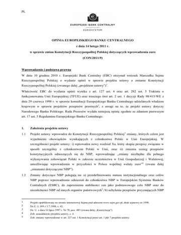 PL OPINIA EUROPEJSKIEGO BANKU CENTRALNEGO z dnia 14 lutego 2011 r. w sprawie zmian Konstytucji Rzeczypospolitej Polskiej dotyczących wprowadzenia euro (CON/2011/9) Wprowadzenie i podstawa prawna W dniu 10 grudnia 2010 r. Europejski Bank Centralny (EBC) otrzymał wniosek Marszałka Sejmu Rzeczypospolitej Polskiej o wydanie opinii w sprawie projektu ustawy o zmianie Konstytucji Rzeczypospolitej Polskiej (zwanego dalej „projektem ustawy”)1. Właściwość EBC do wydania opinii wynika z art. 127 ust. 4 oraz art. 282 ust. 5 Traktatu o funkcjonowaniu Unii Europejskiej (TFUE) oraz trzeciego tiret art. 2 ust. 1 decyzji Rady 98/415/WE z dnia 29 czerwca 1998 r. w sprawie konsultacji Europejskiego Banku Centralnego udzielanych władzom krajowym w sprawie projektów przepisów prawnych2, z uwagi na to, że projekt ustawy dotyczy Narodowego Banku Polskiego. Rada Prezesów wydała niniejszą opinię zgodnie ze zdaniem pierwszym art. 17 ust. 5 Regulaminu Europejskiego Banku Centralnego. 1. Założenia projektu ustawy 1.1 Projekt ustawy wprowadza do Konstytucji Rzeczypospolitej Polskiej3 zmiany, których celem jest wypełnienie obowiązków wynikających z członkostwa Polski w Unii Europejskiej. W szczególności projekt ustawy: i) wprowadza nowy rozdział Xa, który skupia przepisy związane w sposób szczególny z członkostwem Polski w Unii, oraz ii) zmienia szereg przepisów konstytucyjnych odnoszących się do NBP, wprowadzając „zmiany niezbędne dla pełnego wykonywania zobowiązań Polski w zakresie uczestnictwa w Unii Gospodarczej i Walutowej, umożliwiając wprowadzenie w przyszłości w Polsce wspólnej waluty euro”4 (zwane dalej „zmianami dotyczącymi NBP”). 1.2 Zmiany dotyczące NBP polegają na: a) przedefiniowaniu statusu instytucjonalnego oraz celów NBP poprzez wprowadzenie odniesień do członkostwa NBP w Europejskim Systemie Banków Centralnych (ESBC), do zapewnienia stabilności cen jako podstawowego celu NBP oraz do niezależności NBP od innych organów państwowych5; b) uchyleniu przepisów przyznających NBP 1 2 3 4 5 Projekt opublikowany na stronie internetowej Sejmu pod adresem www.sejm.gov.pl, druk sejmowy nr 3598. Dz.U. L 189 z 3.7.1998, s. 42. Dz. U. z dnia 16 lipca 1997 r. Nr 78, poz. 483 (zwana dalej „Konstytucją”). Zob. uzasadnienie projektu ustawy, s. 4. Zob. zmiany wprowadzone w art. 227 ust. 1 Konstytucji przez art. 1 pkt 7 projektu ustawy. wyłączne prawo emisji pieniądza oraz ustalania i realizowania polityki pieniężnej; c) zniesieniu Rady Polityki Pieniężnej (RPP), jako jednego z organów decyzyjnych NBP6, d) zmianie zakresu kontroli NBP dokonywanej przez Najwyższą Izbę Kontroli (NIK)7, oraz e) usunięciu Prezesa NBP z grona osób ponoszących odpowiedzialność przed Trybunałem Stanu8. 1.3 Zgodnie z projektem ustawy zmiany dotyczące NBP wchodzą w życie z dniem, w którym środkiem pieniężnym w Rzeczpospolitej Polskiej stanie się euro9. 2. Uwagi ogólne 2.1 Od 2004 roku w Raportach o konwergencji EBC dokonuje oceny zgodności ustawodawstwa polskiego, w tym Konstytucji, z wymogami prawa pierwotnego Unii dotyczącymi członkostwa NBP w ESBC oraz, w przyszłości, w Eurosystemie. Ocena ta dotyczy w szczególności: a) zgodności prawa krajowego z prawem Unii w zakresie niezależności banku centralnego i poufności; b) zgodności prawa krajowego z zawartym w prawie Unii zakazem finansowania ze środków banku centralnego oraz uprzywilejowanego dostępu; oraz c) integracji prawnej NBP z Eurosystemem. Niniejsza opinia ma strukturę zgodną ze strukturą oceny zawartej w odpowiednich Raportach o konwergencji EBC. 2.2 Przepisy prawne, których niezgodność z prawem Unii EBC wskazywał w Raportach o konwergencji, są zawarte zarówno w Konstytucji, jak i ustawach zwykłych, a w szczególności w ustawie z 29 sierpnia 1997 r. o Narodowym Banku Polskim10. Niniejsza opinia skupia się na zmienianych przez projekt ustawy przepisach konstytucyjnych, odnosząc się również – tam, gdzie to konieczne – bezpośrednio do powiązanych z nimi przepisów ustaw zwykłych. EBC zachęca władze polskie do zapewnienia zgodności z wymogami Unii na wszystkich szczeblach prawa krajowego, w terminach przewidzianych w prawie Unii. Prawo Unii nie narzuca sposobu dostosowania ustawodawstwa krajowego w celu osiągnięcia zgodności z odpowiednimi wymogami TFUE oraz Statutu Europejskiego Systemu Banków Centralnych i Europejskiego Banku Centralnego (zwanego dalej „Statutem ESBC”). Można tego dokonać bądź to przez umieszczenie odwołań do TFUE i Statutu ESBC, bądź też przez włączenie do prawa krajowego odpowiednich postanowień TFUE i Statutu ESBC ze wskazaniem ich źródła, względnie przez usunięcie występujących niezgodności albo łączne zastosowanie wymienionych sposobów11. Zmiany w prawie krajowym mogą być wprowadzane – w zależności od uznania ustawodawcy, z 6 7 8 9 10 11 Zob. zmiany wprowadzone w art. 103 ust. 1, art. 144 ust. 3 oraz art. 227 ust. 1, 5 i 6 Konstytucji przez art. 1 pkt 2, art. 1 pkt 3 oraz art. 1 pkt 7 projektu ustawy oraz art. 2 projektu ustawy. Zob. zmiany wprowadzone w art. 203 ust. 1 oraz art. 204 ust. 1 pkt 1 Konstytucji przez art. 1 pkt 5 oraz art. 1 pkt 6 projektu ustawy. Zob. zmiany wprowadzone w art. 198 ust. 1 Konstytucji przez art. 1 pkt 4 projektu ustawy. Zob. art. 3 projektu ustawy. Tekst jednolity Dz. U. z dnia 4 czerwca 2005 r. Nr 1, poz. 2 (zwana dalej „ustawą o NBP”). Zob. Raport o konwergencji EBC z 2010 r., punkt 2.2.2.2, s. 17 (podana w niniejszej opinii numeracja stron odnosi się do anglojęzycznej wersji Raportu). 2 uwzględnieniem hierarchicznej budowy systemu źródeł prawa – w przepisach konstytucyjnych, ustawach zwykłych bądź jednocześnie w Konstytucji i ustawach zwykłych. 3. Niezależność banku centralnego Niezależność funkcjonalna 3.1 Zgodnie z zasadą funkcjonalnej niezależności krajowego banku centralnego (KBC) podstawowy cel jego działalności powinien być 