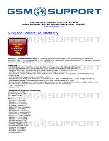 GSM-Support ul. Bitschana 2/38, 31-420 Kraków mobile +48 608107455, NIP PL9451852164 REGON: 120203925 www.gsm-support.net Aktywacja Chimera Tool Blackberry Aktywacja Chimera Tool BlackBerry to aktywacja oprogramowania Chimera Tool, przeznaczonego dla telefonów Blackberry (OS 6, 7, 10) pozwalającego m.in na naprawę IMEI, flashowanie, odblokowanie telefonu czy też odczyt informacji przez okres 12 miesięcy od daty aktywacji bez limitu telefonów. Możliwości - NIELIMITOWANA ilość odblokowań telefonów BlackBerry za pomocą kabla USB przez 12 miesięcy - aktualizacja (upgrade) wersji oprogramowania nawet jeśli nie jest wspieranie przez operatora. - większość telefonów z "migającą czerwoną diodą" można naprawić za pomocą Chimera Tool - przeflashowania własnej listy modułu dwoma metodami pełną oraz minimalną - po podłączeniu swojego telefonu Blackberry do komputera wystarczą tylko 2 kliknięcia aby zainstalować najnowszy firmware/język - można dodać każdy język dostępny dla twojego telefonu - odczyt wszystkich dostępnych informacji z telefonu takich jak: IMEI, blokada operatora, wersja oprogramowanie itp. - odblokowania telefonu poprzez kalkulacje poprawnego kodu (kalkulacja oparta na MEP) - funkcja Nuke dla dogłębnego formatowania pamięci wewnętrznej oraz resetowanie kodu użytkownika jeśli nie jest znany - BlackBerry OS10 obsługiwane tylko flashowanie, odblokowanie nie jest obsługiwane - Direct Unlock (MEP0) - Naprawa IMEI Lista kredytów pobieranych dodatkowo: Reset lifetimer - 9 CRD Refurbish phone - 9 CRD IMEI repair - 4 CRD Obsługiwane modele: - 8520 Curve (8c000f03) - 8530 Curve (05000f04) - 8900 Curve (84001503) - 9000 Bold (84000e07) - 9100/9105 Pearl (05000d07) - 9220 Curve (0e000f03) - 9300 Curve 3G (04000f07) - 9315/9320 Curve (05000f07) - 9330 Curve 3G (0e000f04) - 9350/9370 Curve (0c000f04) - 9360 Curve (0e001507) - 9380 Curve (04002207) - 9500 Storm (06001404) - 9520 Storm2 (0d001404) - 9530 Storm (04001404) - 9550 Storm2 (0c001404) - 9630 Tour (0d000d04) - 9650 Bold (07001504) - 9700 Bold (04001507) - 9720 (06000f07) - 9780 Bold (15001507) 9790 Bold (26001507) 9800 Torch (05001807) 9810 Torch (0c001804) 9850 Torch (16001404) 9860 Torch (1d001404) 9900 Bold (07001204) 9930 Bold Touch (05001204) P'9980/P'9981 Bold (0c001204) Q10 (8600270a) Z10 LTE STL100-2 (8700240a) Z10 STL100-1 (04002607) Komplet zawiera: - aktywacja Chimera Tool BlackBerry na okres 12 miesięcy ©2012 www.gsm-support.net Opis ten nie stanowi oferty w rozumieniu Kodeksu Cywilnego. GSM-Support zastrzega sobie prawo do możliwych błędów w opisie produktu. Prosimy o weryfikację z Państwa strony, a w razie wątpliwości o kontakt. GSM-Support ul. Bitschana 2/38 31-420 Kraków POLSKA tel. 608107455 e-mail: [email protected] Powered by TCPDF (www.tcpdf.org)
