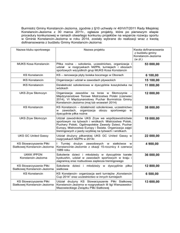 Burmistrz Gminy Konstancin-Jeziorna, zgodnie z §10 uchwały nr 40/VI/7/2011 Rady Miejskiej Konstancin-Jeziorna z 30 marca 2011r., ogłasza projekty, które po pierwszym etapie procedury konkursowej w ramach otwartego konkursu projektów na wsparcie rozwoju sportu w Gminie Konstancin-Jeziorna w roku 2014, zostały wybrane do realizacji wraz z kwotą dofinansowania z budżetu Gminy Konstancin-Jeziorna: Nazwa klubu sportowego Nazwa projektu MUKS Kosa Konstancin Piłka nożna - szkolenia, uczestnictwo, organizacja i udział w rozgrywkach MZPN, turniejach i obozach sportowych wszystkich grup MUKS Kosa Konstancin Kwota dofinansowania z budżetu gminy Konstancin-Jeziorna (w zł.) 53 000,00 6 100,00 KS Konstancin KS – renowacja płyty boiska bocznego w Oborach IKS Konstancin Organizacja i udział w zawodach pływackich 15 100,00 IKS Konstancin Działalność szkoleniowa w dyscyplinie koszykówka na wózkach 11 000,00 UKS Zryw Słomczyn Organizacja zawodów na torze w Słomczynie – Międzynarodowe Torowe Mistrzostwa Polski (czerwiec 2014), VI Międzynarodowy Puchar Burmistrza Gminy Konstancin-Jeziorna (maj lub wrzesień 2014) 12 000,00 KS Konstancin KS Konstancin – działalność szkoleniowa, uczestnictwo w zawodach, organizacja obozu sportowego w dyscyplinie piłka nożna 38 000,00 UKS Zryw Słomczyn Udział zawodników UKS Zryw we współzawodnictwie sportowym na łyżwach i wrotkach: Mistrzostwa Polski, Puchary Polski, Ogólnopolskie Zawody Dzieci, Puchar Europy, Mistrzostwa Europy i Świata. Organizacja zajęć treningowych z jazdy szybkiej na łyżwach i wrotkach. 19 000,00 UKS GC United Gassy Udział drużyny piłkarskiej UKS GC United Gassy w rozgrywkach MZPN w 2014r. 22 000,00 KS Stowarzyszenie Piłki I Turniej drużyn zawodowych w siatkówce w Siatkowej Konstancin-Jeziorna Konstancinie-Jeziornie z okazji 15-rocznicy 4 czerwca 1989 roku 4 900,00 Szkolenie dzieci i młodzieży w dyscyplinie karate kyokushin, udział w zawodach sportowych w kraju i zagranicą oraz rozbudowa zaplecza treningowego 36 000,00 KS Stowarzyszenie Piłki Szkolenie dzieci i młodzieży w dyscyplinie piłka Siatkowej Konstancin-Jeziorna siatkowa 12 800,00 UKKK IPPON Konstancin-Jeziorna KS Konstancin KS Konstancin- organizacja serii turniejów „Konstancin Cup 2014” oraz uczestnictwo w innych turniejach KS Stowarzyszenie Piłki Udział drużyny KS Stowarzyszenie Piłki Siatkowej Siatkowej Konstancin-Jeziorna Konstancin-Jeziorna w rozgrywkach III ligi WarszawskoMazowieckiego Związku Piłki Siatkowej 6 500,00 13 600,00