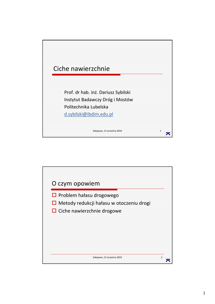 Ciche nawierzchnie Prof. dr hab. inż. Dariusz Sybilski Instytut Badawczy Dróg i Mostów Politechnika Lubelska [email protected] Zakopane, 15 września 2010 1 O czym opowiem Problem hałasu drogowego Metody redukcji hałasu w otoczeniu drogi Ciche nawierzchnie drogowe Zakopane, 15 września 2010 2 1 Problem hałasu w Europie 55 dB(A) ‐ dźwięk nieprzyjemny 65 dB(A) ‐ 65 dB(A) dź dźwięk nie do zniesienia, np. poważne i k i d i i i ż zakłócenia snu 80 mln Europejczyków cierpi wskutek niedopuszczalnego natężenia hałasu 170 milionów Europejczyków żyje w „szarej strefie” dokuczliwości hałasu 38 mld euro rocznie ‐ 38 ld i szkody ekonomiczne z k d k i powodu hałasu w UE (zakłócenia snu, utrata efektywności pracy, spadek wartości nieruchomości) Zakopane, 15 września 2010 3 Hałas Każdy dźwięk, niezależnie od jego sposobu powstawania, głośności i czasu trwania, który powoduje dyskomfort psychiczny lub jest odczuwany jako uciążliwość Zakopane, 15 września 2010 4 2 Metody zmniejszenia hałasu ruchu pojazdów Zmniejszenie natężenia ruchu Ograniczenie prędkości ruchu Graniczna prędkość 55 km/h, samochody Ściany dźwiękochłonne Ciche nawierzchnie Asfalt porowaty Dwuwarstwowe nawierzchnie porowate D t i h i t Drobnoziarnista mieszanka o nieciągłym uziarnieniu (SMA, BBTM – MNU) Mieszanka modyfikowana gumą Zakopane, 15 września 2010 5 Hałas drogowy Przyczyny Interakcja opona‐nawierzchnia Dźwięki pojazdu Silnik System napędowy System wydechowy Zakopane, 15 września 2010 6 3 Zakopane, 15 września 2010 7 Hałas drogowy Kontakt opony z nawierzchnią jest głównym źródłem hałasu większości samochodów przy prędkości powyżej 55 km/h samochodów ciężarowych przy prędkości powyżej 70 km/h Zakopane, 15 września 2010 8 4 Ciche nawierzchnie drogowe Powstawanie hałasu: Zwiększenie szerokości opony o 10 mm powoduje wzrost hałasu od 0,2 do 0,4 dB(A) Szorstkość nawierzchni – również bardzo gładkie nawierzchnie mogą być powodem powstawania hałasu Szybkie tłoczenie i rozprężanie powietrza w miejscu S bki ł i i ż i i i j kontaktu opony z nawierzchnią Zakopane, 15 września 2010 9 To nie jest cicha nawierzchnia Zakopane, 15 września 2010 10 5 Zakopane, 15 września 2010 Zakopane, 15 września 2010 P o w ie rz c h n io w e u trw a le n ie B e to n c e m e n to w y B e to n a s fa lto w y B e to n a s fa lto w y p o ro w a ty C ie n k a w a rs ttw a a s fa lto w a M N U 0 /1 0 C ie n k a w a rs ttw a a s fa lto w a M N U 0 /6 C ic h a n a w ie rz c h n ia a s fa lto w a H a ła s , d B (A ) Asfalt porowaty 11 Hałaśliwość: wpływ nawierzchni 90 80 70 60 12 6 Beton asfaltowy porowaty Zmniejszenie j hałasu o 3 dB(A) ( ) jest j równoważne: lub 100 km/h 80 km/h Cicha nawierzchnia jest równoważna ścianie dźwiękochłonnej Zakopane, 15 września 2010 13 Przegrody Akustyczne: Ekrany dźwiękochłonne Zakopane, 15 września 2010 14 7 Przegrody Akustyczne: Przekrycia akustyczne Zakopane, 15 września 2010 15 Przegrody akustyczne: Wały ziemne i przekopy Zakopane, 15 września 2010 16 8 Przegrody akustyczne: Zieleń izolacyjna Zakopane, 15 września 2010 17 Przegrody akustyczne: Zieleń izolacyjna Zakopane, 15 września 2010 18 9 Szwajcaria, Bazylea Zakopane, 15 września 2010 19 Redukcja hałasu tramwajowego Zakopane, 15 września 2010 20 10 Redukcja hałasu tramwajowego Zakopane, 15 września 2010 21 Redukcja hałasu tramwajowego Zakopane, 15 września 2010 22 11 Ciche nawierzchnie drogowe Zakopane, 15 września 2010 23 Klasyfikacja hałaśliwości nawierzchni we Francji Kategoria R1 Cicha R2 R3 3 R4 Głośna Rodzaj nawierzchni BBTM 6 BBUTM 6 PA 10 BBTM 10 AC 10 CWZ BBUTM 10 Beton cementowy BBTM 14 1 AC 14 Bruk kamienny Kostka kamienna lub betonowa. Zakopane, 15 września 2010 24 12 Klasyfikacja hałaśliwości nawierzchni, IBDiM, 2005 Klasa hałaśliwości h ł śli ś i nawierzchni W t ś i l Warstwa ścieralna nawierzchni i h i Cicha AC (BA) 5 lub AC 8 SMA 5, SMA 8 BBTM (MNU) 8 (GUFI) PA (asfalt porowaty) Normalna ( ) BBTM (MNU) 11 SMA 11 BA 11 Głośna BC (beton cementowy) CWZ (cienka warstwa na zimno) Zakopane, 15 września 2010 25 Asfalt porowaty Zwiększenie zawartości wolnych przestrzeni w asfalcie porowatym z 15‐18 porowatym z 15 18 % v/v do co najmniej 22 do co najmniej 22 % v/v pozwala na pozwala na redukcję hałasu samochodów osobowych o około ‐6,5 dB (A) i ciężarowych o około ‐4,5 dB (A) Układ dwóch warstw asfaltu porowatego zmniejsza hałas drogowy o dodatkowe około 2 dB (A) Układ dwuwarstwowy – zmniejszenie hałasu drogowego o 8‐ 10 dB(A) Uwaga: warstwa nawierzchni (podłoże) pod asfaltem porowatym musi być uszczelniona membraną asfaltową t ib ć l i b f lt skropienie asfaltem 2‐3 kg/m2 lub rolowa membrana asfaltowa zbrojona siatką szklaną Zakopane, 15 września 2010 26 13 Ciche nawierzchnie ‐ możliwości stosowania w Polsce Asfalt porowaty: Trudniejsze zimowe utrzymanie Mniejsza trwałość (średnio 8 lat, szczelna warstwa 10 lat) Zakopane, 15 września 2010 27 Ciche nawierzchnie ‐ możliwości stosowania w Polsce Asfalt porowaty: Układ dwuwarstwowy Większa efektywność (zmniejszenie hałasu nawet o 10 dB(A) Mniejsze problemy zimowego utrzymania Lepsze odwodnienie Mniejsze zanieczyszczenie Mniejsze zanieczyszczenie Zakopane, 15 września 2010 28 14 Ciche nawierzchnie ‐ możliwości stosowania w Polsce Szczelne mieszanki o nieciągłym uziarnieniu, np. SMA 5, SMA 8, BBTM 8 Mieszanki z dodatkiem gumy Granulat gumowy (GUFI) Nowa technologia – tecROAD: granulat gumowo‐ asfaltowy Zakopane, 15 września 2010 29 Asfalt porowaty Zakopane, 15 września 2010 30 15 Asfalt porowaty Zakopane, 15 września 2010 31 Nawierzchnie prefabrykowane Zakopane, 15 września 2010 32 16 Nawierzchnie prefabrykowane Zakopane, 15 września 2010 33 Ciche nawierzchnie modyfikowane gumą Zakopane, 15 września 2010 34 17 Bilans odpadów gumowych w Polsce 140000 120000 Opony Masa, Mg 10000