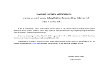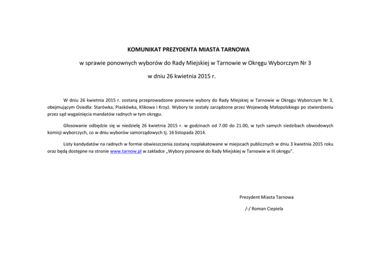 KOMUNIKAT PREZYDENTA MIASTA TARNOWA w sprawie ponownych wyborów do Rady Miejskiej w Tarnowie w Okręgu Wyborczym Nr 3 w dniu 26 kwietnia 2015 r. W dniu 26 kwietnia 2015 r. zostaną przeprowadzone ponowne wybory do Rady Miejskiej w Tarnowie w Okręgu Wyborczym Nr 3, obejmującym Osiedla: Starówka, Piaskówka, Klikowa i Krzyż. Wybory te zostały zarządzone przez Wojewodę Małopolskiego po stwierdzeniu przez sąd wygaśnięcia mandatów radnych w tym okręgu. Głosowanie odbędzie się w niedzielę 26 kwietnia 2015 r. w godzinach od 7.00 do 21.00, w tych samych siedzibach obwodowych komisji wyborczych, co w dniu wyborów samorządowych tj. 16 listopada 2014. Listy kandydatów na radnych w formie obwieszczenia zostaną rozplakatowane w miejscach publicznych w dniu 3 kwietnia 2015 roku oraz będą dostępne na stronie www.tarnow.pl w zakładce „Wybory ponowne do Rady Miejskiej w Tarnowie w III okręgu”. Prezydent Miasta Tarnowa /-/ Roman Ciepiela