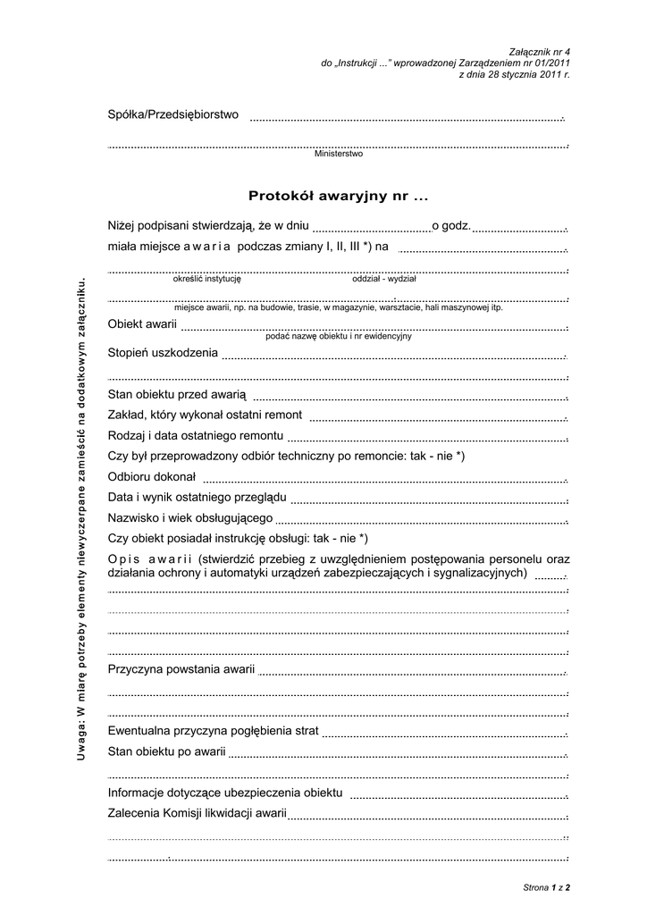 Załącznik nr 4 do „Instrukcji ...” wprowadzonej Zarządzeniem nr 01/2011 z dnia 28 stycznia 2011 r. Spółka/Przedsiębiorstwo . . Ministerstwo Protokół awaryjny nr … Niżej podpisani stwierdzają, że w dniu o godz. miała miejsce a w a r i a podczas zmiany I, II, III *) na . . . określić instytucję oddział - wydział . . miejsce awarii, np. na budowie, trasie, w magazynie, warsztacie, hali maszynowej itp. Obiekt awarii . podać nazwę obiektu i nr ewidencyjny Stopień uszkodzenia . . Stan obiektu przed awarią . Zakład, który wykonał ostatni remont . Rodzaj i data ostatniego remontu . Czy był przeprowadzony odbiór techniczny po remoncie: tak - nie *) Odbioru dokonał . Data i wynik ostatniego przeglądu . Nazwisko i wiek obsługującego . Czy obiekt posiadał instrukcję obsługi: tak - nie *) O p i s a w a r i i (stwierdzić przebieg z uwzględnieniem postępowania personelu oraz działania ochrony i automatyki urządzeń zabezpieczających i sygnalizacyjnych) . . . . . Przyczyna powstania awarii . . . Ewentualna przyczyna pogłębienia strat . Stan obiektu po awarii . . Informacje dotyczące ubezpieczenia obiektu . Zalecenia Komisji likwidacji awarii . .. . . Strona 1 z 2 Awaria powstała z winy: personelu - ruchowego - kierowniczego - remontowego dostawcy - przedsiębiorstw montażowych - w następstwie działania żywiołów - osób postronnych *), inne . . określić z czyjej winy Osoby, które zawiniły: a) w powstaniu awarii . . b) w pogłębieniu strat . . . . nazwisko i imię funkcja Straty na skutek awarii: a) koszt roboczo-godz. przestojów płatnych .zł b) straty w środkach trwałych .zł c) straty w środkach obrotowych .zł d) ogólna suma strat (a + b + c) zł e) wartość niewykonanej produkcji w okresie sprawozdawczym po cenach zbytu % rozbicia strat na poszczególnych winnych: .zł z punktu d) . z punktu e) . Wnioski Komisji w stosunku do winnych . . . Wnioski, sposoby i środki zapobiegawcze powzięte przez Komisje, zabezpieczające przed powtórzeniem się w przyszłości podobnych awarii: . . .. .. Komisja poawaryjna: . . . . . . . . . . . . . . . (Imię i nazwisko) (stanowisko) (podpis) AKCEPTACJA ……………………………. Prezes Zarządu/Członek Zarządu Gdynia, dnia 201 r. *) niepotrzebne skreślić Strona 2 z 2