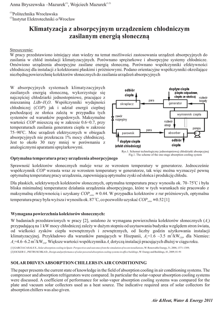 Anna Bryszewska –Mazurek(1), Wojciech Mazurek(1,2) (1) Politechnika Wrocławska (2) Instytut Elektrotechniki o/Wrocław Klimatyzacja z absorpcyjnym urządzeniem chłodniczym zasilanym energią słoneczną Streszczenie: W pracy przedstawiono istniejący stan wiedzy na temat możliwości zastosowania urządzeń absorpcyjnych do zasilania w chłód instalacji klimatyzacyjnych. Porównano sprężarkowe i absorpcyjne systemy chłodnicze. Omówiono urządzenia absorpcyjne zasilane energią słoneczną. Porównano współczynniki efektywności chłodniczej dla instalacji z kolektorami płaskimi i próżniowymi. Podano orientacyjne współczynniki określające niezbędną powierzchnię kolektorów słonecznych do zasilania urządzeń absorpcyjnych W absorpcyjnych systemach klimatyzacyjnych zasilanych energią słoneczną, wykorzystuje się najczęściej chłodziarki jednostopniowe, pracujące z mieszaniną LiBr-H2O. Współczynniki wydajności chłodniczej (COP) jak i udział energii cieplnej pochodzącej ze słońca zależą w przypadku tych systemów od warunków pogodowych. Maksymalne wartości COP mieszczą się w zakresie 0.6÷0.7, przy temperaturach zasilania generatora ciepła w zakresie o 75–90 C. Moc urządzeń elektrycznych w obiegach absorpcyjnych nie przekracza 1% mocy chłodniczej. Jest to około 30 razy mniej w porównaniu z analogicznymi aparatami sprężarkowymi. Rys.1. Schemat technologiczny jednostopniowej chłodziarki absorpcyjnej Fig.1. The scheme of the one-stage absorption cooling system Optymalna temperatura pracy urządzenia absorpcyjnego Sprawność kolektorów słonecznych maleje wraz ze wzrostem temperatury w generatorze. Jednocześnie współczynnik COP wzrasta wraz ze wzrostem temperatury w generatorze, tak więc można wyznaczyć pewną optymalną temperaturę pracy urządzenia, zapewniającą optymalne zyski od słońca i produkcję chłodu. o Dla płaskich, selektywnych kolektorów słonecznych, optymalna temperatura pracy wynosiła ok. 70–75 C i była bliska minimalnej temperaturze działania urządzenia absorpcyjnego, które w tych warunkach nie pracowało z maksymalną efektywnością i uzyskany COPsolar ≈ 0.44. W przypadku kolektorów z rur próżniowych, optymalna temperatura pracy była wyższa i wynosiła ok. 87 oC, co pozwoliło uzyskać COPsolar ≈0.52 [1] Wymagana powierzchnia kolektorów słonecznych: W badaniach przedstawionych w pracy [2], ustalono że wymagana powierzchnia kolektorów słonecznych (As) przypadającą na 1 kW mocy chłodniczej zależy w dużym stopniu od usytuowania budynku względem stron świata, od wielkości zysków ciepła wewnętrznych i zewnętrznych, od liczby godzin użytkowania instalacji klimatyzacyjnej. Przykładowo dla warunków panujących w Hiszpanii, As=1.6 –3.5 m2/kWCH, dla Niemiec: As=4.6–6.2 m2/kWCH. Większe wartości współczynnika As dotyczą instalacji pracujących dłużej w ciągu roku. [1] GARCIACASALS X., Solar absorption cooling in Spain: Perspectives and outcomes from the simulation of recent installations, W: Renewable Energy, 31, 2006, 1371-1389; [2] EICKER U., PIETRUSCHKAD., Design and performance of solar powered absorption cooling systems in office buildings, W: Energy and Buildings, 41, 2009, 81-91 SOLAR DRIVENABSORPTION CHILLERS INAIR CONDITIONING The paper presents the current state of knowledge in the field of absorption cooling in air conditioning systems. The compressor and absorption refrigerators were compared. In particular the solar-vapour absorption cooling systems were discussed. A coefficient of performance for solar-vapor absorption cooling systems was compared for the plate and vacuum solar collectors used as a heat source. The indicative required area of solar collectors for absorption chillers was also given. Air &Heat, Water & Energy 2011