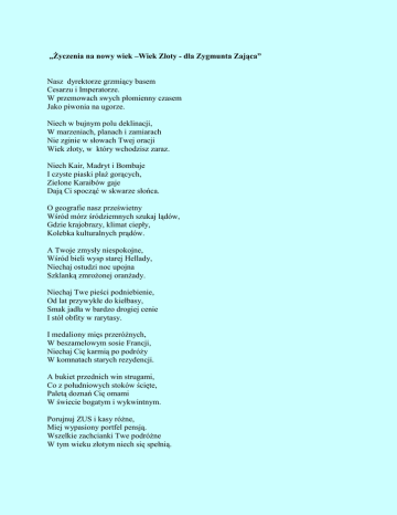 „Życzenia na nowy wiek –Wiek Złoty - dla Zygmunta Zająca” Nasz dyrektorze grzmiący basem Cesarzu i Imperatorze. W przemowach swych płomienny czasem Jako piwonia na ugorze. Niech w bujnym polu deklinacji, W marzeniach, planach i zamiarach Nie zginie w słowach Twej oracji Wiek złoty, w który wchodzisz zaraz. Niech Kair, Madryt i Bombaje I czyste piaski plaż gorących, Zielone Karaibów gaje Dają Ci spocząć w skwarze słońca. O geografie nasz prześwietny Wśród mórz śródziemnych szukaj lądów, Gdzie krajobrazy, klimat ciepły, Kolebka kulturalnych prądów. A Twoje zmysły niespokojne, Wśród bieli wysp starej Hellady, Niechaj ostudzi noc upojna Szklanką zmrożonej oranżady. Niechaj Twe pieści podniebienie, Od lat przywykłe do kiełbasy, Smak jadła w bardzo drogiej cenie I stół obfity w rarytasy. I medaliony mięs przeróżnych, W beszamelowym sosie Francji, Niechaj Cię karmią po podróży W komnatach starych rezydencji. A bukiet przednich win strugami, Co z południowych stoków ścięte, Paletą doznań Cię omami W świecie bogatym i wykwintnym. Porujnuj ZUS i kasy różne, Miej wypasiony portfel pensją. Wszelkie zachcianki Twe podróżne W tym wieku złotym niech się spełnią. A Twoje ciało ciepłolubne Niechaj ogrzewa Kalifornia. Katary, przeziębienia zgubne Niech ulatują jak dym z ognia. Byś w swych podróżach nieustannych Tak zwodził, gubił strefy czasu, Byś przeżył dwieście lat wspaniałych Od Australii do Donbasu. Po mięsach, winach i cytrusach Tę jedną radę Tobie kładę, Abyś bez przerwy miał w kieszeni Ranigast na palącą zgagę. Pisane w Żabnie, dnia 29.06.2006