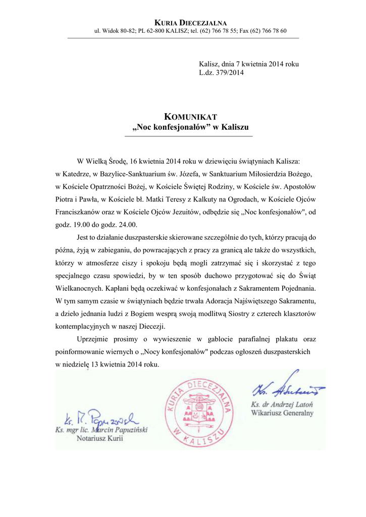KURIA DIECEZJALNA ul. Widok 80-82; PL 62-800 KALISZ; tel. (62) 766 78 55; Fax (62) 766 78 60 Kalisz, dnia 7 kwietnia 2014 roku L.dz. 379/2014 KOMUNIKAT „Noc konfesjonałów” w Kaliszu W Wielką Środę, 16 kwietnia 2014 roku w dziewięciu świątyniach Kalisza: w Katedrze, w Bazylice-Sanktuarium św. Józefa, w Sanktuarium Miłosierdzia Bożego, w Kościele Opatrzności Bożej, w Kościele Świętej Rodziny, w Kościele św. Apostołów Piotra i Pawła, w Kościele bł. Matki Teresy z Kalkuty na Ogrodach, w Kościele Ojców Franciszkanów oraz w Kościele Ojców Jezuitów, odbędzie się „Noc konfesjonałów", od godz. 19.00 do godz. 24.00. Jest to działanie duszpasterskie skierowane szczególnie do tych, którzy pracują do późna, żyją w zabieganiu, do powracających z pracy za granicą ale także do wszystkich, którzy w atmosferze ciszy i spokoju będą mogli zatrzymać się i skorzystać z tego specjalnego czasu spowiedzi, by w ten sposób duchowo przygotować się do Świąt Wielkanocnych. Kapłani będą oczekiwać w konfesjonałach z Sakramentem Pojednania. W tym samym czasie w świątyniach będzie trwała Adoracja Najświętszego Sakramentu, a dzieło jednania ludzi z Bogiem wesprą swoją modlitwą Siostry z czterech klasztorów kontemplacyjnych w naszej Diecezji. Uprzejmie prosimy o wywieszenie w gablocie parafialnej plakatu oraz poinformowanie wiernych o „Nocy konfesjonałów" podczas ogłoszeń duszpasterskich w niedzielę 13 kwietnia 2014 roku.