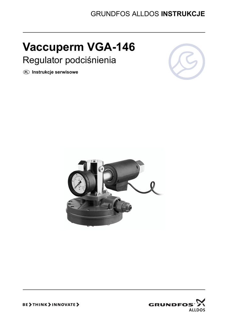 GRUNDFOS ALLDOS INSTRUKCJE Vaccuperm VGA-146 Regulator podciśnienia Instrukcje serwisowe TREŚĆ 1. 1.1 1.2 1.3 1.4 1.5 1.6 1.7 2. 2.1 2.2 2.3 3. 3.1 3.2 3.3 4. 4.1 4.2 5. 5.1 5.2 5.3 Informacje ogólne ............................................................................................................. 3 Struktura dokumentacji .....................................................................................................................3 Informacje na temat instrukcji ...........................................................................................................3 Użytkownicy/grupa docelowa ............................................................................................................3 Odpowiedzialność operatora.............................................................................................................4 Personel wykonujący serwis i konserwację .......................................................................................4 Właściwe użytkowanie ......................................................................................................................4 Niewłaściwe użytkowanie..................................................................................................................4 Dane techniczne ................................................................................................................ 5 Klucz typu VGA-146..........................................................................................................................5 Dane ogólne .....................................................................................................................................5 Rysunki wymiarowane ......................................................................................................................7 Montaż ............................................................................................................................... 8 Transport i przechowywanie .............................................................................................................8 Rozpakowywanie ..............................................................................................................................8 Mocowanie .......................................................................................................................................8 Przekazanie do eksploatacji ............................................................................................. 9 Przygotowanie do przekazania do eksploatacji .................................................................................9 Czynności sprawdzające przed przekazaniem do eksploatacji ........................................................10 Konserwacja .................................................................................................................... 11 Możliwe usterki ...............................................................................................................................12 Demontaż i czyszczenie regulatora podciśnienia ............................................................................13 Zestawy części zamiennych regulatora podciśnienia VGA-146 .......................................................17 2 / 20 Ostrzeżenie Niniejsze instrukcje obsługi są dostępne również w witrynie www.Grundfosalldos.com. Przed montażem należy przeczytać te instrukcje montażu i obsługi. Montaż i obsługa musi odbywać się zgodnie z lokalnymi przepisami i zatwierdzonymi kodeksami dobrych praktyk. 1. Informacje ogólne 1.1 Struktura dokumentacji Regulator podciśnienia VGA-146 firmy Grundfos Alldos jest najnowocześniejszym rozwiązaniem, zgodnym z uznawanymi przepisami dotyczącymi bezpieczeństwa. Zgodność z odpowiednimi standardami, dyrektywami i ustawami została zweryfikowana. Niemniej jednak użytkowanie systemu związane jest z pewnymi niebezpieczeństwami, którym producent nie może zapobiec. Cel niniejszej instrukcji: • Poinformowanie użytkowników o optymalnym sposobie użytkowania. • Ostrzeżenie użytkowników przed potencjalnymi ryzykami szczątkowymi występującymi podczas prawidłowego użytkowania i określenie środków, które należy podjąć, aby uniknąć uszkodzeń. • Ostrzeżenie użytkowników przed oczywistym złym lub niewłaściwym użytkowaniem i poinformowanie ich o niezbędnych środkach ostrożności, które należy podjąć podczas obsługi systemu. 1.2 Informacje na temat instrukcji Niniejsza instrukcja zawiera następujące znormalizowane instrukcje bezpieczeństwa dotyczące potencjalnych ryzyk szczątkowych: Ostrzeżenie Nieprzestrzeganie tych instrukcji bezpieczeństwa może spowodować obrażenia ciała! UWAGA RADA Nieprzestrzeganie tych instrukcji bezpieczeństwa może spowodować nieprawidłowe działanie lub uszkodzenie urządzenia! Uwagi lub instrukcje ułatwiające pracę i zapewniające bezpieczeństwo obsługi. Informacje dotyczące potencjalnych ryzyk szczątkowych podano: • Na znakach ostrzegawczych umieszczonych w miejscu zamontowania. • Na początku poszczególnych rozdziałów niniejszej instrukcji. • Bezpośrednio przed każdą procedurą obsługi, która może wiązać się z ryzykami szczątkowymi. 1.3 Użytkownicy/grupa docelowa Użytkownicy to osoby odpowiedzialne za obsługę i monitorowanie urządzenia VGA-146 w miejscu zamontowania. System może być obsługiwany wyłącznie przez wyszkolony i wykwalifikowany personel. Personel musi posiadać odpowiednią wiedzę techniczną i znać podstawowe zasady technologii pomiarów i kontroli. 1.3.1 Odpowiedzialność użytkowników Użytkownicy są odpowiedzialni za to, aby: • Przeczytać niniejszą instrukcję przed rozpoczęciem obsługi urządzenia VGA-146. • Uczestniczyć w prowadzonym przez wykwalifikowany personel firmy Grundfos Alldos szkoleniu dotyczącym obsługi systemu. • Przestrzegać uznawanych przepisów do