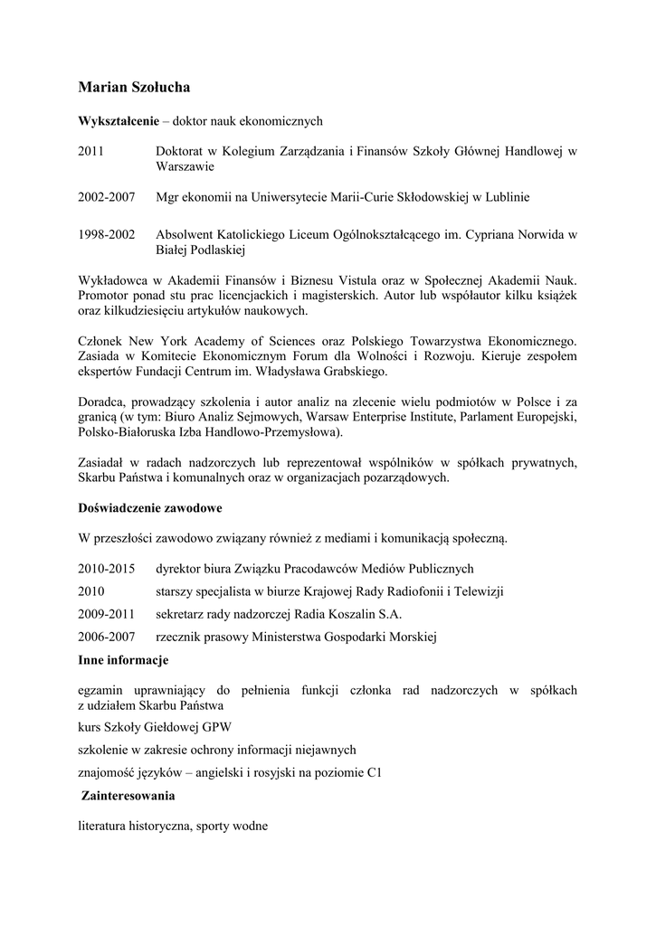Marian Szołucha Wykształcenie – doktor nauk ekonomicznych 2011 Doktorat w Kolegium Zarządzania i Finansów Szkoły Głównej Handlowej w Warszawie 2002-2007 Mgr ekonomii na Uniwersytecie Marii-Curie Skłodowskiej w Lublinie 1998-2002 Absolwent Katolickiego Liceum Ogólnokształcącego im. Cypriana Norwida w Białej Podlaskiej Wykładowca w Akademii Finansów i Biznesu Vistula oraz w Społecznej Akademii Nauk. Promotor ponad stu prac licencjackich i magisterskich. Autor lub współautor kilku książek oraz kilkudziesięciu artykułów naukowych. Członek New York Academy of Sciences oraz Polskiego Towarzystwa Ekonomicznego. Zasiada w Komitecie Ekonomicznym Forum dla Wolności i Rozwoju. Kieruje zespołem ekspertów Fundacji Centrum im. Władysława Grabskiego. Doradca, prowadzący szkolenia i autor analiz na zlecenie wielu podmiotów w Polsce i za granicą (w tym: Biuro Analiz Sejmowych, Warsaw Enterprise Institute, Parlament Europejski, Polsko-Białoruska Izba Handlowo-Przemysłowa). Zasiadał w radach nadzorczych lub reprezentował wspólników w spółkach prywatnych, Skarbu Państwa i komunalnych oraz w organizacjach pozarządowych. Doświadczenie zawodowe W przeszłości zawodowo związany również z mediami i komunikacją społeczną. 2010-2015 dyrektor biura Związku Pracodawców Mediów Publicznych 2010 starszy specjalista w biurze Krajowej Rady Radiofonii i Telewizji 2009-2011 sekretarz rady nadzorczej Radia Koszalin S.A. 2006-2007 rzecznik prasowy Ministerstwa Gospodarki Morskiej Inne informacje egzamin uprawniający do pełnienia funkcji członka rad nadzorczych w spółkach z udziałem Skarbu Państwa kurs Szkoły Giełdowej GPW szkolenie w zakresie ochrony informacji niejawnych znajomość języków – angielski i rosyjski na poziomie C1 Zainteresowania literatura historyczna, sporty wodne