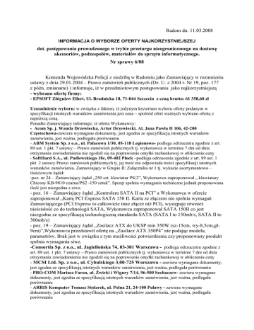 Radom dn. 11.03.2008 INFORMACJA O WYBORZE OFERTY NAJKORZYSTNIEJSZEJ dot. postępowania prowadzonego w trybie przetargu nieograniczonego na dostawę akcesoriów, podzespołów, materiałów do sprzętu informatycznego. Nr sprawy 6/08 Komenda Wojewódzka Policji z siedzibą w Radomiu jako Zamawiający w rozumieniu ustawy z dnia 29.01.2004 – Prawo zamówień publicznych (Dz. U. z 2004 r. Nr 19, poz. 177 z późn. zmianami) ) informuje, iŜ w przedmiotowym postępowaniu jako najkorzystniejszą - wybrano ofertę firmy: - EPSOFT Zbigniew Ellert, Ul. Brodnicka 18, 71-044 Szczecin z ceną brutto: 61 358,60 zł Uzasadnienie wyboru: w związku z faktem, iŜ jedynym kryterium wyboru oferty podanym w specyfikacji istotnych warunków zamówienia jest cena – spośród ofert waŜnych wybrano ofertę z najniŜszą ceną. Ponadto Zamawiający informuje, iŜ oferta Wykonawcy: - Acom Sp. j. Wanda Drzewiecka, Artur Drzewiecki, Al. Jana Pawła II 106, 42-200 Częstochowa-zawiera wymagane dokumenty, jest zgodna ze specyfikacją istotnych warunków zamówienia, jest waŜna, podlegała porównaniu - ABM System Sp. z o.o., ul. Pałacowa 1/30, 05-118 Legionowo- podlega odrzuceniu zgodnie z art. 89 ust. 1 pkt. 7 ustawy – Prawo zamówień publicznych tj. wykonawca w terminie 7 dni od dnia otrzymania zawiadomienia nie zgodził się na poprawienie omyłki rachunkowej w obliczeniu ceny - SoftHard S.A., ul. Padlewskiego 18c, 09-402 Płock –podlega odrzuceniu zgodnie z art. 89 ust. 1 pkt. 2 ustawy Prawo zamówień publicznych tj. jej treść nie odpowiada treści specyfikacji istotnych warunków zamówienia. Zamawiający w Grupie II: Załączniku nr 1 tj. wykazie asortymentowo – ilościowym Ŝądał: -poz. nr 24 – Zamawiający Ŝądał „250 szt. klawiatur PS/2”, Wykonawca zaproponował „ klawiatury Chicony KB-9810 czarna/PS2 -150 sztuk”. Sprzęt spełnia wymagania techniczne jednak proponowana ilość jest niezgodna z siwz. - poz. 16 – Zamawiający Ŝądał „Kontrolera SATA II na PCI” a Wykonawca w ofercie zaproponował „Kartę PCI Express SATA 150 II. Karta ze złączem nie spełnia wymagań Zamawiającego (PCI Express to całkowicie inne złącze niŜ PCI), występuje równieŜ nieścisłość co do technologii SATA, Wykonawca zaproponował SATA 150II co jest niezgodne ze specyfikacją technologiczną standardu SATA (SATA I to 150mb/s, SATA II to 300mb/s) - poz. 19 – Zamawiający Ŝądał „Zasilacz ATX do UKSP min 350W (sz-15cm, wy-8,5cm,gł9cm)”,Wykonawca przedstawił ofertę na „Zasilacz ATX 350P4” nie podając modelu, parametrów. Brak jest w związku z tym moŜliwości potwierdzenia czy proponowany produkt spełnia wymagania siwz. -Consortia Sp. z o.o., ul. Jagiellońska 74, 03-301 Warszawa - podlega odrzuceniu zgodnie z art. 89 ust. 1 pkt. 7 ustawy – Prawo zamówień publicznych tj. wykonawca w terminie 7 dni od dnia otrzymania zawiadomienia nie zgodził się na poprawienie omyłki rachunkowej w obliczeniu ceny - MCSI Ltd. Sp. z o.o., ul. Cybulskiego 3,00-725 Warszawa - zawiera wymagane dokumenty, jest zgodna ze specyfikacją istotnych warunków zamówienia, jest waŜna, podlegała porównaniu - PRO-COM Mariusz Faron, ul. świrki i Wigury 7/14, 96-500 Sochaczew- zawiera wymagane dokumenty, jest zgodna ze specyfikacją istotnych warunków zamówienia, jest waŜna, podlegała porównaniu - ARRIS Komputer Tomasz Stolarek, ul. Polna 21, 24-100 Puławy - zawiera wymagane dokumenty, jest zgodna ze specyfikacją istotnych warunków zamówienia, jest waŜna, podlegała porównaniu - CEZAR Cezary Machnio, ul. Kościuszki 1, 26-600 Radom - zawiera wymagane dokumenty, jest zgodna ze specyfikacją istotnych warunków zamówienia, jest waŜna, podlegała porównaniu - FORTI Krzysztof Jurek, ul. Sienkiewicz 11/2, 26-600 Radom - zawiera wymagane dokumenty, jest zgodna ze specyfikacją istotnych warunków zamówienia, jest waŜna, podlegała porównaniu -WARNET II s.c. Norbert Pobereszko, Marek Staszewski, ul. Witolda 6/8 paw.17, 26-610 Radom- podlega odrzuceniu zgodnie z art. 89 ust. 1 pkt. 7 ustawy – Prawo zamówień publicznych tj. wykonawca w terminie 7 dni od dnia otrzymania zawiadomienia nie zgodził się na poprawienie omyłki rachunkowej w obliczeniu ceny. PORÓWNANIE OFERT WAśNYCH Nazwa Wykonawcy ACOM Sp.j. EPSOFT MCSI Ltd. Sp. z o.o PRO-COM ARRIS Komputer CEZAR FORTI Wartość brutto w zł 68 756,63 61 358,60 65 340,03 81 318,00 68 679,11 69 927,00 69 529,00
