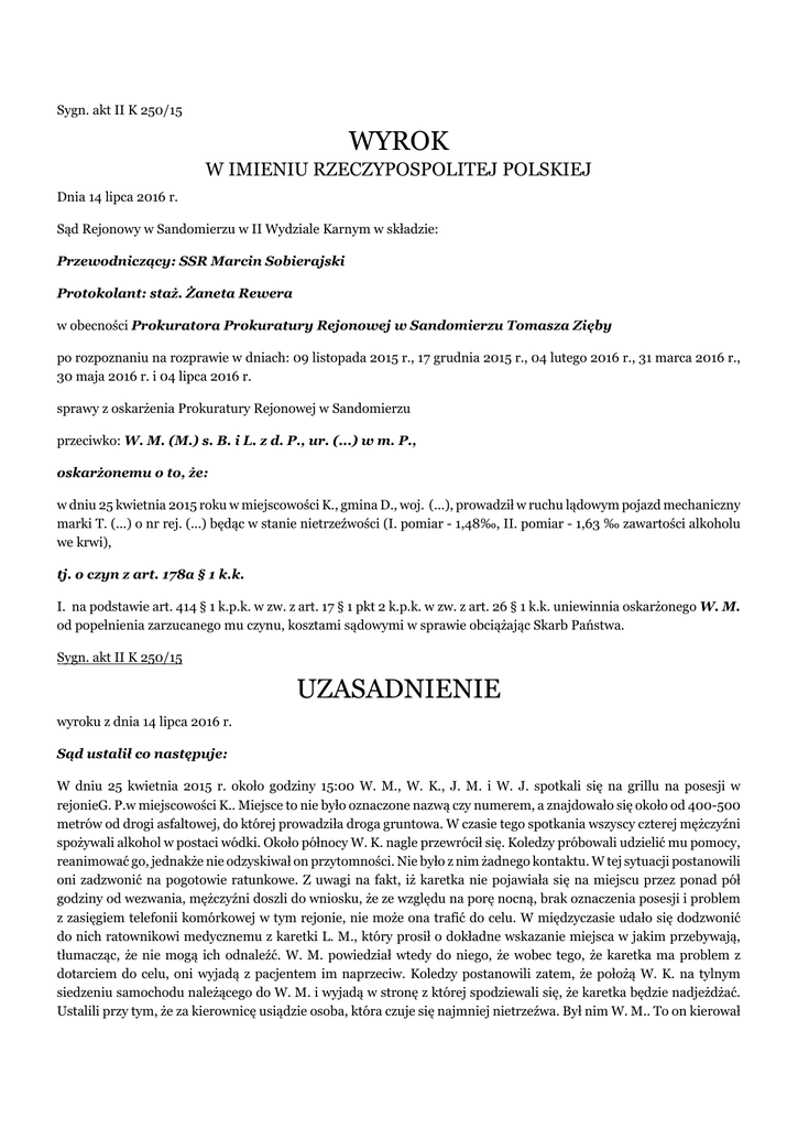 Sygn. akt II K 250/15 WYROK W IMIENIU RZECZYPOSPOLITEJ POLSKIEJ Dnia 14 lipca 2016 r. Sąd Rejonowy w Sandomierzu w II Wydziale Karnym w składzie: Przewodniczący: SSR Marcin Sobierajski Protokolant: staż. Żaneta Rewera w obecności Prokuratora Prokuratury Rejonowej w Sandomierzu Tomasza Zięby po rozpoznaniu na rozprawie w dniach: 09 listopada 2015 r., 17 grudnia 2015 r., 04 lutego 2016 r., 31 marca 2016 r., 30 maja 2016 r. i 04 lipca 2016 r. sprawy z oskarżenia Prokuratury Rejonowej w Sandomierzu przeciwko: W. M. (M.) s. B. i L. z d. P., ur. (...) w m. P., oskarżonemu o to, że: w dniu 25 kwietnia 2015 roku w miejscowości K., gmina D., woj. (...), prowadził w ruchu lądowym pojazd mechaniczny marki T. (...) o nr rej. (...) będąc w stanie nietrzeźwości (I. pomiar - 1,48‰, II. pomiar - 1,63 ‰ zawartości alkoholu we krwi), tj. o czyn z art. 178a § 1 k.k. I. na podstawie art. 414 § 1 k.p.k. w zw. z art. 17 § 1 pkt 2 k.p.k. w zw. z art. 26 § 1 k.k. uniewinnia oskarżonego W. M. od popełnienia zarzucanego mu czynu, kosztami sądowymi w sprawie obciążając Skarb Państwa. Sygn. akt II K 250/15 UZASADNIENIE wyroku z dnia 14 lipca 2016 r. Sąd ustalił co następuje: W dniu 25 kwietnia 2015 r. około godziny 15:00 W. M., W. K., J. M. i W. J. spotkali się na grillu na posesji w rejonieG. P.w miejscowości K.. Miejsce to nie było oznaczone nazwą czy numerem, a znajdowało się około od 400-500 metrów od drogi asfaltowej, do której prowadziła droga gruntowa. W czasie tego spotkania wszyscy czterej mężczyźni spożywali alkohol w postaci wódki. Około północy W. K. nagle przewrócił się. Koledzy próbowali udzielić mu pomocy, reanimować go, jednakże nie odzyskiwał on przytomności. Nie było z nim żadnego kontaktu. W tej sytuacji postanowili oni zadzwonić na pogotowie ratunkowe. Z uwagi na fakt, iż karetka nie pojawiała się na miejscu przez ponad pół godziny od wezwania, mężczyźni doszli do wniosku, że ze względu na porę nocną, brak oznaczenia posesji i problem z zasięgiem telefonii komórkowej w tym rejonie, nie może ona trafić do celu. W międzyczasie udało się dodzwonić do nich ratownikowi medycznemu z karetki L. M., który prosił o dokładne wskazanie miejsca w jakim przebywają, tłumacząc, że nie mogą ich odnaleźć. W. M. powiedział wtedy do niego, że wobec tego, że karetka ma problem z dotarciem do celu, oni wyjadą z pacjentem im naprzeciw. Koledzy postanowili zatem, że położą W. K. na tylnym siedzeniu samochodu należącego do W. M. i wyjadą w stronę z której spodziewali się, że karetka będzie nadjeżdżać. Ustalili przy tym, że za kierownicę usiądzie osoba, która czuje się najmniej nietrzeźwa. Był nim W. M.. To on kierował samochodem osobowym marki T. (...) o nr rej. (...), którym wraz z J. M., wieźli leżącego na tylnym siedzeniu i nadal nieprzytomnego W. K.. Pokonali oni drogę gruntową i dojechali do drogi asfaltowej. Pokonali nią kilkanaście metrów i zatrzymali się pod domem sołtysa K.. Z tego miejsca obserwowali czy w pobliżu nie pojawia się karetka. Następnie ruszyli, a wtedy dodzwonił się do nich L. M., który zorientował się, że kierowca może znajdować się pod wpływem alkoholu i polecił mu się zatrzymać i włączyć światła awaryjne. Jednakże wtedy oba pojazdy były siebie już tak blisko, że się kierowca i pasażer T. zauważyli światła błyskowe zbliżającej się do nich z tyłu karetki. W. M. zwolnił i zjechał na pobocze. Karetka zatrzymała się przed nimi. Ratownik medyczny i kierowca karetki G. M. dojechali do nich i przejęli pacjenta. W trakcie udzielania pomocy W. K. mieli oni już pewność, że mężczyźni którzy go przywieźli znajdują się pod wpływem alkoholu. Dlatego też wezwali na miejsce Policję. W. M., jako kierowca, został zatrzymany i przewieziony do tut. Szpitala celem pobrania krwi do badań na zawartość alkoholu. Stwierdzono u niego 1,48 i 1,63 promila alkoholu we krwi – (dowód: wyjaśnienia oskarżonego W. M. – k.15,66v-67, zeznania świadka J. M. – k.82-82v, zeznania świadka W. J. – k.81v-82, zeznania świadka W. K. – k.90v, zeznania świadka L. M. – k.6-7v,67v-68, zeznania świadka G. M. – k.9-10,68-68v, protokół pobrania krwi – k.26,30, sprawozdanie z badań krwi – k.23-24,27-28). W. K. został przewieziony przez karetkę pogotowia do tut. Szpitala jako pacjent bez kontaktu, wydolny oddechowo, niewydolny krążeniowo (bradykardia), w stanie upojenia alkoholowego – stężenie 3,8 promila (dawka zbliżona do śmiertelnej). Dodatkowym czynnikiem ryzyka w jego sytuacji były przewlekłe choroby na które cierpi. Stan głębokiego upojenia alkoholowego w jakim się znajdował w dniu zdarzenia zagrażał jego życiu i wymagał on natychmiastowej pomocy lekarskiej, w tym pilnej hospitalizacji w warunkach (...). Ewentualne opóźnienie w jak najszybszym dotarciu karetki mogło skutkować poważnymi konsekwencjami dla jego życia i zdrowia – (dowód: dokumentacja medyczna – k.71-74,84-89, opinia sądowo-lekarska – k.93-95,108v-109). Dotychczas W. M. nie był karany za przestępstwa – (dowód: karta karna – k.16). Oskarżony W. M. przyznał się przed Sądem do popełnienia zarzucanego mu czynu i w złożonych przed Sądem wyjaśnieniach opisał okoliczności w jakich doszło do jego popełnienia. Podał on, że w trakcie spotkania z kolegami spożywał alkohol. Około północy jeden z nich zasłabł i się przewrócił. Nie było z nim kontaktu wobec czego wezwali karetkę pogotowania. Ze względu na to, że jej przyjazd przedłużał się, a stan W. K. był poważny, postanowili oni położyć go w samochodzie i wyjechać w kierunku karetki. On sam zdecydował się usiąść za kierownicę zdając sobie sprawę, że jest nietrzeźwy. Uznał, że wymaga tego sytuacja tj. ratowanie kolegi; w innym wypadku nie siadłby w tym stanie za kierownicę (k.15,66v-67). W. M. ma 69 lat, jest żonaty. Z zawodu j