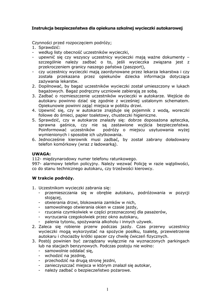 Instrukcja bezpieczeństwa dla opiekuna szkolnej wycieczki autokarowej Czynności przed rozpoczęciem podróŜy; 1. Sprawdzić: - według listy obecność uczestników wycieczki, - upewnić się czy wszyscy uczestnicy wycieczki mają waŜne dokumenty – szczególnie naleŜy zadbać o to, jeśli wycieczka związana jest z przekroczeniem granicy naszego państwa (paszport), - czy uczestnicy wycieczki mają zaordynowane przez lekarza lekarstwa i czy została przekazana przez opiekunów dziecka informacja dotycząca zaŜywania lekarstw. 2. Dopilnować, by bagaŜ uczestników wycieczki został umieszczony w lukach bagaŜowych. BagaŜ podręczny uczniowie zabierają ze sobą. 3. Zadbać o rozmieszczenie uczestników wycieczki w autokarze. Wejście do autokaru powinno dziać się zgodnie z wcześniej ustalonym schematem. Opiekunowie powinni zająć miejsca w pobliŜu drzwi. 4. Upewnić się, czy w autokarze znajduje się pojemnik z wodą, woreczki foliowe do śmieci, papier toaletowy, chusteczki higieniczne. 5. Sprawdzić, czy w autokarze znalazły się: dobrze doposaŜona apteczka, sprawna gaśnica, czy nie są zastawione wyjścia bezpieczeństwa. Poinformować uczestników podróŜy o miejscu usytuowania wyŜej wymienionych i sposobie ich uŜytkowania. 6. Jednocześnie kierownik musi zadbać, by został zabrany doładowany telefon komórkowy (wraz z ładowarką). UWAGA: 112- międzynarodowy numer telefonu ratunkowego. 997- alarmowy telefon policyjny. NaleŜy wezwać Policję w razie wątpliwości, co do stanu technicznego autokaru, czy trzeźwości kierowcy. W trakcie podróŜy. 1. Uczestnikom wycieczki zabrania się: - przemieszczania się w obrębie autokaru, podróŜowania w pozycji stojącej, - otwierania drzwi, blokowania zamków w nich, - samowolnego otwierania okien w czasie jazdy, - rzucania czymkolwiek w części przeznaczonej dla pasaŜerów, - wyrzucania czegokolwiek przez okno autokaru, - palenia tytoniu, spoŜywania alkoholu i innych uŜywek. 2. Zaleca się robienie przerw podczas jazdy. Czas przerwy uczestnicy wycieczki mogą wykorzystać na spoŜycie posiłku, toaletę, przewietrzenie autokaru i chociaŜby krótki spacer czy chwilę ćwiczeń fizycznych. 3. Postój powinien być zarządzany wyłącznie na wyznaczonych parkingach lub na stacjach benzynowych. Podczas postoju nie wolno: - samowolnie oddalać się, - wchodzić na jezdnię, - przechodzić na drugą stronę jezdni, - zanieczyszczać miejsca w którym znalazł się autokar, - naleŜy zadbać o bezpieczeństwo poŜarowe. 1 JeŜeli postój został zarządzony niespodziewanie na drodze naleŜy zadbać by autokar miał włączone światła awaryjne. MłodzieŜy zaś nie wolno grupować się z przodu (tyłu) autokaru. 4. NaleŜy pamiętać o sprawdzeniu obecności po zakończonym postoju. Po zakończeniu podróŜy: Opiekun grupy powinien sprawdzić: 1. Czy wszyscy uczestnicy wycieczki zabrali swoje bagaŜe i rzeczy osobiste. 2. Czy w autokarze pozostawiono porządek (czy młodzieŜ nie zniszczyła elementów wyposaŜenia). UWAGA: Opiekunowie są zobowiązani do zadbania, po godzinie 21.00 młodzieŜ wracała do domu pod opieką rodziców (opiekunów). POSTEPOWANIE W RAZIE AWARII LUB INNYCH ZAGROśEŃ 1. Uczestników wycieczki ewakuować, wykorzystując wyjścia bezpieczeństwa, w bezpieczne miejsce. 2. W razie potrzeby poszkodowanym udzielić pierwszej pomocy. Pamiętać o zasadzie: - sprawdzić i dokonać wstępnej segregacji poszkodowanych, - najpierw udzielamy pomocy cięŜej rannym, później kolejno według cięŜkości zranień, 3. W tym samym czasie (w razie potrzeby) powiadomić o wypadku słuŜby ratunkowe, wykorzystując do tego międzynarodowy numer telefonu alarmowy (komórkowy) – 112. Podczas akcji gaśniczej postępować według powyŜszego schematu. Podjąć akcję gaśniczą. Część opiekunów ewakuuje grupę młodzieŜy pamiętając o tym, by zachować bezpieczną odległość (istnieje niebezpieczeństwo wybuchu). OPRACOWAŁ ZATWIERDZIŁ 2