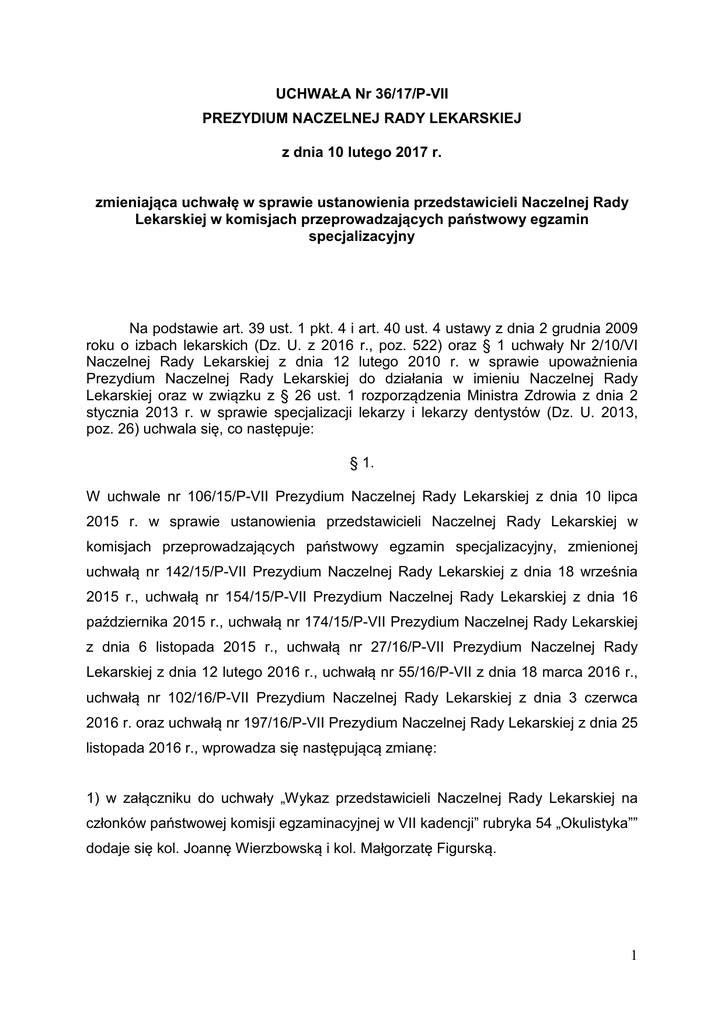 UCHWAŁA Nr 36/17/P-VII PREZYDIUM NACZELNEJ RADY LEKARSKIEJ z dnia 10 lutego 2017 r. zmieniająca uchwałę w sprawie ustanowienia przedstawicieli Naczelnej Rady Lekarskiej w komisjach przeprowadzających państwowy egzamin specjalizacyjny Na podstawie art. 39 ust. 1 pkt. 4 i art. 40 ust. 4 ustawy z dnia 2 grudnia 2009 roku o izbach lekarskich (Dz. U. z 2016 r., poz. 522) oraz § 1 uchwały Nr 2/10/VI Naczelnej Rady Lekarskiej z dnia 12 lutego 2010 r. w sprawie upoważnienia Prezydium Naczelnej Rady Lekarskiej do działania w imieniu Naczelnej Rady Lekarskiej oraz w związku z § 26 ust. 1 rozporządzenia Ministra Zdrowia z dnia 2 stycznia 2013 r. w sprawie specjalizacji lekarzy i lekarzy dentystów (Dz. U. 2013, poz. 26) uchwala się, co następuje: § 1. W uchwale nr 106/15/P-VII Prezydium Naczelnej Rady Lekarskiej z dnia 10 lipca 2015 r. w sprawie ustanowienia przedstawicieli Naczelnej Rady Lekarskiej w komisjach przeprowadzających państwowy egzamin specjalizacyjny, zmienionej uchwałą nr 142/15/P-VII Prezydium Naczelnej Rady Lekarskiej z dnia 18 września 2015 r., uchwałą nr 154/15/P-VII Prezydium Naczelnej Rady Lekarskiej z dnia 16 października 2015 r., uchwałą nr 174/15/P-VII Prezydium Naczelnej Rady Lekarskiej z dnia 6 listopada 2015 r., uchwałą nr 27/16/P-VII Prezydium Naczelnej Rady Lekarskiej z dnia 12 lutego 2016 r., uchwałą nr 55/16/P-VII z dnia 18 marca 2016 r., uchwałą nr 102/16/P-VII Prezydium Naczelnej Rady Lekarskiej z dnia 3 czerwca 2016 r. oraz uchwałą nr 197/16/P-VII Prezydium Naczelnej Rady Lekarskiej z dnia 25 listopada 2016 r., wprowadza się następującą zmianę: 1) w załączniku do uchwały „Wykaz przedstawicieli Naczelnej Rady Lekarskiej na członków państwowej komisji egzaminacyjnej w VII kadencji” rubryka 54 „Okulistyka”” dodaje się kol. Joannę Wierzbowską i kol. Małgorzatę Figurską. 1 § 2. Rubryka 54 wykazu przedstawicieli Naczelnej Rady Lekarskiej na członków państwowej komisji egzaminacyjnej w VII kadencji – dla dziedziny „Okulistyka” otrzymuje brzmienie jak w załączniku do niniejszej uchwały. § 3. Uchwała wchodzi w życie z dniem podjęcia. 2 Załącznik do uchwały Nr 36/17/P-VII PNRL 54) OKULISTYKA Małgorzata Świątkowska Jolanta Wojda Hanna Sikorska Andrzej Gębka Dariusz Dobrowolski Ewa Herba Katarzyna Wilk Bożena Romanowska - Dixon Jerzy Mackiewicz Wiesław Braciak Małgorzata Zdzieszyńska Maria Dowgird Krystyna Pecold Aleksandra Popielarz Ewa Czaplicka Andrzej Styszyński Karol Krzystolik Lidia Puchalska - Niedbał Andrzej Mierzejewski Joanna Wierzbowska Małgorzata Figurska Eleonora Urban Andrzej Stankiewicz Roman Goś Marek Rękas Bydgoszcz Gdańsk Gdańsk Gdańsk Katowice Katowice Katowice Kraków Lublin Łódź Łódź Olsztyn Poznań Poznań Poznań Poznań Szczecin Szczecin Toruń Warszawa Warszawa Wrocław Wojsko Wojsko Wojsko 3