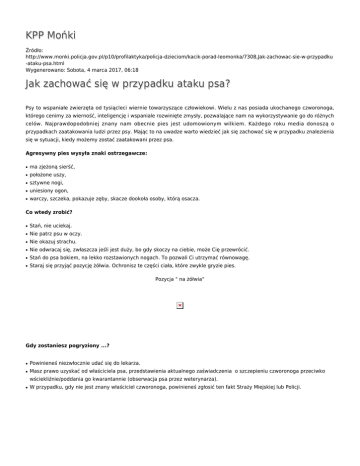 KPP Mońki Źródło: http://www.monki.policja.gov.pl/p10/profilaktyka/policja-dzieciom/kacik-porad-leomonka/7308,Jak-zachowac-sie-w-przypadku -ataku-psa.html Wygenerowano: Sobota, 4 marca 2017, 06:18 Jak zachować się w przypadku ataku psa? Psy to wspaniałe zwierzęta od tysiącleci wiernie towarzyszące człowiekowi. Wielu z nas posiada ukochanego czworonoga, którego cenimy za wierność, inteligencję i wspaniale rozwinięte zmysły, pozwalające nam na wykorzystywanie go do różnych celów. Najprawdopodobniej znany nam obecnie pies jest udomowionym wilkiem. Każdego roku media donoszą o przypadkach zaatakowania ludzi przez psy. Mając to na uwadze warto wiedzieć jak się zachować się w przypadku znalezienia się w sytuacji, kiedy możemy zostać zaatakowani przez psa. Agresywny pies wysyła znaki ostrzegawcze: ● ma zjeżoną sierść, ● położone uszy, ● sztywne nogi, ● uniesiony ogon, ● warczy, szczeka, pokazuje zęby, skacze dookoła osoby, którą osacza. Co wtedy zrobić? ● Stań, nie uciekaj. ● Nie patrz psu w oczy. ● Nie okazuj strachu. ● Nie odwracaj się, zwłaszcza jeśli jest duży, bo gdy skoczy na ciebie, może Cię przewrócić. ● Stań do psa bokiem, na lekko rozstawionych nogach. To pozwali Ci utrzymać równowagę. ● Staraj się przyjąć pozycję żółwia. Ochronisz te części ciała, które zwykle gryzie pies. Pozycja " na żółwia" Gdy zostaniesz pogryziony ...? ● Powinieneś niezwłocznie udać się do lekarza. ● Masz prawo uzyskać od właściciela psa, przedstawienia aktualnego zaświadczenia o szczepieniu czworonoga przeciwko wściekliźnie/poddania go kwarantannie (obserwacja psa przez weterynarza). ● W przypadku, gdy nie jest znany właściciel czworonoga, powinieneś zgłosić ten fakt Straży Miejskiej lub Policji. Ocena: 0/5 (0) Tweetnij