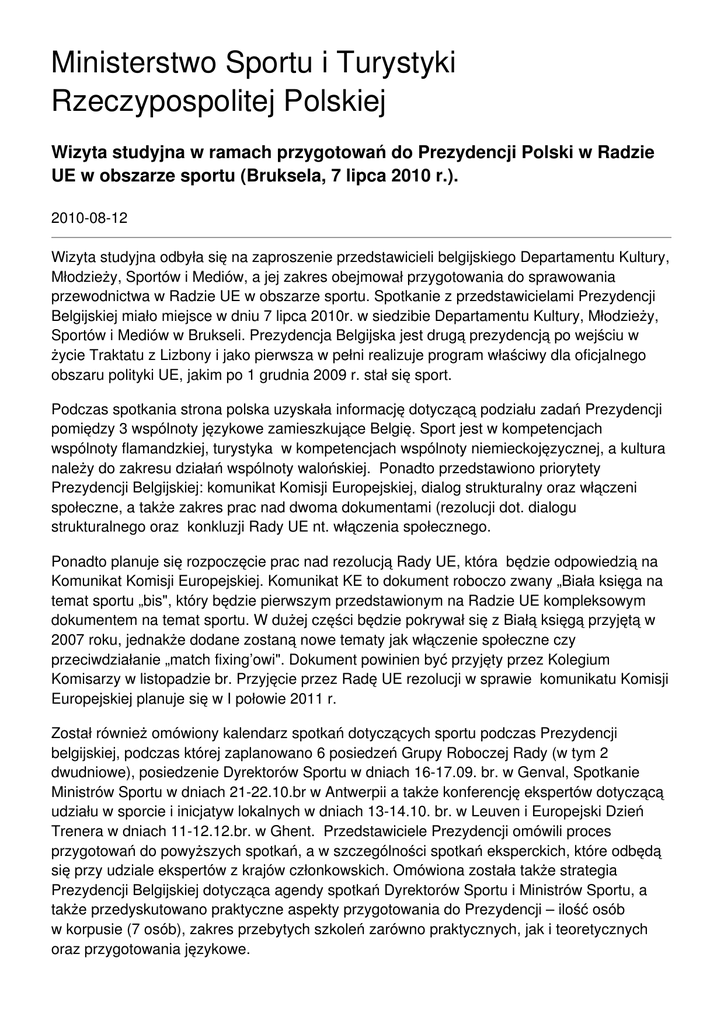 Ministerstwo Sportu i Turystyki Rzeczypospolitej Polskiej Wizyta studyjna w ramach przygotowań do Prezydencji Polski w Radzie UE w obszarze sportu (Bruksela, 7 lipca 2010 r.). 2010-08-12 Wizyta studyjna odbyła się na zaproszenie przedstawicieli belgijskiego Departamentu Kultury, Młodzieży, Sportów i Mediów, a jej zakres obejmował przygotowania do sprawowania przewodnictwa w Radzie UE w obszarze sportu. Spotkanie z przedstawicielami Prezydencji Belgijskiej miało miejsce w dniu 7 lipca 2010r. w siedzibie Departamentu Kultury, Młodzieży, Sportów i Mediów w Brukseli. Prezydencja Belgijska jest drugą prezydencją po wejściu w życie Traktatu z Lizbony i jako pierwsza w pełni realizuje program właściwy dla oficjalnego obszaru polityki UE, jakim po 1 grudnia 2009 r. stał się sport. Podczas spotkania strona polska uzyskała informację dotyczącą podziału zadań Prezydencji pomiędzy 3 wspólnoty językowe zamieszkujące Belgię. Sport jest w kompetencjach wspólnoty flamandzkiej, turystyka w kompetencjach wspólnoty niemieckojęzycznej, a kultura należy do zakresu działań wspólnoty walońskiej. Ponadto przedstawiono priorytety Prezydencji Belgijskiej: komunikat Komisji Europejskiej, dialog strukturalny oraz włączeni społeczne, a także zakres prac nad dwoma dokumentami (rezolucji dot. dialogu strukturalnego oraz konkluzji Rady UE nt. włączenia społecznego. Ponadto planuje się rozpoczęcie prac nad rezolucją Rady UE, która będzie odpowiedzią na Komunikat Komisji Europejskiej. Komunikat KE to dokument roboczo zwany „Biała księga na temat sportu „bis", który będzie pierwszym przedstawionym na Radzie UE kompleksowym dokumentem na temat sportu. W dużej części będzie pokrywał się z Białą księgą przyjętą w 2007 roku, jednakże dodane zostaną nowe tematy jak włączenie społeczne czy przeciwdziałanie „match fixing’owi". Dokument powinien być przyjęty przez Kolegium Komisarzy w listopadzie br. Przyjęcie przez Radę UE rezolucji w sprawie komunikatu Komisji Europejskiej planuje się w I połowie 2011 r. Został również omówiony kalendarz spotkań dotyczących sportu podczas Prezydencji belgijskiej, podczas której zaplanowano 6 posiedzeń Grupy Roboczej Rady (w tym 2 dwudniowe), posiedzenie Dyrektorów Sportu w dniach 16-17.09. br. w Genval, Spotkanie Ministrów Sportu w dniach 21-22.10.br w Antwerpii a także konferencję ekspertów dotyczącą udziału w sporcie i inicjatyw lokalnych w dniach 13-14.10. br. w Leuven i Europejski Dzień Trenera w dniach 11-12.12.br. w Ghent. Przedstawiciele Prezydencji omówili proces przygotowań do powyższych spotkań, a w szczególności spotkań eksperckich, które odbędą się przy udziale ekspertów z krajów członkowskich. Omówiona została także strategia Prezydencji Belgijskiej dotycząca agendy spotkań Dyrektorów Sportu i Ministrów Sportu, a także przedyskutowano praktyczne aspekty przygotowania do Prezydencji – ilość osób w korpusie (7 osób), zakres przebytych szkoleń zarówno praktycznych, jak i teoretycznych oraz przygotowania językowe. Spotkanie z członkami korpusu Prezydencji Belgijskiej odpowiedzialnymi za sport, realizującymi zadania wynikające z programu Prezydencji Belgijskiej miało charakter roboczy i było bardzo pouczające w kontekście praktycznych aspektów przygotowań do zadań Prezydencji. Polska jako kraj, który po raz pierwszy będzie sprawował przewodnictwo w Radzie UE nie posiada własnych doświadczeń w tym zakresie, dlatego też wizyty umożliwiające pozyskanie tych doświadczeń podczas obserwacji pracy innych Prezydencji są niezwykle cenne i konieczne do kompleksowego przygotowanie członków korpusu Prezydencji Polskiej do realizacji zadań wynikających z Programu Polskiej Prezydencji w II połowie 2011 r.