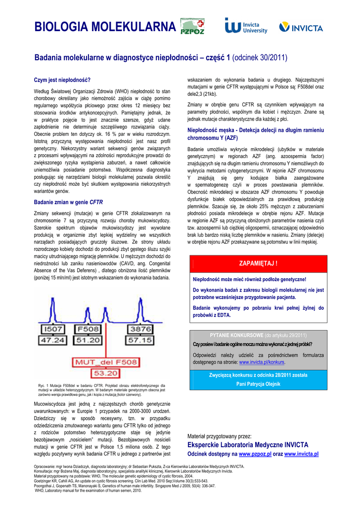 BIOLOGIA MOLEKULARNA Badania molekularne w diagnostyce niepłodności – część 1 (odcinek 30/2011) Czym jest niepłodność? Według Światowej Organizacji Zdrowia (WHO) niepłodność to stan chorobowy określany jako niemoŜność zajścia w ciąŜę pomimo regularnego współŜycia płciowego przez okres 12 miesięcy bez stosowania środków antykoncepcyjnych. Pamiętajmy jednak, Ŝe w praktyce pojęcie to jest znacznie szersze, gdyŜ udane zapłodnienie nie determinuje szczęśliwego rozwiązania ciąŜy. Obecnie problem ten dotyczy ok. 16 % par w wieku rozrodczym. Istotną przyczyną występowania niepłodności jest nasz profil genetyczny. Niekorzystny wariant sekwencji genów związanych z procesami wpływającymi na zdolności reprodukcyjne prowadzi do zwiększonego ryzyka wystąpienia zaburzeń, a nawet całkowicie uniemoŜliwia posiadanie potomstwa. Współczesna diagnostyka posługując się narzędziami biologii molekularnej pozwala określić czy niepłodność moŜe być skutkiem występowania niekorzystnych wariantów genów. Badanie zmian w genie CFTR Zmiany sekwencji (mutacje) w genie CFTR zlokalizowanym na chromosomie 7 są przyczyną rozwoju choroby mukowiscydozy. Szerokie spektrum objawów mukowiscydozy jest wywołane produkcją w organizmie zbyt lepkiej wydzieliny we wszystkich narządach posiadających gruczoły śluzowe. Ze strony układu rozrodczego kobiety dochodzi do produkcji zbyt gęstego śluzu szyjki macicy utrudniającego migrację plemników. U męŜczyzn dochodzi do niedroŜności lub zaniku nasieniowodów (CAVD, ang. Congenital Absence of the Vas Deferens) , dlatego obniŜona ilość plemników (poniŜej 15 mln/ml) jest istotnym wskazaniem do wykonania badania. wskazaniem do wykonania badania u drugiego. Najczęstszymi mutacjami w genie CFTR występującymi w Polsce są: F508del oraz dele2,3 (21kb). Zmiany w obrębie genu CFTR są czynnikiem wpływającym na parametry płodności, wspólnym dla kobiet i męŜczyzn. Znane są jednak mutacje charakterystyczne dla kaŜdej z płci. Niepłodność męska - Detekcja delecji na długim ramieniu chromosomu Y (AZF) Badanie umoŜliwia wykrycie mikrodelecji (ubytków w materiale genetycznym) w regionach AZF (ang. azoospermia factor) znajdujących się na długim ramieniu chromosomu Y niemoŜliwych do wykrycia metodami cytogenetycznymi. W rejonie AZF chromosomu Y znajdują się geny kodujące białka zaangaŜowane w spermatogenezę czyli w proces powstawania plemników. Obecność mikrodelecji w obszarze AZF chromosomu Y powoduje dysfunkcje białek odpowiedzialnych za prawidłową produkcję plemników. Szacuje się, Ŝe około 25% męŜczyzn z zaburzeniami płodności posiada mikrodelecje w obrębie rejonu AZF. Mutacje w regionie AZF są przyczyną obniŜonych parametrów nasienia czyli tzw. azoospermii lub cięŜkiej oligospermii, oznaczającej odpowiednio brak lub bardzo niską liczbę plemników w nasieniu. Zmiany (delecje) w obrębie rejonu AZF przekazywane są potomstwu w linii męskiej. ZAPAMIĘTAJ ! Niepłodność moŜe mieć równieŜ podłoŜe genetyczne! Do wykonania badań z zakresu biologii molekularnej nie jest potrzebne wcześniejsze przygotowanie pacjenta. Badanie wykonujemy po pobraniu krwi pełnej Ŝylnej do probówki z EDTA. PYTANIE KONKURSOWE (do artykułu 29/2011) Czy posiew i badanie ogólne moczu moŜna wykonać z jednej próbki? Odpowiedzi naleŜy udzielić za pośrednictwem formularza dostępnego na stronie: www.invicta.pl/konkurs. Zwycięzcą konkursu z odcinka 28/2011 została Ryc. 1 Mutacja F508del w badaniu CFTR. Przykład obrazu elektroforetycznego dla mutacji w układzie heterozygotycznym. W badanym materiale genetycznym obecna jest zarówno wersja prawidłowa genu, jak i kopia z mutacją (kolor czerwony). Mucowiscydoza jest jedną z najczęstszych chorób genetycznie uwarunkowanych: w Europie 1 przypadek na 2000-3000 urodzeń. Dziedziczy się w sposób recesywny, tzn. w przypadku odziedziczenia zmutowanego wariantu genu CFTR tylko od jednego z rodziców potomstwo heterozygotyczne staje się jedynie bezobjawowym „nosicielem” mutacji. Bezobjawowych nosicieli mutacji w genie CFTR jest w Polsce 1,5 miliona osób. Z tego względu pozytywny wynik badania CFTR u jednego z partnerów jest Pani Patrycja Olejnik Materiał przygotowany przez: Eksperckie Laboratoria Medyczne INVICTA Odcinek dostępny na www.pzpoz.pl oraz www.invicta.pl Opracowanie: mgr Iwona Dziadczyk, diagnosta laboratoryjny; dr Sebastian Pukszta, Z-ca Kierownika Laboratoriów Medycznych INVICTA. Konsultacja: mgr BoŜena Maj, diagnosta laboratoryjny, specjalista analityki klinicznej, Kierownik Laboratoriów Medycznych Invicta. Materiał przygotowany na podstawie: WHO, The molecular genetic epidemiology of cystic fibrosis, 2004. Goetzinger KR, Cahill AG, An update on cystic fibrosis screening. Clin Lab Med. 2010 Sep;Volume 30(3):533-543. Poongothai J, Gopenath TS, Manonayaki S, Genetics of human male infertility. Singapore Med J 2009, 50(4): 336-347. WHO, Laboratory manual for the examination of human semen, 2010.