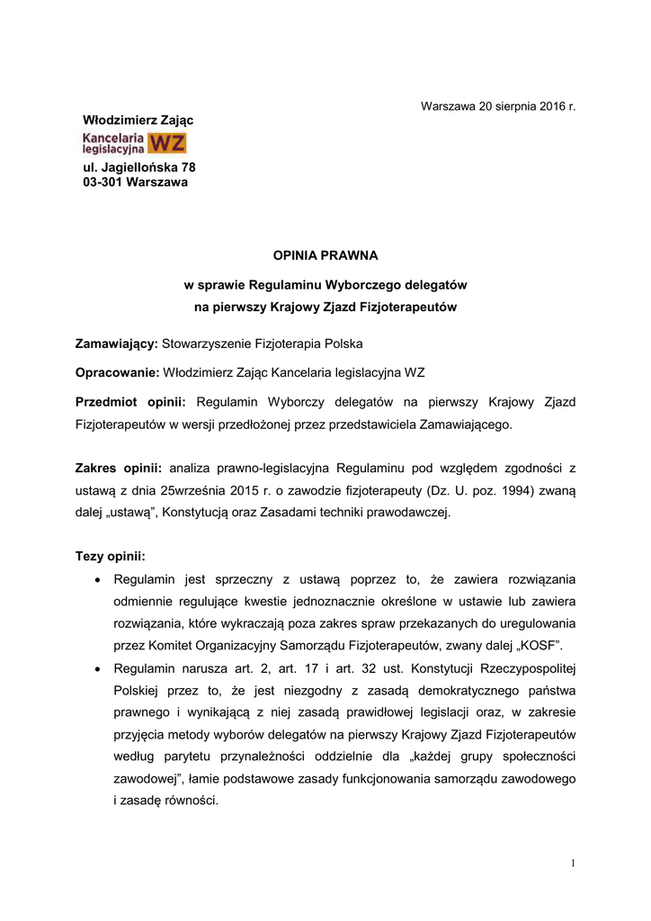 Warszawa 20 sierpnia 2016 r. Włodzimierz Zając ul. Jagiellońska 78 03-301 Warszawa OPINIA PRAWNA w sprawie Regulaminu Wyborczego delegatów na pierwszy Krajowy Zjazd Fizjoterapeutów Zamawiający: Stowarzyszenie Fizjoterapia Polska Opracowanie: Włodzimierz Zając Kancelaria legislacyjna WZ Przedmiot opinii: Regulamin Wyborczy delegatów na pierwszy Krajowy Zjazd Fizjoterapeutów w wersji przedłożonej przez przedstawiciela Zamawiającego. Zakres opinii: analiza prawno-legislacyjna Regulaminu pod względem zgodności z ustawą z dnia 25września 2015 r. o zawodzie fizjoterapeuty (Dz. U. poz. 1994) zwaną dalej „ustawą”, Konstytucją oraz Zasadami techniki prawodawczej. Tezy opinii: • Regulamin jest sprzeczny z ustawą poprzez to, że zawiera rozwiązania odmiennie regulujące kwestie jednoznacznie określone w ustawie lub zawiera rozwiązania, które wykraczają poza zakres spraw przekazanych do uregulowania przez Komitet Organizacyjny Samorządu Fizjoterapeutów, zwany dalej „KOSF”. • Regulamin narusza art. 2, art. 17 i art. 32 ust. Konstytucji Rzeczypospolitej Polskiej przez to, że jest niezgodny z zasadą demokratycznego państwa prawnego i wynikającą z niej zasadą prawidłowej legislacji oraz, w zakresie przyjęcia metody wyborów delegatów na pierwszy Krajowy Zjazd Fizjoterapeutów według parytetu przynależności oddzielnie dla „każdej grupy społeczności zawodowej”, łamie podstawowe zasady funkcjonowania samorządu zawodowego i zasadę równości. 1 • Regulamin zawiera wady legislacyjne utrudniające, a w niektórych przypadkach uniemożliwiające jego poprawną interpretację i stosowanie przepisów w nim zawartych. TREŚĆ OPINII I. Uwagi ogólne 1. Zgodnie z art. 153 ust. 3 pkt 3 ustawy do zadań KOSF należy opracowanie projektu regulaminu wyboru delegatów na pierwszy Krajowy Zjazd Fizjoterapeutów oraz opracowanie projektu regulaminu pierwszego Krajowego Zjazdu Fizjoterapeutów. Nie ulega wątpliwości, że powinny to być dwa odrębne akty, uregulowania oddzielnie upoważniony regulujące wyłącznie (zobowiązany) został kwestie, KOSF. do których Ustawa nie rozstrzyga wszystkich istotnych kwestii dotyczących przeprowadzenia wyboru, pozostawiając je do decyzji KOSF lub niedookreślone ale Regulamin musi pozostawać w zgodności z ustawą, nie może modyfikować regulacji zawartych w jej przepisach lub ograniczać prawa obowiązków członków wspólnoty samorządowej. Przedstawiony do zaopiniowania akt zawiera rozwiązania sprzeczne z przepisami ustawy oraz wykracza poza zakres regulacji, które mogą być jego przedmiotem. 2. Regulamin jako akt normatywny regulujący wybory powinien spełniać wymogi kompletności, niesprzeczności i precyzyjności procedur wyborczych. Opiniowany akt jest w tym zakresie dalece niedoskonały i zawiera przepisy niejasne, bądź mające charakter wyłącznie informacyjny. Nie zawiera też dostatecznie szczegółowych regulacji związanych ze wszystkimi etapami procedury wyborczej. 3. Do uwag o charakterze ogólnym należy zaliczyć także uwagę o zasadniczym znaczeniu dla treści Regulaminu i jego zgodności z ustawą i Konstytucją. Przyjęty uchwałą KOSF Regulamin wprowadza do wyborów zasadę podziału mandatów delegatów na pierwszy KZF według swoistego parytetu opartego na przynależności do „poszczególnych grup przynależności zawodowej i nakazuje aby wśród delegatów „w skali ogólnokrajowej” było co najmniej 9% specjalistów fizjoterapii, 58% magistrów fizjoterapii, 18% licencjatów 2 fizjoterapii i 9% techników fizjoterapii. Z tym wymogiem wiążą się specjalne zasady głosowania sprowadzające się do tworzenia oddzielnych list kandydatów dla poszczególnych grup zawodowych, na które mogą głosować tylko fizjoterapeuci posiadający konkretne wykształcenie. Wprowadzenie takiego „parytetu” jest w ocenie autora opinii sprzeczne z ustawą oraz z art. 17 i art. 32 Konstytucji. Argumenty za taką konkluzją zostały przedstawione szczegółowo w opinii sporządzonej dla Zamawiającego w dniu 29 lipca br. Istotą zarzutów związanych z omawianymi regulacjami jest fakt, że wprowadzają one wbrew przepisom ustawy zróżnicowanie praw członków wspólnoty samorządu zawodowego fizjoterapeutów w wyborach do organu KIF ze względu na wykształcenie, co jednocześnie narusza podstawowe zasady funkcjonowania samorządu zawodowego wynikające z art. 17 Konstytucji, powodując w efekcie także naruszenie zasady równości i złamanie zakazu dyskryminacji ze względu na jakiekolwiek kryterium, w tym kryterium poziomu wykształcenia. Takie rozwiązanie może być wprowadzone jedynie ustawą i tylko wtedy gdy jest to uzasadnione koniecznością ochrony innych uzasadnionych konstytucyjnie wartości. W przypadku ustawy o samorządzie zawodowym fizjoterapeutów, mimo tego, że art. 4 ust. 7 przewiduje zróżnicowanie wykonywania poszczególnych czynności zawodowych fizjoterapeuty w oparciu o poziom wykształcenia, to nie znalazło to odbicia w przepisach dotyczących członkostwa w organach KIF. Skoro ustawodawca nie wprowadził wymogu proporcjonalności w reprezentacji poszczególnych grup zawodowych wśród delegatów na KZF, to nie może tego uczynić KOSF w regulaminie wyboru delegatów na pierwszy KZF. W świetle obowiązującej ustawy, co już zostało wskazane w ww. opinii, wszyscy członkowie samorządu mają „równe prawa do uczestnictwa w pracach samorządu fizjoterapeutów i jego organów, bez względu na to jakie posiadają wykształcenie, czy też doświadczenie zawodowe”. Niezależnie od powyższego należy zwrócić uwagę, że wprowadzone Regulaminem procedury związane z zachowaniem parytetu są opisane nieprecyzyjnie i mogą być niewykonalne w praktyce. Te uwarunkowania opisano w uwagach szczegółowych odnoszących się do „procedury parytetowej”. 3 II. Uwagi szczegółowe 1. § 1 jest zbędny, zawiera jedynie wskazanie podstawy prawnej będącej w istocie 