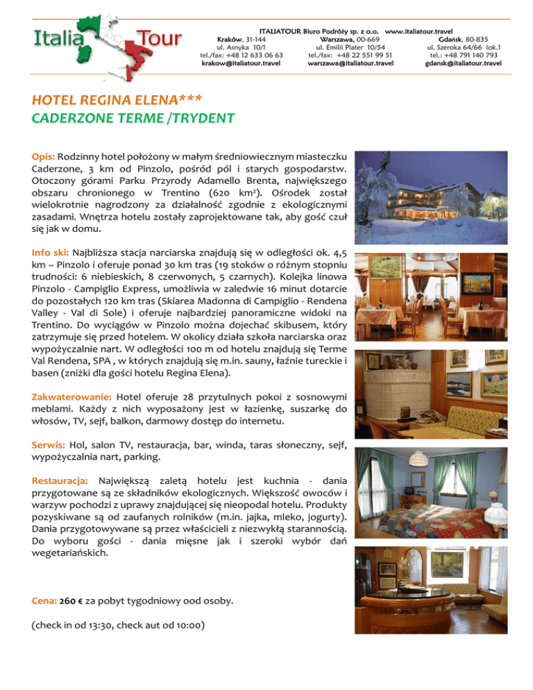 ITALIATOUR Biuro Podróży sp. z o.o. www.italiatour.travel Kraków, 31-144 Warszawa, 00-669 Gdańsk, 80-835 ul. Asnyka 10/1 ul. Emilii Plater 10/54 ul. Szeroka 64/66 lok.1 tel./fax: +48 12 633 06 63 tel./fax: +48 22 551 99 51 tel.: +48 791 140 793 [email protected] [email protected] [email protected] HOTEL REGINA ELENA*** CADERZONE TERME /TRYDENT Opis: Rodzinny hotel położony w małym średniowiecznym miasteczku Caderzone, 3 km od Pinzolo, pośród pól i starych gospodarstw. Otoczony górami Parku Przyrody Adamello Brenta, największego obszaru chronionego w Trentino (620 km²). Ośrodek został wielokrotnie nagrodzony za działalność zgodnie z ekologicznymi zasadami. Wnętrza hotelu zostały zaprojektowane tak, aby gość czuł się jak w domu. Info ski: Najbliższa stacja narciarska znajdują się w odległości ok. 4,5 km – Pinzolo i oferuje ponad 30 km tras (19 stoków o różnym stopniu trudności: 6 niebieskich, 8 czerwonych, 5 czarnych). Kolejka linowa Pinzolo - Campiglio Express, umożliwia w zaledwie 16 minut dotarcie do pozostałych 120 km tras (Skiarea Madonna di Campiglio - Rendena Valley - Val di Sole) i oferuje najbardziej panoramiczne widoki na Trentino. Do wyciągów w Pinzolo można dojechać skibusem, który zatrzymuje się przed hotelem. W okolicy działa szkoła narciarska oraz wypożyczalnie nart. W odległości 100 m od hotelu znajdują się Terme Val Rendena, SPA , w których znajdują się m.in. sauny, łaźnie tureckie i basen (zniżki dla gości hotelu Regina Elena). Zakwaterowanie: Hotel oferuje 28 przytulnych pokoi z sosnowymi meblami. Każdy z nich wyposażony jest w łazienkę, suszarkę do włosów, TV, sejf, balkon, darmowy dostęp do internetu. Serwis: Hol, salon TV, restauracja, bar, winda, taras słoneczny, sejf, wypożyczalnia nart, parking. Restauracja: Największą zaletą hotelu jest kuchnia - dania przygotowane są ze składników ekologicznych. Większość owoców i warzyw pochodzi z uprawy znajdującej się nieopodal hotelu. Produkty pozyskiwane są od zaufanych rolników (m.in. jajka, mleko, jogurty). Dania przygotowywane są przez właścicieli z niezwykłą starannością. Do wyboru gości - dania mięsne jak i szeroki wybór dań wegetariańskich. Cena: 260 € za pobyt tygodniowy ood osoby. (check in od 13:30, check aut od 10:00)