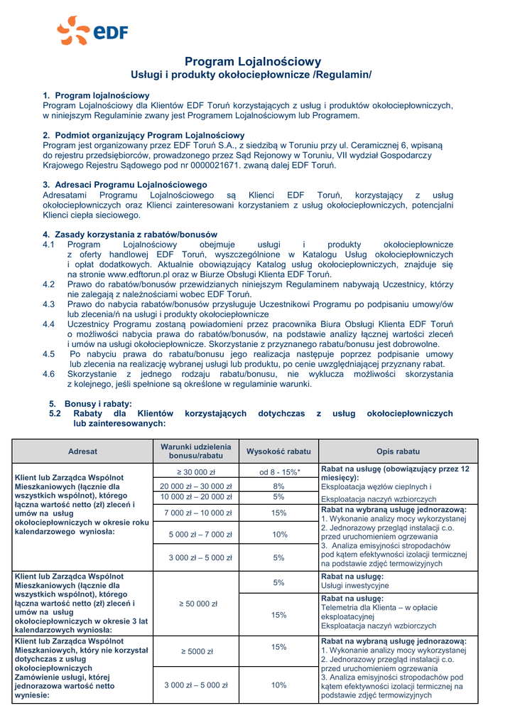Program Lojalnościowy Usługi i produkty okołociepłownicze /Regulamin/ 1. Program lojalnościowy Program Lojalnościowy dla Klientów EDF Toruń korzystających z usług i produktów okołociepłowniczych, w niniejszym Regulaminie zwany jest Programem Lojalnościowym lub Programem. 2. Podmiot organizujący Program Lojalnościowy Program jest organizowany przez EDF Toruń S.A., z siedzibą w Toruniu przy ul. Ceramicznej 6, wpisaną do rejestru przedsiębiorców, prowadzonego przez Sąd Rejonowy w Toruniu, VII wydział Gospodarczy Krajowego Rejestru Sądowego pod nr 0000021671. zwaną dalej EDF Toruń. 3. Adresaci Programu Lojalnościowego Adresatami Programu Lojalnościowego są Klienci EDF Toruń, korzystający z usług okołociepłowniczych oraz Klienci zainteresowani korzystaniem z usług okołociepłowniczych, potencjalni Klienci ciepła sieciowego. 4. Zasady korzystania z rabatów/bonusów 4.1 Program Lojalnościowy obejmuje usługi i produkty okołociepłownicze z oferty handlowej EDF Toruń, wyszczególnione w Katalogu Usług okołociepłowniczych i opłat dodatkowych. Aktualnie obowiązujący Katalog usług okołociepłowniczych, znajduje się na stronie www.edftorun.pl oraz w Biurze Obsługi Klienta EDF Toruń. 4.2 Prawo do rabatów/bonusów przewidzianych niniejszym Regulaminem nabywają Uczestnicy, którzy nie zalegają z należnościami wobec EDF Toruń. 4.3 Prawo do nabycia rabatów/bonusów przysługuje Uczestnikowi Programu po podpisaniu umowy/ów lub zlecenia/ń na usługi i produkty okołociepłownicze 4.4 Uczestnicy Programu zostaną powiadomieni przez pracownika Biura Obsługi Klienta EDF Toruń o możliwości nabycia prawa do rabatów/bonusów, na podstawie analizy łącznej wartości zleceń i umów na usługi okołociepłownicze. Skorzystanie z przyznanego rabatu/bonusu jest dobrowolne. 4.5 Po nabyciu prawa do rabatu/bonusu jego realizacja następuje poprzez podpisanie umowy lub zlecenia na realizację wybranej usługi lub produktu, po cenie uwzględniającej przyznany rabat. 4.6 Skorzystanie z jednego rodzaju rabatu/bonusu, nie wyklucza możliwości skorzystania z kolejnego, jeśli spełnione są określone w regulaminie warunki. 5. Bonusy i rabaty: 5.2 Rabaty dla Klientów lub zainteresowanych: Adresat Klient lub Zarządca Wspólnot Mieszkaniowych (łącznie dla wszystkich wspólnot), którego łączna wartość netto (zł) zleceń i umów na usług okołociepłowniczych w okresie roku kalendarzowego wyniosła: Klient lub Zarządca Wspólnot Mieszkaniowych (łącznie dla wszystkich wspólnot), którego łączna wartość netto (zł) zleceń i umów na usług okołociepłowniczych w okresie 3 lat kalendarzowych wyniosła: Klient lub Zarządca Wspólnot Mieszkaniowych, który nie korzystał dotychczas z usług okołociepłowniczych Zamówienie usługi, której jednorazowa wartość netto wyniesie: korzystających dotychczas Warunki udzielenia bonusu/rabatu Wysokość rabatu ≥ 30 000 zł od 8 - 15%* 20 000 zł – 30 000 zł 10 000 zł – 20 000 zł 8% 5% 7 000 zł – 10 000 zł 15% 5 000 zł – 7 000 zł 10% 3 000 zł – 5 000 zł 5% z usług okołociepłowniczych Opis rabatu Rabat na usługę (obowiązujący przez 12 miesięcy): Eksploatacja węzłów cieplnych i Eksploatacja naczyń wzbiorczych Rabat na wybraną usługę jednorazową: 1. Wykonanie analizy mocy wykorzystanej 2. Jednorazowy przegląd instalacji c.o. przed uruchomieniem ogrzewania 3. Analiza emisyjności stropodachów pod kątem efektywności izolacji termicznej na podstawie zdjęć termowizyjnych 5% Rabat na usługę: Usługi inwestycyjne 15% Rabat na usługę: Telemetria dla Klienta – w opłacie eksploatacyjnej Eksploatacja naczyń wzbiorczych ≥ 50 000 zł ≥ 5000 zł 15% 3 000 zł – 5 000 zł 10% Rabat na wybraną usługę jednorazową: 1. Wykonanie analizy mocy wykorzystanej 2. Jednorazowy przegląd instalacji c.o. przed uruchomieniem ogrzewania 3. Analiza emisyjności stropodachów pod kątem efektywności izolacji termicznej na podstawie zdjęć termowizyjnych Klient, zainteresowany przyłączeniem do msc (potencjalni Klienci rynku ciepła) 5% 20 % Rabat na usługę: Usługi inwestycyjne Rabat na usługę: Analiza emisyjności stropodachów pod kątem efektywności izolacji termicznej na podstawie zdjęć termowizyjnych – dla budynków z rynku wtórnego przyłączanych do sieci ciepłowniczej - Rabaty obowiązują od dnia 1 października 2014 r., na czas nieokreślony, przy czym informacja o zmianach w Regulaminie przekazywana będzie z 1 miesięcznym wyprzedzeniem. - Wysokość udzielonego rabatu nie może przekroczyć 10 000 zł w ciągu roku. - *Wysokość rabatu uzależniona jest od wielkości węzła i przyjętego wariantu obsługi 5.3 Bonusy dla Klientów korzystających z programu „Ciepło przez cały rok”: Bonus Dla usługi – Telemetria dla Klienta (udostępnianie danych telemetrycznych) Zwolnienie z opłaty jednorazowej za włączenie obiektu zasilanego do bazy danych telemetrycznych Dla usługi – Telemetria dla Klienta (udostępnianie danych telemetrycznych) - w pierwszym roku obniżenie - o 30% - opłat za comiesięczną „eksploatację bazy danych” w okresie czerwiec, lipiec, sierpień - w drugim i kolejnych latach obniżenie - o 50% opłat za comiesięczną „eksploatację bazy danych” w okresie czerwiec, lipiec, sierpień Dla usługi – Wykonywanie kwartalnych analiz zużycia ciepła - w pierwszym roku bezpłatnie - w drugim roku obniżenie - o 50% - opłaty za wykonanie (do końca września) kwartalnej analizy zużycia ciepła budynku na potrzeby ogrzewania w okresie czerwiec, lipiec, sierpień - w kolejnych latach cena katalogowa Warunki udzielenia bonusu Cena po uwzględnieniu bonusu Warunki łącznie do spełnienia: bezpłatnie - Zlecenie na „Ciepło przez cały rok” - Podpisanie umowy udostępniania danych telemetrycznych Warunki łącznie do spełnienia: - Zlecenie na „Ciepło przez cały rok” - Podpisanie umowy udostępniania danych t