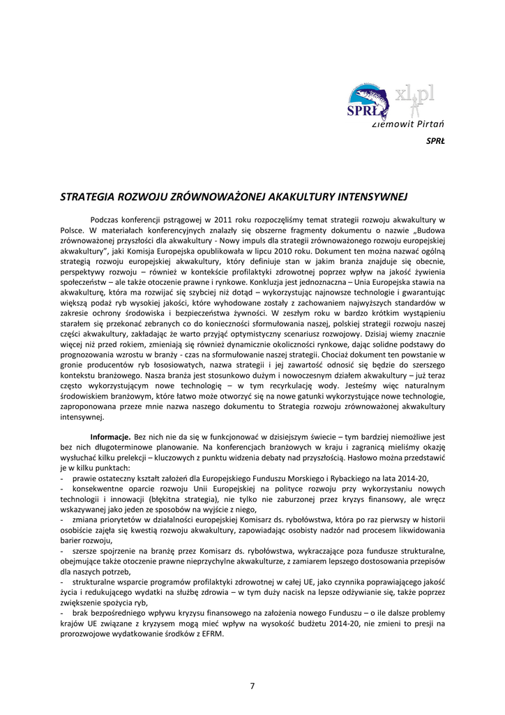 Ziemowit Pirtań SPRŁ STRATEGIA ROZWOJU ZRÓWNOWAŻONEJ AKAKULTURY INTENSYWNEJ Podczas konferencji pstrągowej w 2011 roku rozpoczęliśmy temat strategii rozwoju akwakultury w Polsce. W materiałach konferencyjnych znalazły się obszerne fragmenty dokumentu o nazwie „Budowa zrównoważonej przyszłości dla akwakultury - Nowy impuls dla strategii zrównoważonego rozwoju europejskiej akwakultury”, jaki Komisja Europejska opublikowała w lipcu 2010 roku. Dokument ten można nazwać ogólną strategią rozwoju europejskiej akwakultury, który definiuje stan w jakim branża znajduje się obecnie, perspektywy rozwoju – również w kontekście profilaktyki zdrowotnej poprzez wpływ na jakość żywienia społeczeństw – ale także otoczenie prawne i rynkowe. Konkluzja jest jednoznaczna – Unia Europejska stawia na akwakulturę, która ma rozwijać się szybciej niż dotąd – wykorzystując najnowsze technologie i gwarantując większą podaż ryb wysokiej jakości, które wyhodowane zostały z zachowaniem najwyższych standardów w zakresie ochrony środowiska i bezpieczeństwa żywności. W zeszłym roku w bardzo krótkim wystąpieniu starałem się przekonać zebranych co do konieczności sformułowania naszej, polskiej strategii rozwoju naszej części akwakultury, zakładając że warto przyjąć optymistyczny scenariusz rozwojowy. Dzisiaj wiemy znacznie więcej niż przed rokiem, zmieniają się również dynamicznie okoliczności rynkowe, dając solidne podstawy do prognozowania wzrostu w branży - czas na sformułowanie naszej strategii. Chociaż dokument ten powstanie w gronie producentów ryb łososiowatych, nazwa strategii i jej zawartość odnosić się będzie do szerszego kontekstu branżowego. Nasza branża jest stosunkowo dużym i nowoczesnym działem akwakultury – już teraz często wykorzystującym nowe technologię – w tym recyrkulację wody. Jesteśmy więc naturalnym środowiskiem branżowym, które łatwo może otworzyć się na nowe gatunki wykorzystujące nowe technologie, zaproponowana przeze mnie nazwa naszego dokumentu to Strategia rozwoju zrównoważonej akwakultury intensywnej. Informacje. Bez nich nie da się w funkcjonować w dzisiejszym świecie – tym bardziej niemożliwe jest bez nich długoterminowe planowanie. Na konferencjach branżowych w kraju i zagranicą mieliśmy okazję wysłuchać kilku prelekcji – kluczowych z punktu widzenia debaty nad przyszłością. Hasłowo można przedstawić je w kilku punktach: - prawie ostateczny kształt założeń dla Europejskiego Funduszu Morskiego i Rybackiego na lata 2014-20, - konsekwentne oparcie rozwoju Unii Europejskiej na polityce rozwoju przy wykorzystaniu nowych technologii i innowacji (błękitna strategia), nie tylko nie zaburzonej przez kryzys finansowy, ale wręcz wskazywanej jako jeden ze sposobów na wyjście z niego, - zmiana priorytetów w działalności europejskiej Komisarz ds. rybołówstwa, która po raz pierwszy w historii osobiście zajęła się kwestią rozwoju akwakultury, zapowiadając osobisty nadzór nad procesem likwidowania barier rozwoju, - szersze spojrzenie na branżę przez Komisarz ds. rybołówstwa, wykraczające poza fundusze strukturalne, obejmujące także otoczenie prawne nieprzychylne akwakulturze, z zamiarem lepszego dostosowania przepisów dla naszych potrzeb, - strukturalne wsparcie programów profilaktyki zdrowotnej w całej UE, jako czynnika poprawiającego jakość życia i redukującego wydatki na służbę zdrowia – w tym duży nacisk na lepsze odżywianie się, także poprzez zwiększenie spożycia ryb, - brak bezpośredniego wpływu kryzysu finansowego na założenia nowego Funduszu – o ile dalsze problemy krajów UE związane z kryzysem mogą mieć wpływ na wysokość budżetu 2014-20, nie zmieni to presji na prorozwojowe wydatkowanie środków z EFRM. 7 Otoczenie. Rozważając kwestie rozwoju akwakultury w Polsce należy wziąć pod uwagę nie tylko nasze - lokalne uwarunkowania, ale przede wszystkim plany Unii Europejskiej co do przyszłości akwakultury oraz środki jakich zamierza użyć do stymulacji jej rozwoju. Podstawowym narzędziem kreowania wzrostu są środki strukturalne – szczęśliwie dla rybactwa, w ramach tzw. Wspólnej Polityki Rybackiej funkcjonuje odrębny fundusz poświęcony wyłącznie naszej branży – w latach 2007-2013 Europejski Fundusz Rybacki, w latach 20142020 Europejski Fundusz Morski i Rybacki. Obecnie trwają prace konsultacyjne nad ostatecznym kształtem rozporządzenia Rady, które konstytuuje nowy fundusz, nie wiemy więc jeszcze jak wyglądała będzie jego ostateczna wersja. Jednak już na podstawie obecnego kształtu projektu oraz konsekwentnych komentarzy ze strony przedstawicieli Komisji Europejskiej (w tym samej Komisarz ds. rybołówstwa), można wysnuć pewne wnioski, które powinny być punktem wyjścia dla budowy długoterminowej strategii rozwoju akwakultury w Polsce. Konsensus budżetowy wypracowany przez Komisję Europejską utknął co prawda w Parlamencie Europejskim, jednak PE zarzuca Komisji nadmierną oszczędność – trudno więc traktować taki rozwój wypadków jako niekorzystny – poza ewentualnym opóźnieniem. Znamy jednak większość założeń, owszem w kuluarach pojawiają się informacje o zamiarze poluzowania niektórych działań (m.in. ograniczenia środków na rybołówstwo i przetwórstwo), jednak zapisy jakie na dziś zawierają projekty rozporządzeń pozwalają wymienić kilka założeń: a. na okres 2014-2020 przewidziany jest większy budżet o ponad 2 mln Euro na całą Wspólnotę, b. projekt przewiduje wdrożenie nowego podejścia do rybołówstwa morskiego: - odejście od złomowania kutrów, ograniczenie rekompensat za przestoje połowowe, - ograniczenie rent i innych form socjalnego wsparcia sektora o ile efekty nie gwarantują rozwiązania problemu, c. projekt przewiduje odrębny rozdział (odpowiednik osi priorytetowej), poświęcony wyłącznie akwakultu