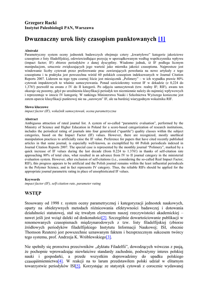 Grzegorz Racki Instytut Paleobiologii PAN, Warszawa Dwuznaczny urok listy czasopism punktowanych [1] Abstrakt Parametryczny system oceny jednostek badawczych obejmuje cztery „kwartylowe” kategorie jakościowe czasopism z listy filadelfijskiej, odzwierciedlające pozycję w uporządkowanym według współczynnika wpływu (impact factor; IF) zbiorze periodyków z danej dyscypliny. Wiadomo jednak, iŜ IF podlega licznym manipulacjom, sztucznie zwiększających jego wartość jako miernika jakości czasopisma. Najprostsze jest windowanie liczby cytowań przez preferowanie prac zawierających powołania na nowe artykuły z tego czasopisma i ta praktyka jest powszechna wśród 60 polskich czasopism indeksowanych w Journal Citation Reports 2007. Liderem na tego typu czarnej liście jest miesięcznik „Polimery” – w ich wypadku prawie 80% cytowań impaktowych to właśnie samocytowania. Ponad sześciokrotny wzrost IF w dekadzie (z 0,224 do 1,376!) pozwolił na awans z IV do II kategorii. Po odjęciu samocytowań (tzw. realny IF; RIF), awans ten okazuje się pozorny, gdyŜ po urealnieniu klasyfikacji periodyk ten niezmiennie naleŜy do najmniej wpływowych i reprezentuje w istocie IV kategorię. W rankingu Ministerstwa Nauki i Szkolnictwa WyŜszego konieczne jest zatem oparcie klasyfikacji punktowej nie na „surowym” IF, ale na bardziej wiarygodnym wskaźniku RIF. Słowa kluczowe impact factor (IF), wskaźnik samocytowań, ocena parametryczna Abstract Ambiguous attraction of rated journal list. A system of so-called “parametric evaluation”, performed by the Ministry of Science and Higher Education in Poland for a score-based categorization of research institutions, includes the periodical rating of journals into four generalized (“quartile”) quality classes within the subject categories, based on the Impact Factor (IF) values. However, there are recognized, mostly unethical manipulation practices to artificially raise the IF value. Preference for papers that have cited recently published articles in that same journal, is especially well-known, as exemplified by 60 Polish periodicals indexed in Journal Citation Reports 2007. The special case is represented by the monthly journal “Polimery”, marked by a quick increase of IF values during the last decade (from 0.224 to 1.376!) in thanks of self-citation rate approaching 80% of total cites, what resulted in an advance from IV to II journal category in the ministerial evaluation system. However, after exclusion of self-citations (i.e., considering the so-called Real Impact Factor; RIF), this progress appears to be artificial and the Polish journal remains within the least influential periodicals in the Polymer Science, and in fact represents IV category. Thus, the reliable RIFs should be applied for the appropriate journal parametric rating in place of unsophisticated IF values. Keywords impact factor (IF), self-citation rate, parameter rating WSTĘP Stosowany od 1998 r. system oceny parametrycznej i kategoryzacji jednostek naukowych, oparty na obiektywnych metodach róŜnicowania efektywności badawczej i dotowania działalności statutowej, stał się trwałym elementem naszej rzeczywistości akademickiej – nawet jeśli jest wciąŜ daleki od doskonałości[2]. Szczególnie dowartościowanie publikacji w renomowanych czasopismach międzynarodowych z tzw. listy filadelfijskiej (zbiorze źródłowych periodyków filadelfijskiego Instytutu Informacji Naukowej; ISI, obecnie Thomson Reuters) jest powszechnie uznawanym faktem i bezsprzecznym sukcesem twórcy tego systemu, prof. Andrzeja K. Wróblewskiego[3]. Nie spełniły się proroctwa przeciwników „dyktatu Filadelfii”, dowodzących wówczas z pasją, Ŝe pochopnie wprowadzając niewłaściwe standardy zachodnie, podwaŜymy interes polskiej nauki i gospodarki, a przede wszystkim doprowadzimy do upadku polskiego czasopiśmiennictwa[4]. W reakcji na to larum przedstawiłem polski udział w elitarnym towarzystwie periodyków ISI[5]. Korzystając ze statystyk cytowań z corocznie wydawanej bazy Journal Citation Reports (JCR), mogłem zaprezentować dane bibliometryczne o pozycji w literaturze światowej 22 polskich tytułów, rejestrowanych w indeksach cytowań ISI w 1995 r. Polskie czasopisma w JCR 2007 Po dziesięciu latach warto ponownie przyjrzeć się tej sprawie, zarówno w kontekście dawnych proroctw, jak i zbliŜającej się oceny parametrycznej, w której lista filadelfijska wciąŜ odgrywa przewodnią i immanentnie stymulującą rolę. I oto polski doborowy klub liczył w roku 2005… 60 czasopism (spośród 8282 w JCR Science i Social Sciences Editions), a wiadomo, iŜ ostatnio jeszcze znacznie się powiększył. Jest to wszelako wymuszone konkurowaniem baz koncernu Thomson Reuters z bibliograficznym bankiem danych Elseviera – Scopusem, uwzględniającym aŜ 17 tys. tytułów z kręgu nauk przyrodniczych, ścisłych i społecznych. Nie dziwi więc fakt, iŜ do owej elity dołączyło ostatnio 700 czasopism stricte regionalnych, w tym głównie polskojęzyczne: „Przegląd Elektrotechniczny”, „Rynek Energii”, „Przegląd Menopauzalny”, „Postępy Dermatologii i Alergologii”, „Ginekologia Polska”, „Ochrona Środowiska” oraz „Gospodarka Surowcami Mineralnymi”. Trzeba zaznaczyć, Ŝe w kategoriach względnych liczba docenionych polskich czasopism takŜe wzrosła przeszło dwukrotnie: od 0,4% w 1992 r. do ponad 0,9% w 2005 r. wśród tytułów z kręgu nauk przyrodniczych i ścisłych (tab. 1.). W JCR 2005 r. rozpoczęto rejestrowanie pierwszego polskiego czasopisma z dziedziny nauk społecznych: „Polish Sociological Review”, a kolejne zostały ostatnio włączone do indeksów cytowań (periodyki humanistyczne nie są w ogóle objęte analizą statystyczną). Tab. 1. Polskie czasopisma w Journal Citation Reports Science Edition 1994–2007 Rocznik Całkowita liczba czasopism Liczba polskich czasopism Procentowy udział Polski 1994 4513 18 