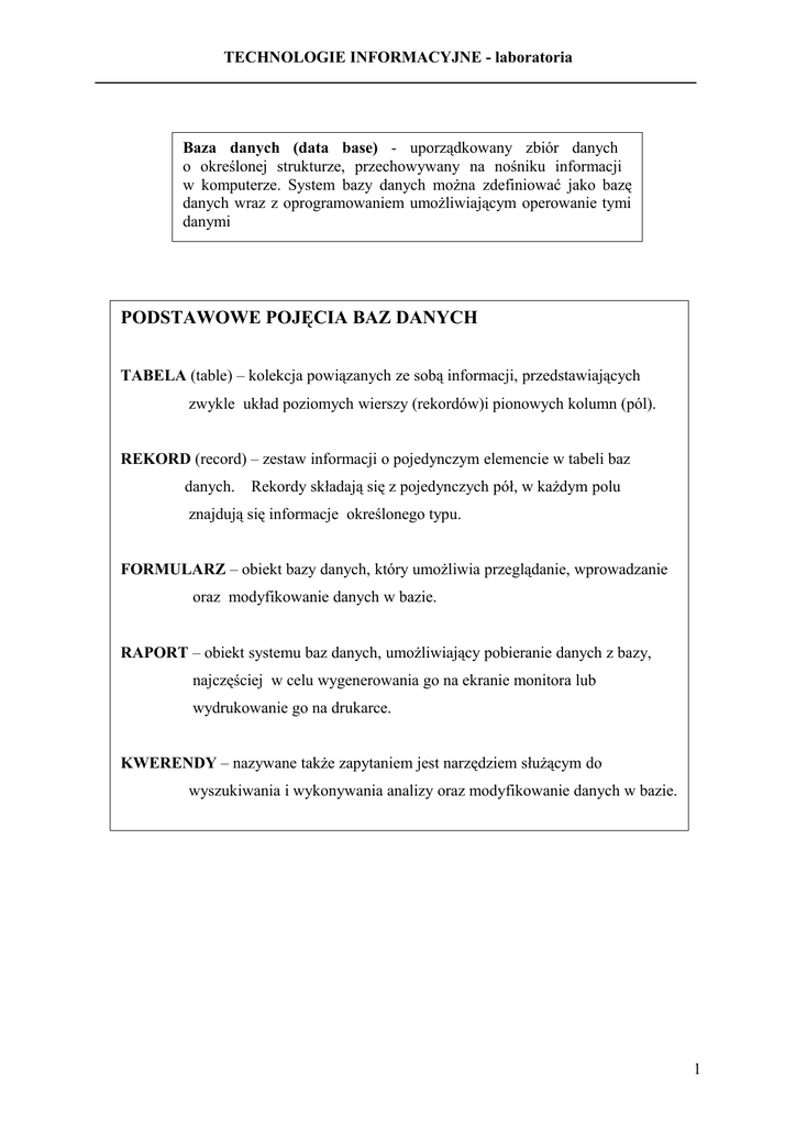 TECHNOLOGIE INFORMACYJNE - laboratoria Baza danych (data base) - uporządkowany zbiór danych o określonej strukturze, przechowywany na nośniku informacji w komputerze. System bazy danych można zdefiniować jako bazę danych wraz z oprogramowaniem umożliwiającym operowanie tymi danymi PODSTAWOWE POJĘCIA BAZ DANYCH TABELA (table) – kolekcja powiązanych ze sobą informacji, przedstawiających zwykle układ poziomych wierszy (rekordów)i pionowych kolumn (pól). REKORD (record) – zestaw informacji o pojedynczym elemencie w tabeli baz danych. Rekordy składają się z pojedynczych pół, w każdym polu znajdują się informacje określonego typu. FORMULARZ – obiekt bazy danych, który umożliwia przeglądanie, wprowadzanie oraz modyfikowanie danych w bazie. RAPORT – obiekt systemu baz danych, umożliwiający pobieranie danych z bazy, najczęściej w celu wygenerowania go na ekranie monitora lub wydrukowanie go na drukarce. KWERENDY – nazywane także zapytaniem jest narzędziem służącym do wyszukiwania i wykonywania analizy oraz modyfikowanie danych w bazie. 1 TECHNOLOGIE INFORMACYJNE - laboratoria Przykładowa baza danych KLUCZ GŁÓWNY STUDENCI Id_studenta Imię Nazwisko Rok_studiów ASOCJACJA Id_studenta Id_przedmiotu Id_asystenta Egzamin Przedmioty Id_przedmiotu Nazwa Liczba_godzin Asystenci Id_asystenta Nazwisko Nr_pokoju Tytuł TYTUŁ ATRYBUTY RELACJE Jeden Ćwiczenie 1: Tabele Pomoc: Proszę zapoznać się z elementami Kreatora Tabel Treść ćwiczenia: Proszę o utworzenie nowej bazy danych oraz otworzyć ją do edycji. Korzystając z kreatora baz danych proszę utworzyć następujące tabele: 2 TECHNOLOGIE INFORMACYJNE - laboratoria 1. Na podstawie przykładowych tabel Biblioteka z kategorii Prywatne Pole Nazwa pola IDKsiążki Tytul Wydawca IDKsiazki Tytul Wydawca Typ pól Integer tekst tekst Wartość Wymagany Długość automatyczna wpis TAK TAK TAK NIE 10 50 50 Jako Klucz główny należy ustawić ręcznie pole IDKsiazki, tabelę należy zatytułować „Ksiazaki” 2. Na podstawie przykładowych tabel Pracownicy z kategorii Służbowe Pole Nazwa pola Typ pól Integer Wartość Wymagany Długość automatyczna wpis TAK TAK IDPracownika IDCzytelnika 10 Imie Imie tekst - TAK 50 Nazwisko Nazwisko tekst - TAK 50 Adres Adres tekst - Nie 100 Miejscowość Miejscowosc tekst - NIE 50 Jako Klucz główny należy ustawić ręcznie pole IDCzytelnika, tabelę zatytułować ”Czytelnicy” 3 TECHNOLOGIE INFORMACYJNE - laboratoria Ćwiczenie 2: Tabele – projekt tabeli Korzystając z Projektu tabeli proszę stworzyć następująca tabelę: Nazwa pola Typ IDWypozyczenia pól automatyczna Integer TAK IDCzytelnika Integer IDKsiazki Data Wartość Wymagany Długość wpis TAK 10 - NIE 100 Integer - NIE 100 Data - NIE 100 Data - NIE 100 wypozyczenia Data zwrotu Proszę zatytułować tabelę „Wypożyczenia” . Dla typu pól „data” należy ustawić format typu: „ 31.XII.99” Jako Klucz główny należy ustawić ręcznie pole IDWypozyczenia. Do każdej tabeli należy wpisać po 2 przykładowe dane Ćwiczenie 3: Tworzenie relacji Pomoc: • Narzędzia -> relacje Treść ćwiczenia: Proszę ustawić relację pomiędzy tabelami: 4 TECHNOLOGIE INFORMACYJNE - laboratoria W relacjach należy ustawić opcję usuwania na Usuń kaskadowo. Ćwiczenie 4: Formularze Pomoc: Korzystając z Pomocy proszę uzyskać informację n/t tworzenia i wykorzystywania formularzy. Treść ćwiczenia: Korzystając z Kreatora formularzy proszę utworzyć formularz służący do wpisywania oraz przeglądania danych o czytelnikach. 5 TECHNOLOGIE INFORMACYJNE - laboratoria Ćwiczenie 5: Kwerendy Pomoc: Korzystając z Pomocy proszę uzyskać informację n/t tworzenia i wykorzystywania kwerend oraz różnic pomiędzy kwerendą a formularzem Treść ćwiczenia: a) Proszę utworzyć kwerendę w której będą znajdować się następujące informacje: • Z tabeli Czytelnicy - Imie, Nazwisko • Z tabeli Ksiazki – Tytul • Z tabeli wypożyczenia – data oddania b) Proszę wypisać wszystkie książki wypożyczone przez daną osobę ( t.j. w kryteriach pola Nazwisko wpisać np. Kowalski) 6 TECHNOLOGIE INFORMACYJNE - laboratoria Ćwiczenie 6: Raporty Treść ćwiczenia: Proszę stworzyć raport dotyczący wszystkich czytelników biblioteki . 7
