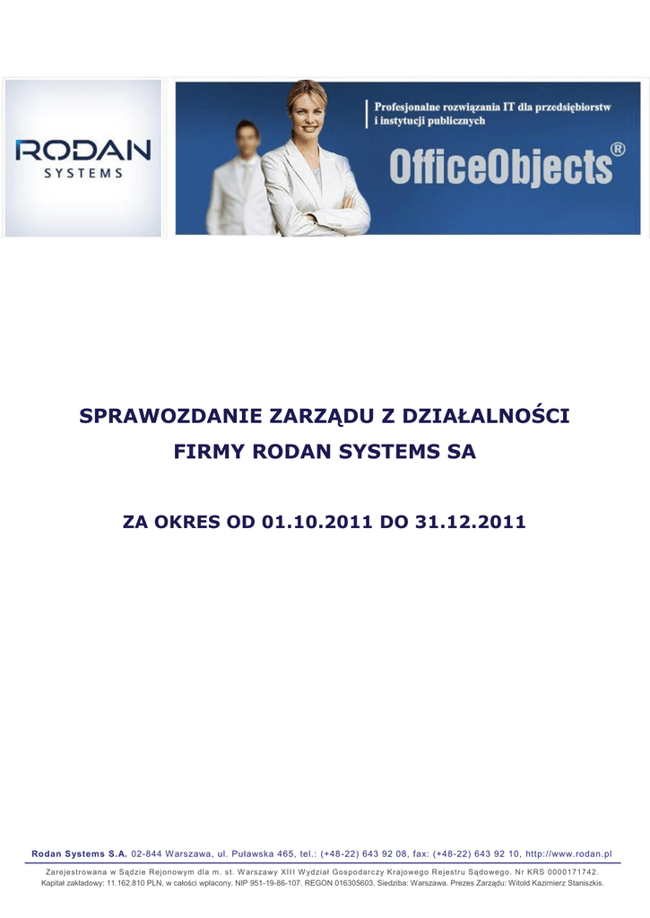 SPRAWOZDANIE ZARZĄDU Z DZIAŁALNOŚCI FIRMY RODAN SYSTEMS SA ZA OKRES OD 01.10.2011 DO 31.12.2011 Rodan Systems S.A. 02-844 W arszawa, ul. Puławska 465, tel.: (+48 -22) 643 92 08, fax: (+48-22) 643 92 10, http://www.rodan.pl Zarejestrowana w Sądzie R ejonowym dla m. s t. W arszawy XI I I W ydział Gos podarc zy Krajowego R ejestru Sądowego. N r KRS 0000171742. Kapitał zakładowy: 11.162.810 PLN, w całości wpłacony. NIP 951-19-86-107. REGON 016305603. Siedziba: Warszawa. Prezes Zarządu: Witold Kazimierz Staniszkis. List Prezesa Zarządu Rodan Systems SA Szanowni Państwo, oddajemy w Państwa ręce raport obejmujący czwarty kwartał 2011. Z punktu widzenia wartości zawartych w tym czasie kontraktów, był to jeden z najbardziej owocnych okresów w historii Rodan Systems. Zawarliśmy kilka ważnych nowych umów, których całkowita wartość wynosi prawie 13,5 mln PLN brutto. W czwartym kwartale 2011 Spółka Rodan Systems w konsorcjum z Polską Wytwórnią Papierów Wartościowych podpisała z Centrum Systemów Informacyjnych Ochrony Zdrowia umowę na „Zaprojektowanie, wykonanie i wdrożenie Systemu P2”. W ramach projektu zbudujemy platformę udostępniania on-line zasobów cyfrowych rejestrów medycznych, która umożliwi obywatelom i przedsiębiorcom korzystanie z informacji, rozproszonych dziś w kilkudziesięciu rejestrach, związanych z ochroną zdrowia, prowadzonych przez jednostki administracji publicznej, samorząd lekarski czy przedsiębiorstwa. Wartość kontraktu to prawie 8,5 miliona złotych. W grudniu 2011 również wspólnie z naszym partnerem – Polską Wytwórnią Papierów Wartościowych, podpisaliśmy umowę z Ministerstwem Transportu, Budownictwa i Gospodarki Morskiej na zaprojektowanie i wdrożenie elektronicznego obiegu dokumentów, dostawę i konfigurację sprzętu, integrację oraz szkolenia. Bardzo się cieszymy, że do grona naszych klientów dołączył także Instytut Medycyny Pracy w Łodzi. Jest to kolejny instytut naukowo-badawczy, który będzie korzystał z platformy zarządzania wiedzą zasobach naukowo-badawczych zbudowanej z wykorzystaniem oprogramowania OfficeObjects ®. Ponadto, w minionym okresie spółka konsekwentnie realizowała założenia strategii zwiększenia udziału w rynku biznesowym czego dowodem jest kontrakt zawarty z liderem rynku AGD i RTV w Polsce na realizację systemu do obsługi procesu obiegu faktur. Sukcesy handlowe, które osiągnęliśmy w IV kwartale 2011 roku odzwierciedlają ciągłą ekspansję Spółki oraz są dowodem dobrego dostosowania oferty rynkowej do potrzeb potencjalnych klientów. Podpisane kontrakty z pewnością będą miały korzystny wpływ na wyniki finansowe Spółki za rok 2012 i lata kolejne. Z wyrazami szacunku, Warszawa, 14 lutego 2012 Rodan Systems S.A. 02-844 W arszawa, ul. Puławska 465, tel.: (+48 -22) 643 92 08, fax: (+48-22) 643 92 10, http://www.rodan.pl Zarejestrowana w Sądzie R ejonowym dla m. s t. W arszawy XI I I W ydział Gos podarc zy Krajowego R ejestru Sądowego. N r KRS 0000171742. Kapitał zakładowy: 11.162.810 PLN, w całości wpłacony. NIP 951-19-86-107. REGON 016305603. Siedziba: Warszawa. Prezes Zarządu: Witold Kazimierz Staniszkis. SPRAWOZDANIE ZA IV KWARTAŁ 2011 ROKU Z DZIAŁALNOŚCI EMITETNTA 1. DANE ORGANIZACYJNE SPÓŁKI Nazwa Spółki: Rodan Systems SA Forma prawna: Spółka Akcyjna Siedziba: ul. Puławska 465, 02 - 844, Warszawa, Polska Telefon: +48 (22) 643 92 08 Faks: +48 (22) 643 92 10 Strona www: www.rodan.pl Data rejestracji: 11.09.2003 r. Sąd: Sąd Rejonowy dla m.st. Warszawy w Warszawie, XIII Wydział Gospodarczy Krajowego Rejestru Sądowego Numer KRS: 0000171742 Regon: 016305603 NIP: 9511986107 2. KAPITAŁ ZAKŁADOWY Kapitał zakładowy Spółki wynosi 11.162.810,00 /jedenaście milionów sto sześćdziesiąt dwa tysiące osiemset dziesięć/ złotych i dzieli się na: a) 3.206.000 /trzy miliony dwieście sześć tysięcy/ akcji zwykłych, na okaziciela serii A o wartości nominalnej 1,00 /jeden/ złoty każda akcja, b) 400.000 /czterysta tysięcy/ akcji zwykłych, na okaziciela serii B o wartości nominalnej 1,00 /jeden/złoty każda akcja, c) 859.124 /osiemset pięćdziesiąt dziewięć tysięcy sto dwadzieścia cztery/ akcji zwykłych, na okaziciela serii C o wartości nominalnej 1,00 /jeden/ złoty każda akcja, d) 6.697.686 /sześć milionów sześćset dziewięćdziesiąt siedem tysięcy sześćset osiemdziesiąt sześć/ akcji zwykłych, na okaziciela serii D o wartości nominalnej 1,00 /jeden/ złoty każda akcja. 3. PODSTAWOWE INFORMACJE NA TEMAT POWIĄZAŃ ORGANIZACYJNYCH LUB KAPITAŁOWYCH SPÓŁKI Podmiot zależny. Spółka OfficeObjects Sp. z o.o. z siedzibą w Sopocie, Systems objęła 100 % udziałów, wnosząc aportem zorganizowaną część w postaci Oddziału Sopot. Spółka OfficeObjects Sp. z o.o. zajmuje produktów i narzędzi programistycznych z rodziny OfficeObjects. zarejestrowana 19 marca 2010. w którym Rodan przedsiębiorstwa się rozwijaniem Spółka została Rodan Systems Sp. z o.o., wspólnikami Spółki Rodan System Sp. z o.o. są Witold Kazimierz Staniszkis i Witold Jeremi Staniszkis, posiadający odpowiednio 75% i 25% łącznej liczby udziałów tej spółki, uprawniających do wykonywania 75% i 25% głosów na Zgromadzeniu Wspólników. Jedynym członkiem Zarządu Spółki Rodan System Sp. z o.o. jest Witold Kazimierz Staniszkis. Rodan Systems S.A. 02-844 W arszawa, ul. Puławska 465, tel.: (+48 -22) 643 92 08, fax: (+48-22) 643 92 10, http://www.rodan.pl Zarejestrowana w Sądzie R ejonowym dla m. s t. W arszawy XI II W ydział Gos podarc zy Krajowego R ejestru Sądowego. N r KRS 0000171742 . Kapitał zakładowy: 11.162.810 PLN, w całości wpłacony. NIP 951-19-86-107. REGON 016305603. Siedziba: Warszawa. Prezes Zarządu: Witold Kazimierz Staniszkis. Pomiędzy Spółką a Rodan System Sp. z o.o. istnieją również powiązania osobowe wynikające z faktu, iż Witold Kazimierz Staniszkis będąc jednym członkiem Z
