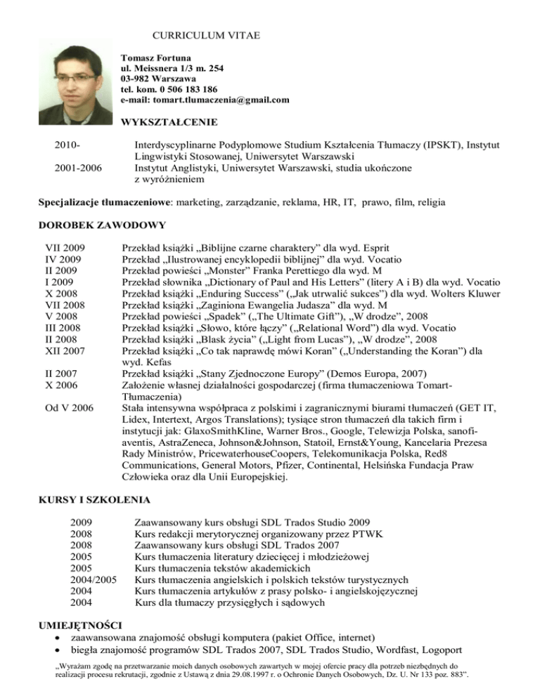 CURRICULUM VITAE Tomasz Fortuna ul. Meissnera 1/3 m. 254 03-982 Warszawa tel. kom. 0 506 183 186 e-mail: [email protected] WYKSZTAŁCENIE 20102001-2006 Interdyscyplinarne Podyplomowe Studium Kształcenia Tłumaczy (IPSKT), Instytut Lingwistyki Stosowanej, Uniwersytet Warszawski Instytut Anglistyki, Uniwersytet Warszawski, studia ukończone z wyróżnieniem Specjalizacje tłumaczeniowe: marketing, zarządzanie, reklama, HR, IT, prawo, film, religia DOROBEK ZAWODOWY VII 2009 IV 2009 II 2009 I 2009 X 2008 VII 2008 V 2008 III 2008 II 2008 XII 2007 II 2007 X 2006 Od V 2006 Przekład książki „Biblijne czarne charaktery” dla wyd. Esprit Przekład „Ilustrowanej encyklopedii biblijnej” dla wyd. Vocatio Przekład powieści „Monster” Franka Perettiego dla wyd. M Przekład słownika „Dictionary of Paul and His Letters” (litery A i B) dla wyd. Vocatio Przekład książki „Enduring Success” („Jak utrwalić sukces”) dla wyd. Wolters Kluwer Przekład książki „Zaginiona Ewangelia Judasza” dla wyd. M Przekład powieści „Spadek” („The Ultimate Gift”), „W drodze”, 2008 Przekład książki „Słowo, które łączy” („Relational Word”) dla wyd. Vocatio Przekład książki „Blask życia” („Light from Lucas”), „W drodze”, 2008 Przekład książki „Co tak naprawdę mówi Koran” („Understanding the Koran”) dla wyd. Kefas Przekład książki „Stany Zjednoczone Europy” (Demos Europa, 2007) Założenie własnej działalności gospodarczej (firma tłumaczeniowa TomartTłumaczenia) Stała intensywna współpraca z polskimi i zagranicznymi biurami tłumaczeń (GET IT, Lidex, Intertext, Argos Translations); tysiące stron tłumaczeń dla takich firm i instytucji jak: GlaxoSmithKline, Warner Bros., Google, Telewizja Polska, sanofiaventis, AstraZeneca, Johnson&Johnson, Statoil, Ernst&Young, Kancelaria Prezesa Rady Ministrów, PricewaterhouseCoopers, Telekomunikacja Polska, Red8 Communications, General Motors, Pfizer, Continental, Helsińska Fundacja Praw Człowieka oraz dla Unii Europejskiej. KURSY I SZKOLENIA 2009 2008 2008 2005 2005 2004/2005 2004 2004 Zaawansowany kurs obsługi SDL Trados Studio 2009 Kurs redakcji merytorycznej organizowany przez PTWK Zaawansowany kurs obsługi SDL Trados 2007 Kurs tłumaczenia literatury dziecięcej i młodzieżowej Kurs tłumaczenia tekstów akademickich Kurs tłumaczenia angielskich i polskich tekstów turystycznych Kurs tłumaczenia artykułów z prasy polsko- i angielskojęzycznej Kurs dla tłumaczy przysięgłych i sądowych UMIEJĘTNOŚCI · zaawansowana znajomość obsługi komputera (pakiet Office, internet) · biegła znajomość programów SDL Trados 2007, SDL Trados Studio, Wordfast, Logoport „Wyrażam zgodę na przetwarzanie moich danych osobowych zawartych w mojej ofercie pracy dla potrzeb niezbędnych do realizacji procesu rekrutacji, zgodnie z Ustawą z dnia 29.08.1997 r. o Ochronie Danych Osobowych, Dz. U. Nr 133 poz. 883”.