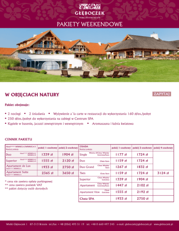 PAKIETY WEEKENDOWE W OBJĘCIACH NATURY Pakiet obejmuje: • 2 noclegi • 2 śniadania • Wyżywienie a`la carte w restauracji do wykorzystania 160 zł/os./pobyt • 250 zł/os./pobyt do wykorzystania na zabiegi w Centrum SPA • Kąpiele w basenie, jacuzzi zewnętrznym i wewnętrznym • Aromasauna i łaźnia kwiatowa Hotel**** WINNICA I/WINNICA II OSADA Rodzaj pokoju Rodzaj pokoju Winnica II/Chata Wiejska/ Gościnna/Stara Duo Hotel**** WINNICA I/ WINNICA II 1339 zł 1904 zł Single Superior Hotel**** WINNICA I/ WINNICA II 1555 zł 2120 zł Duo 1933 zł 2750 zł Duo Grand 2365 zł 3650 zł Twin Apartament de Lux Hotel**** WINNICA I Apartament Suite Hotel**** WINNICA I * cena nie zawiera opłaty parkingowej ** cena zawiera podatek VAT ** pakiet dotyczy osób dorosłych Chata Wiejska/ Stara 1177 zł 1724 zł 1159 zł 1724 zł 1267 zł 1832 zł 1159 zł 1724 zł Superior Chata Wiejska/ Gościnna 1339 zł 1904 zł Apartament Chata Wiejska/ Gościnna/Stara 1447 zł 2102 zł Chata Gościnna 1555 zł 2192 zł 1933 zł 2750 zł Apartament View 3124 zł Wielki Głęboczek 1 87-313 Brzozie tel./fax: + 48 (056) 493 51 19 tel. +48 0 660 497 245 e-mail: [email protected] www.gleboczek.pl WEEKEND Z PINOTAGE Pakiet obejmuje: • • • Dwa noclegi • Dwa śniadania • Wyżywienie a`la carte w restauracji do wykorzystania 160 zł/os./pobyt Kąpiele w basenie, jacuzzi zewnętrznym i wewnętrznym • Aromasauna i łaźnia kwiatowa Specjalne przygotowany pakiet zabiegów winnych: DLA PAŃ: DZIEŃ I: • Łaźnia parowa • Kąpiel w ekstrakcie winnym połączony z peelingiem winogronowym oraz aplikacją mleczka do ciała Cabernet DZIEŃ II: • Łaźnia parowa • Wybrany zabieg na ciało TheraVine z maską (w zabiegu uczestniczą: peeling, masaż, maska na ciało oraz mleczko do ciała Cabernet) • zabieg w Alfaswerze DZIEŃ III: • Wybrany zabieg na twarz podstawowy z ampułką • Kropka nad „i” (delikatny makijaż) DLA PANÓW: DZIEŃ I: • Łaźnia parowa • Kąpiel w winie połączona z peelingiem winogronowym oraz aplikacją mleczka do ciała Cabernet DZIEŃ II: • Łaźnia parowa • Wybrany zabieg na ciało TheraVine z maską (w zabiegu uczestniczą: peeling, masaż, maska na ciało oraz mleczko do ciała Cabernet) • zabieg w Alfaswerze • Zabieg oczyszczająco - energetyzujący na twarz Homme Men Hotel**** WINNICA I/WINNICA II OSADA Rodzaj pokoju Rodzaj pokoju Duo Hotel**** WINNICA I/ WINNICA II Superior Hotel**** WINNICA I/ WINNICA II Apartament de Lux Hotel**** WINNICA I Apartament Suite Hotel**** WINNICA I Winnica II/Chata Wiejska/ Gościnna/Stara 1789 zł 2804 zł Single 2005 zł 3020 zł Duo 2383 zł 3650 zł Duo Grand 2815 zł 4550 zł Twin * cena nie zawiera opłaty parkingowej ** cena zawiera podatek VAT ** pakiet dotyczy osób dorosłych Chata Wiejska/ Stara 1627 zł 2624 zł 1609 zł 2624 zł 1717 zł 2732 zł 1609 zł 2624 zł Superior Chata Wiejska/ Gościnna 1789 zł 2804 zł Apartament Chata Wiejska/ Gościnna/Stara 1897 zł 3002 zł Chata Gościnna 2005 zł 3092 zł 2383 zł 3650 zł Apartament View 4924 zł Wielki Głęboczek 1 87-313 Brzozie tel./fax: + 48 (056) 493 51 19 tel. +48 0 660 497 245 e-mail: [email protected] www.gleboczek.pl RAJSKA ROZKOSZ Pakiet obejmuje: • • Dwa noclegi • Dwa śniadania w tym jedno serwowane do łóżka Romantyczną kolację w blasku świec z butelką wina - wybór spośród dwóch pozycji: ZUPY: Krem z leśnych grzybów lub Zupa kokosowa DANIE GŁÓWNE: Sznycel cielęcy lub Mule w muszli DESER: Mus Czekoladowy lub Lody na malinach • Wyżywienie a`la carte w restauracji - do wykorzystania 160 zł / 2 os./ pobyt • Pakiet SPA dla Niej i dla Niego „SMAK PINOTAGE” (Jest to wyjątkowy rytuał w którym uczestniczą: Łaźnia Parowa, Kąpiel w Winie, Masaż, Nawilżająca Maska Winogronowa na Ciało • Nauka masażu dla dwojga • Kąpiele w basenie, jacuzzi zewnętrznym i wewnętrznym • Aromasauna i łaźnia kwiatowa Hotel**** WINNICA I/WINNICA II Rodzaj pokoju Rodzaj pokoju Duo Hotel**** WINNICA I/ WINNICA II 2294 zł Superior Hotel**** WINNICA I/ WINNICA II 2510 zł Apartament de Lux Hotel**** WINNICA I Apartament Suite Hotel**** WINNICA I Single King Winnica II/Chata Wiejska/ Gościnna/Stara 2114 zł 2114 zł Chata Wiejska/ Stara 3140 zł 4040 zł 2222 zł 2114 zł * cena nie zawiera opłaty parkingowej ** cena zawiera podatek VAT *** pakiet dotyczy osób dorosłych Apartament View Chata Wiejska/ Gościnna/Stara 2294 zł Chata Wiejska/ Stara 2492 zł Chata Gościnna 2582 zł 3140 zł Wielki Głęboczek 1 87-313 Brzozie tel./fax: + 48 (056) 493 51 19 tel. +48 0 660 497 245 e-mail: [email protected] www.gleboczek.pl