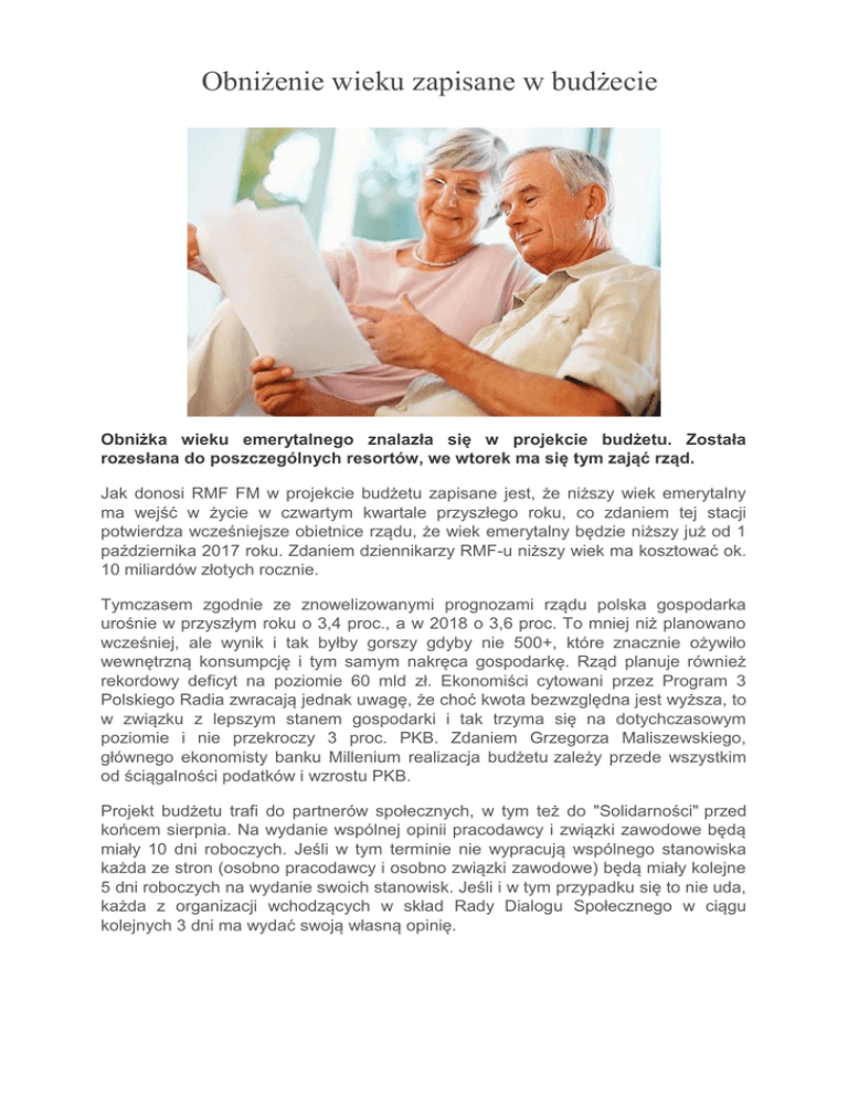 Obniżenie wieku zapisane w budżecie Obniżka wieku emerytalnego znalazła się w projekcie budżetu. Została rozesłana do poszczególnych resortów, we wtorek ma się tym zająć rząd. Jak donosi RMF FM w projekcie budżetu zapisane jest, że niższy wiek emerytalny ma wejść w życie w czwartym kwartale przyszłego roku, co zdaniem tej stacji potwierdza wcześniejsze obietnice rządu, że wiek emerytalny będzie niższy już od 1 października 2017 roku. Zdaniem dziennikarzy RMF-u niższy wiek ma kosztować ok. 10 miliardów złotych rocznie. Tymczasem zgodnie ze znowelizowanymi prognozami rządu polska gospodarka urośnie w przyszłym roku o 3,4 proc., a w 2018 o 3,6 proc. To mniej niż planowano wcześniej, ale wynik i tak byłby gorszy gdyby nie 500+, które znacznie ożywiło wewnętrzną konsumpcję i tym samym nakręca gospodarkę. Rząd planuje również rekordowy deficyt na poziomie 60 mld zł. Ekonomiści cytowani przez Program 3 Polskiego Radia zwracają jednak uwagę, że choć kwota bezwzględna jest wyższa, to w związku z lepszym stanem gospodarki i tak trzyma się na dotychczasowym poziomie i nie przekroczy 3 proc. PKB. Zdaniem Grzegorza Maliszewskiego, głównego ekonomisty banku Millenium realizacja budżetu zależy przede wszystkim od ściągalności podatków i wzrostu PKB. Projekt budżetu trafi do partnerów społecznych, w tym też do "Solidarności" przed końcem sierpnia. Na wydanie wspólnej opinii pracodawcy i związki zawodowe będą miały 10 dni roboczych. Jeśli w tym terminie nie wypracują wspólnego stanowiska każda ze stron (osobno pracodawcy i osobno związki zawodowe) będą miały kolejne 5 dni roboczych na wydanie swoich stanowisk. Jeśli i w tym przypadku się to nie uda, każda z organizacji wchodzących w skład Rady Dialogu Społecznego w ciągu kolejnych 3 dni ma wydać swoją własną opinię.