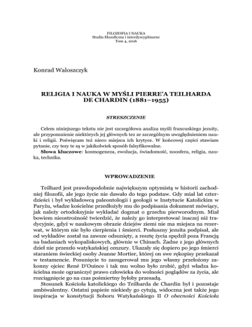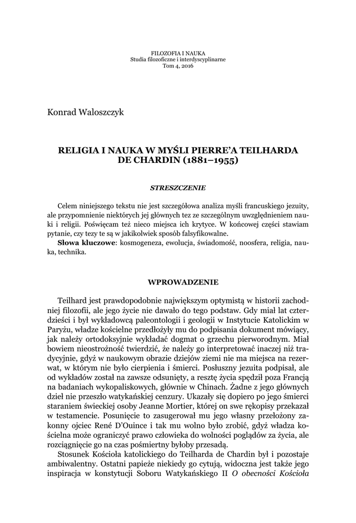 FILOZOFIA I NAUKA Studia filozoficzne i interdyscyplinarne Tom 4, 2016 Konrad Waloszczyk RELIGIA I NAUKA W MYŚLI PIERRE’A TEILHARDA DE CHARDIN (1881–1955) STRESZCZENIE Celem niniejszego tekstu nie jest szczegółowa analiza myśli francuskiego jezuity, ale przypomnienie niektórych jej głównych tez ze szczególnym uwzględnieniem nauki i religii. Poświęcam też nieco miejsca ich krytyce. W końcowej części stawiam pytanie, czy tezy te są w jakikolwiek sposób falsyfikowalne. Słowa kluczowe: kosmogeneza, ewolucja, świadomość, noosfera, religia, nauka, technika. WPROWADZENIE Teilhard jest prawdopodobnie największym optymistą w historii zachodniej filozofii, ale jego życie nie dawało do tego podstaw. Gdy miał lat czterdzieści i był wykładowcą paleontologii i geologii w Instytucie Katolickim w Paryżu, władze kościelne przedłożyły mu do podpisania dokument mówiący, jak należy ortodoksyjnie wykładać dogmat o grzechu pierworodnym. Miał bowiem nieostrożność twierdzić, że należy go interpretować inaczej niż tradycyjnie, gdyż w naukowym obrazie dziejów ziemi nie ma miejsca na rezerwat, w którym nie było cierpienia i śmierci. Posłuszny jezuita podpisał, ale od wykładów został na zawsze odsunięty, a resztę życia spędził poza Francją na badaniach wykopaliskowych, głównie w Chinach. Żadne z jego głównych dzieł nie przeszło watykańskiej cenzury. Ukazały się dopiero po jego śmierci staraniem świeckiej osoby Jeanne Mortier, której on swe rękopisy przekazał w testamencie. Posunięcie to zasugerował mu jego własny przełożony zakonny ojciec René D’Ouince i tak mu wolno było zrobić, gdyż władza kościelna może ograniczyć prawo człowieka do wolności poglądów za życia, ale rozciągnięcie go na czas pośmiertny byłoby przesadą. Stosunek Kościoła katolickiego do Teilharda de Chardin był i pozostaje ambiwalentny. Ostatni papieże niekiedy go cytują, widoczna jest także jego inspiracja w konstytucji Soboru Watykańskiego II O obecności Kościoła 82 Konrad Waloszczyk w świecie współczesnym (1965). Ale jak z jednej strony daleko do uznania go za heretyka, tak z drugiej strony daleko do mianowania go myślicielem reprezentatywnym Kościoła. Dystans, jaki Kościół wobec niego zachowuje, jest zrozumiały ze względu na prawie dwa tysiące lat odmiennej tradycji. Z kolei uniwersalizm i niezależność myśli Teilharda zdają się czynić z niego postać nie tyle kapłana Kościoła, ile kapłana ludzkości. PODSTAWOWE ZAŁOŻENIA MYŚLI TEILHARDOWSKIEJ Kosmos nie jest zbiorem bytów, głosi francuski myśliciel, lecz organiczną całością. „Ponad ogółem wzajemnie powiązanych bytów i zjawisk niewyraźnie dostrzegam czy też przeczuwam jakąś rzeczywistość globalną, której natura polega na tym, że jest bardziej konieczna, trwalsza, bogatsza, pewniejsza niż jakakolwiek rzecz poszczególna w niej zawarta” (Pisma t. 2, 22). Każdy atom ma powiązania z całym wszechświatem i nic nie wkracza w sferę istnienia jak tylko na drodze genezy, w której rodzicem jest cała przeszłość kosmosu. Żadnego bytu nie można by przesunąć w czasie i przestrzeni nie naruszając całej sieci jego kosmicznych powiązań. Tworzywem kosmosu, twierdzi dalej Teilhard, nie jest czysta materia, ani czysty duch, lecz duchomateria (Pisma t. 2, 60). Materia jest wielością, a duch jednością osiąganą na podłożu materii. Im więcej jedności, tym więcej ducha we wszechświecie. Materia jest rodzicielką ducha, ale na poziomie człowieka duch zwrotnie oddziałuje na swoje materialne podłoże i zyskuje nad nim przewagę, w ten sposób kierując dalszym biegiem ewolucji. Ta bowiem w coraz większym stopniu staje się samoewolucją. Mózg stwarza świadomość, ale świadomość coraz bardziej opanowuje mózg i to w podwójnym sensie. Najpierw w sensie indywidualnym. Myśliciel z entuzjazmem witał początki badań nad mózgiem, a dziś cieszyłby się z szeroko zakrojonych badań tego rodzaju prowadzonych w Unii Europejskiej i Stanach Zjednoczonych pod nazwą Human Brain Project. Bardziej jednak akcentował znaczenie zbiorowego mózgu ludzkości, który dopiero się kształtuje, i wiedzy przez niego stwarzanej, którą nazwał noosferą. Kolejna teza głosi, że ewolucja kosmosu (kosmogeneza) ma charakter zbieżny, to znaczy, że jego tworzywo zwija się w sobie według powtarzającego się na wszystkich jego poziomach prawa złożoności – świadomości (nazywanego też centrokompleksyfikacją). Prawo to mówi, że świadomość, inaczej duch, wzrasta proporcjonalnie do złożoności materialnego tworzywa wszechświata. Myśl, że wszechświat się zwija, zostaje wzmocniona wartościującą tezą, że wyższa świadomość jest większym dobrem niż niższa. Wszechświat zatem dąży do czegoś lepszego, gdyż u kresu jego dotychczasowej ewolucji widzimy świadomość ludzką, najwyższą ze znanych. Jest to założenie intuicyjne, nie wszystkich przekonujące. Wynika z niego, że Religia i nauka w myśli Pierre’a Teilharda de Chardin (1881–1955) 83 wszechświat jest dobry, sensowny, godzien zaufania, „nie może zmylić drogi, ani zatrzymać się”. Jego ewolucja nie jest ślepa, cykliczna czy chaotyczna, ale ma określony kierunek: Skoro dotychczas przebiegał pomyślnie niewiarygodnie trudny proces, w którego w wyniku myśl ludzka pojawiła się we wszechświecie sprawiającym wrażenie niepojętej plątaniny przypadków i niepowodzeń, to znaczy, że w głębi kieruje nim moc niepodzielnie władająca wszystkimi elementami, co się na ten świat składają (Pisma t. 1, 113). Powyższe założenia spotykają się z krytyką niektórych współczesnych filozofujących biologów, takich jak Peter Medawar, Richard Dawkins, Kunicki – Goldfinger, Zdzisława Piątek. Niżej przytoczę ich racje i postaram się na nie odpowiedzieć. DWIE EKSTRAPOLACJE PRAWA ZŁOŻONOŚCI–ŚWIADOMOŚCI Francuski jezuita uważ