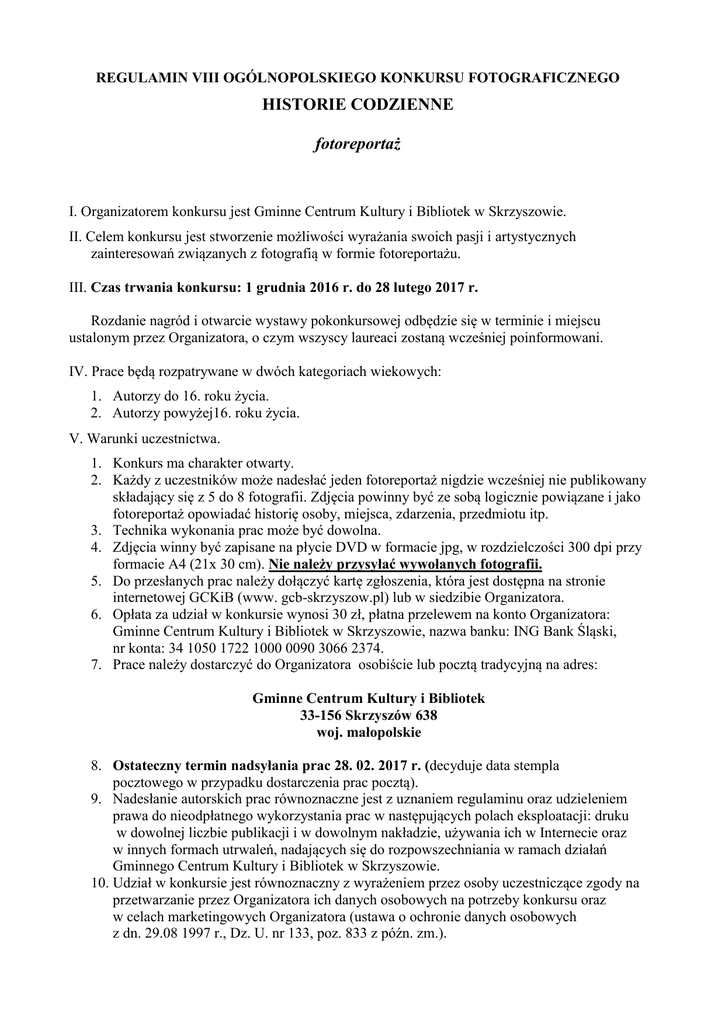 REGULAMIN VIII OGÓLNOPOLSKIEGO KONKURSU FOTOGRAFICZNEGO HISTORIE CODZIENNE fotoreportaż I. Organizatorem konkursu jest Gminne Centrum Kultury i Bibliotek w Skrzyszowie. II. Celem konkursu jest stworzenie możliwości wyrażania swoich pasji i artystycznych zainteresowań związanych z fotografią w formie fotoreportażu. III. Czas trwania konkursu: 1 grudnia 2016 r. do 28 lutego 2017 r. Rozdanie nagród i otwarcie wystawy pokonkursowej odbędzie się w terminie i miejscu ustalonym przez Organizatora, o czym wszyscy laureaci zostaną wcześniej poinformowani. IV. Prace będą rozpatrywane w dwóch kategoriach wiekowych: 1. Autorzy do 16. roku życia. 2. Autorzy powyżej16. roku życia. V. Warunki uczestnictwa. 1. Konkurs ma charakter otwarty. 2. Każdy z uczestników może nadesłać jeden fotoreportaż nigdzie wcześniej nie publikowany składający się z 5 do 8 fotografii. Zdjęcia powinny być ze sobą logicznie powiązane i jako fotoreportaż opowiadać historię osoby, miejsca, zdarzenia, przedmiotu itp. 3. Technika wykonania prac może być dowolna. 4. Zdjęcia winny być zapisane na płycie DVD w formacie jpg, w rozdzielczości 300 dpi przy formacie A4 (21x 30 cm). Nie należy przysyłać wywołanych fotografii. 5. Do przesłanych prac należy dołączyć kartę zgłoszenia, która jest dostępna na stronie internetowej GCKiB (www. gcb-skrzyszow.pl) lub w siedzibie Organizatora. 6. Opłata za udział w konkursie wynosi 30 zł, płatna przelewem na konto Organizatora: Gminne Centrum Kultury i Bibliotek w Skrzyszowie, nazwa banku: ING Bank Śląski, nr konta: 34 1050 1722 1000 0090 3066 2374. 7. Prace należy dostarczyć do Organizatora osobiście lub pocztą tradycyjną na adres: Gminne Centrum Kultury i Bibliotek 33-156 Skrzyszów 638 woj. małopolskie 8. Ostateczny termin nadsyłania prac 28. 02. 2017 r. (decyduje data stempla pocztowego w przypadku dostarczenia prac pocztą). 9. Nadesłanie autorskich prac równoznaczne jest z uznaniem regulaminu oraz udzieleniem prawa do nieodpłatnego wykorzystania prac w następujących polach eksploatacji: druku w dowolnej liczbie publikacji i w dowolnym nakładzie, używania ich w Internecie oraz w innych formach utrwaleń, nadających się do rozpowszechniania w ramach działań Gminnego Centrum Kultury i Bibliotek w Skrzyszowie. 10. Udział w konkursie jest równoznaczny z wyrażeniem przez osoby uczestniczące zgody na przetwarzanie przez Organizatora ich danych osobowych na potrzeby konkursu oraz w celach marketingowych Organizatora (ustawa o ochronie danych osobowych z dn. 29.08 1997 r., Dz. U. nr 133, poz. 833 z późn. zm.). VI. Nagrody. 1. Organizator przewiduje po trzy nagrody pieniężne w każdej kategorii: I miejsce -1000 zł, II miejsce -700 zł, III miejsce -500 zł 2. Oceny prac i wyłonienia zwycięzców dokona jury powołane przez Organizatora. 3. Jury zastrzega sobie prawo do innego podziału nagród. 4. Decyzje jury są ostateczne. 5. Wszyscy laureaci zostaną powiadomieni o werdykcie jury telefonicznie lub pocztą elektroniczną. 6. Nagrody zostaną przekazane laureatom w okresie 15 dni od daty ogłoszenia wyników konkursu. 7. Nagrodzone prace będą zaprezentowane w publikacji wydanej z tej okazji oraz zamieszczone na stronie internetowej Gminnego Centrum Kultury i Bibliotek w Skrzyszowie: www.gcb-skrzyszow.pl Kontakt w sprawie Konkursu : Gminne Centrum Kultury i Bibliotek, 33-156 Skrzyszów 638, tel. 14 674-55-08, e-mail: [email protected]
