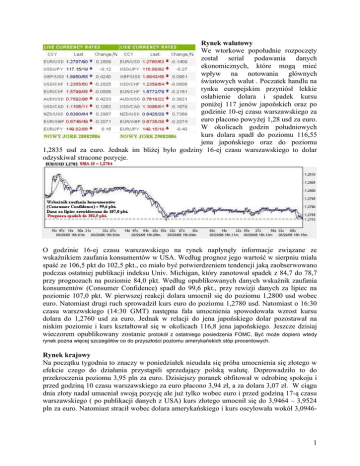 Rynek walutowy We wtorkowe popołudnie rozpoczęty został serial podawania danych ekonomicznych, które mogą mieć wpływ na notowania głównych światowych walut . Poczatek handlu na rynku europejskim przyniósł lekkie osłabienie dolara i spadek kursu poniżej 117 jenów japońskich oraz po godzinie 10-ej czasu warszawskiego za euro płacono powyżej 1,28 usd za euro. W okolicach godzin południowych kurs dolara spadł do poziomu 116,55 jena japońskiego oraz do poziomu 1,2835 usd za euro. Jednak im bliżej było godziny 16-ej czasu warszawskiego to dolar odzyskiwał stracone pozycje. O godzinie 16-ej czasu warszawskiego na rynek napłynęły informacje związane ze wskaźnikiem zaufania konsumentów w USA. Według prognoz jego wartość w sierpniu miała spaść ze 106,5 pkt do 102,5 pkt., co miało być potwierdzeniem tendencji jaką zaobserwowano podczas ostatniej publikacji indeksu Univ. Michigan, który zanotował spadek z 84,7 do 78,7 przy prognozach na poziomie 84,0 pkt. Według opublikowanych danych wskaźnik zaufania konsumentów (Consumer Confidence) spadł do 99,6 pkt., przy rewizji danych za lipiec na poziomie 107,0 pkt. W pierwszej reakcji dolara umocnił się do poziomu 1,2800 usd wobec euro. Natomiast drugi ruch sprowadził kurs euro do poziomu 1,2780 usd. Natomiast o 16:30 czasu warszwskiego (14:30 GMT) następna fala umocnienia spowodowała wzrost kursu dolara do 1,2760 usd za euro. Jednak w relacji do jena japońskiego dolar pozostawał na niskim poziomie i kurs kształtował się w okolicach 116,8 jena japońskiego. Jeszcze dzisiaj wieczorem opublikowany zostanie protokół z ostatniego posiedzenia FOMC, Być może dopiero wtedy rynek pozna więcej szczegółów co do przyszłości poziomu amerykańskich stóp procentowych. Rynek krajowy Na początku tygodnia to znaczy w poniedziałek nieudała się próba umocnienia się złotego w efekcie czego do działania przystąpili sprzedający polską walutę. Doprowadziło to do przekroczenia poziomu 3,95 pln za euro. Dzisiejszy poranek obfitował w odrobinę spokoju i przed godziną 10 czasu warszawskiego za euro płacono 3,94 zł, a za dolara 3,07 zł. W ciągu dnia złoty nadal umacniał swoją pozycję ale już tylko wobec euro i przed godziną 17-ą czasu warszawskiego ( po publikacji danych z USA) kurs złotego umocnił się do 3,9464 – 3,9524 pln za euro. Natomiast stracił wobec dolara amerykańskiego i kurs oscylowała wokół 3,0946- 1 3,0986 pln. Wiele wskazuje, że do godziny 20-ej czasu warszawskiego może dojść do przekroczenia poziomu 3,10 za dolara. AF [email protected] AF® Treść powyższej analizy jest tylko i wyłącznie wyrazem osobistych poglądów jej autora i nie stanowi "rekomendacji" w rozumieniu przepisów Rozporządzenia Ministra Finansów z dnia 19 października 2005 r. w sprawie informacji stanowiących rekomendacje dotyczące instrumentów finansowych, lub ich emitentów (Dz. U. z 2005 r. Nr 206, poz. 1715). Zgodnie z powyższym www.aii.pl oraz autor nie ponoszą jakiejkolwiek odpowiedzialności za decyzje inwestycyjne podejmowane na podstawie niniejszych komentarzy i analiz. 2