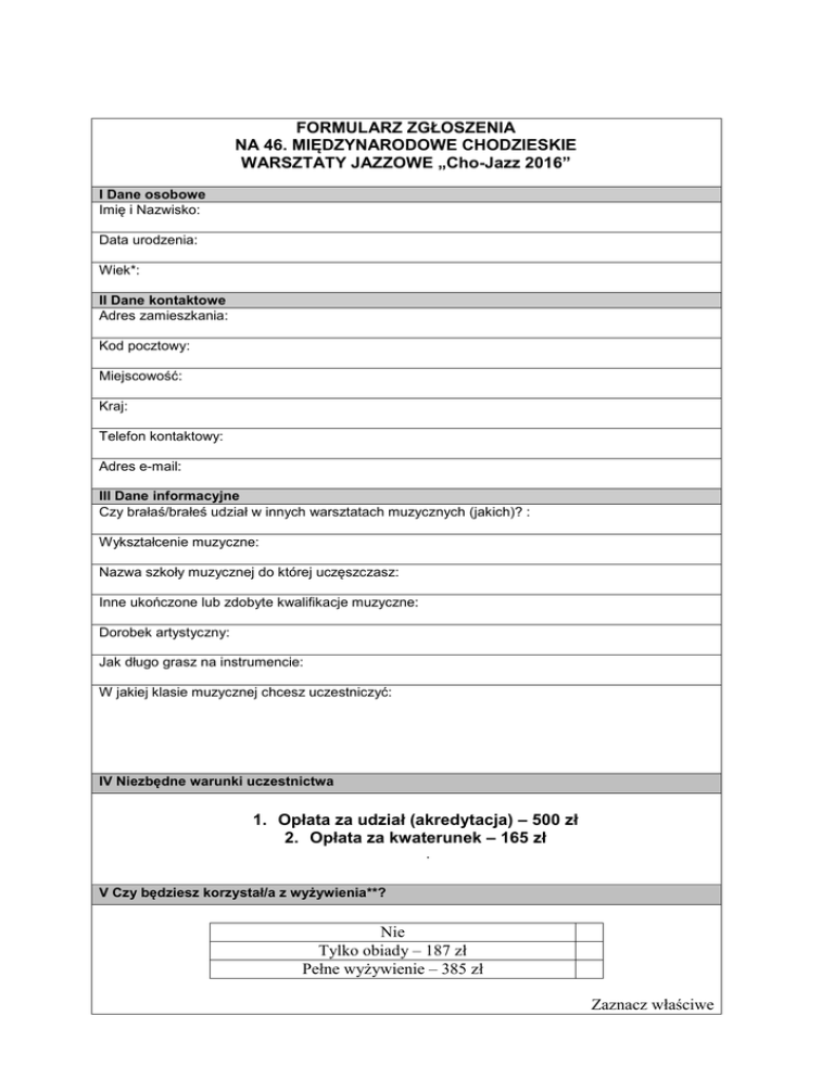 FORMULARZ ZGŁOSZENIA NA 46. MIĘDZYNARODOWE CHODZIESKIE WARSZTATY JAZZOWE „Cho-Jazz 2016” I Dane osobowe Imię i Nazwisko: Data urodzenia: Wiek*: II Dane kontaktowe Adres zamieszkania: Kod pocztowy: Miejscowość: Kraj: Telefon kontaktowy: Adres e-mail: III Dane informacyjne Czy brałaś/brałeś udział w innych warsztatach muzycznych (jakich)? : Wykształcenie muzyczne: Nazwa szkoły muzycznej do której uczęszczasz: Inne ukończone lub zdobyte kwalifikacje muzyczne: Dorobek artystyczny: Jak długo grasz na instrumencie: W jakiej klasie muzycznej chcesz uczestniczyć: IV Niezbędne warunki uczestnictwa 1. Opłata za udział (akredytacja) – 500 zł 2. Opłata za kwaterunek – 165 zł . V Czy będziesz korzystał/a z wyżywienia**? Nie Tylko obiady – 187 zł Pełne wyżywienie – 385 zł Zaznacz właściwe Uwagi: VI Informacje dodatkowe: Przyjazd uczestników w środę 27 lipca, do godziny 14:00 Wyjazd uczestników w niedzielę 07 sierpnia, do godziny 12:00 Prosimy o zabranie dowodu tożsamości, legitymacji ubezpieczeniowej i instrumentu. Kartę uczestnictwa należy przesłać do 01-07-2016 Po otrzymaniu potwierdzenia udziału w Warsztatach (do dnia 08-07-2016), należy do 20-07-2016 przelać opłatę za udział w Warsztatach i zakwaterowanie, na adres: Chodzieski Dom Kultury 64-800 Chodzież ul. Strzelecka 15 Tel. 067/ 282 05 13, fax 067/ 282 00 30, tel. kom. +48 663 300 813 lub +48 604 442 707, www.chdk.com.pl, www.chojazz.com, [email protected] VII Przelewy Przelew na konto Warsztatów Jazzowych, nr konta: BZ WBK o/Chodzież 71 1090 1317 0000 0001 0242 6613 z podaniem nazwiska uczestnika. * W przypadku osób niepełnoletnich prosimy o pisemną zgodę rodziców lub prawnych opiekunów na udział w Warsztatach. Także z podaniem kontaktu telefonicznego !!! Data: ** Opłatę za wyżywienie (nieobowiązkowe) należy uiścić gotówką na miejscu !!! Podpis: W celu akceptacji zgłoszenia przez organizatora, prosimy o pozostawienia poniższych pozycji bez zmian !!! Wyrażam zgodę na przetwarzanie moich danych osobowych zgodnie z ustawą z dnia 29.08.1997 r. o ochronie danych osobowych (tekst jedn. Dz. U. z 2002 r., Nr 101, poz. 926 z późn. zm.) dla potrzeb "46. Międzynarodowych Chodzieskich Warsztatów Jazzowych ChoJazz 2016" przez Chodzieski Dom Kultury z siedzibą przy ul. Strzelecka 15, 64-800 Chodzież. Jednocześnie oświadczam, że zostałem/am poinformowany/a o możliwości dostępu do treści swoich danych i ich poprawiania oraz że wszystkie dane zawarte w formularzu zgłoszeniowym podałem/am dobrowolnie. Organizator zastrzega sobie prawo do wykorzystania materiałów filmowych, fonograficznych i fotograficznych powstałych w czasie Warsztatów. Organizator zachowuje prawa autorskie do nich, a uczestnicy wyrażają zgodę na nieodpłatną publikację swojego wizerunku i wykonań w celach promocji Warsztatów.