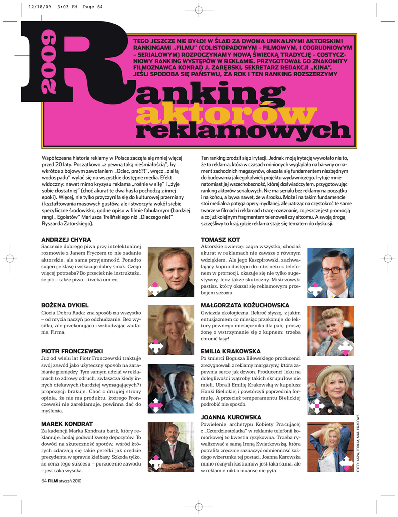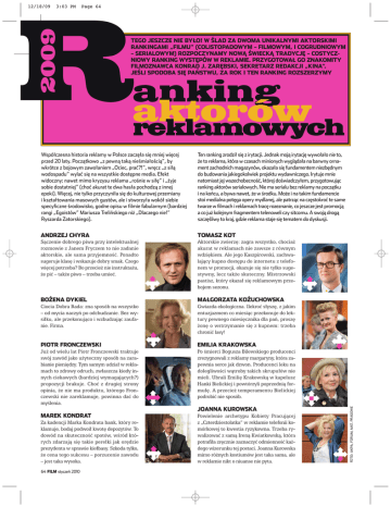 12/18/09 3:03 PM Page 64 anking aktorów reklamowych Współczesna historia reklamy w Polsce zaczęła się mniej więcej przed 20 laty. Początkowo „z pewną taką nieśmiałością”, by wkrótce z bojowym zawołaniem „Ociec, prać?!”, wręcz „z siłą wodospadu” wylać się na wszystkie dostępne media. Efekt widoczny: nawet mimo kryzysu reklama „rośnie w siłę” i „żyje sobie dostatniej” (choć akurat te dwa hasła pochodzą z innej epoki). Więcej, nie tylko przyczyniła się do kulturowej przemiany i kształtowania masowych gustów, ale i stworzyła wokół siebie specyficzne środowisko, godne opisu w filmie fabularnym (bardziej rangi „Egoistów” Mariusza Trelińskiego niż „Dlaczego nie!” Ryszarda Zatorskiego). Ten ranking zrodził się z irytacji. Jednak moją irytację wywołało nie to, że to reklama, która w czasach minionych wyglądała na barwny ornament zachodnich magazynów, okazała się fundamentem niezbędnym do budowania jakiegokolwiek projektu wydawniczego. Irytuje mnie natomiast jej wszechobecność, której doświadczyłem, przygotowując ranking aktorów serialowych. Nie ma serialu bez reklamy na początku i na końcu, a bywa nawet, że w środku. Może i na takim fundamencie stoi medialna potęga opery mydlanej, ale patrząc na częstokroć te same twarze w filmach i reklamach tracę rozeznanie, co jeszcze jest promocją a co już kolejnym fragmentem telenoweli czy sitcomu. A swoją drogą szczęśliwy to kraj, gdzie reklama staje się tematem do dyskusji. ANDRZEJ CHYRA Sàczenie dobrego piwa przy intelektualnej rozmowie z Janem Fryczem to nie zadanie aktorskie, ale sama przyjemnoÊç. Ponadto sugeruje klas´ i wskazuje dobry smak. Czego wi´cej potrzeba? Bo przecie˝ nie instrukta˝u, ˝e piç – tak˝e piwo – trzeba umieç. TOMASZ KOT Aktorskie zwierz´: zagra wszystko, chocia˝ akurat w reklamach nie zawsze z równym wdzi´kiem. Ale jego Kaszpirowski, zachwalajàcy kupno dost´pu do internetu z telefonem w promocji, okazuje si´ nie tylko sugestywny, lecz tak˝e skuteczny. Mistrzowski pastisz, który okaza∏ si´ reklamowym przebojem sezonu. BOŻENA DYKIEL Ciocia Dobra Rada: zna sposób na wszystko – od mycia naczyƒ po odchudzanie. Bez wysi∏ku, ale przekonujàco i wzbudzajàc zaufanie. Firma. MAŁGORZATA KOŻUCHOWSKA Gwiazda ekologiczna. Ilekroç s∏ysz´, z jakim entuzjazmem co miesiàc przekonuje do lektury pewnego miesi´cznika dla paƒ, prosz´ ˝on´ o wstrzymanie si´ z kupnem: trzeba chroniç lasy! PIOTR FRONCZEWSKI Ju˝ od wielu lat Piotr Fronczewski traktuje swój zawód jako u˝yteczny sposób na zarabianie pieni´dzy. Tym samym udzia∏ w reklamach to zdrowy odruch, zw∏aszcza kiedy innych ciekawych (bardziej wymagajàcych?) propozycji brakuje. Choç z drugiej strony opinia, ˝e nie ma produktu, którego Fronczewski nie zareklamuje, powinna daç do myÊlenia. EMILIA KRAKOWSKA Po Êmierci Bogusza Bilewskiego producenci zrezygnowali z reklamy margaryny, która zapewnia serce jak dzwon. Producenci leku na dolegliwoÊci wàtroby takich skrupu∏ów nie mieli. Ubrali Emili´ Krakowskà w kapelusz Hanki Bielickiej i powtórzyli poprzednià formu∏´. A przecie˝ temperamentu Bielickiej podrobiç nie sposób. MAREK KONDRAT Za kadencji Marka Kondrata bank, który reklamuje, bodaj podwoi∏ kwot´ depozytów. To dowód na skutecznoÊç spotów, wÊród których zdarzajà si´ takie pere∏ki jak or´dzie prezydenta w sprawie kie∏basy. Szkoda tylko, ˝e cena tego sukcesu – porzucenie zawodu – jest taka wysoka. 64 FILM styczeń 2010 JOANNA KUROWSKA Powielenie archetypu Kobiety Pracujàcej z „Czterdziestolatka” w reklamie telefonii komórkowej to kwestia ryzykowna. Trzeba rywalizowaç z samà Irenà Kwiatkowskà, która potrafi∏a zr´cznie zaznaczyç odmiennoÊç ka˝dego wizerunku tej postaci. Joanna Kurowska mimo ró˝nych kostiumów jest taka sama, ale w reklamie nikt o niuanse nie pyta. FOTO: AKPA, FORUM, MAT. PRASOWE 2009 R TEGO JESZCZE NIE BYŁO! W ŚLAD ZA DWOMA UNIKALNYMI AKTORSKIMI RANKINGAMI „FILMU” (COLISTOPADOWYM – FILMOWYM, I COGRUDNIOWYM – SERIALOWYM) ROZPOCZYNAMY NOWĄ ŚWIECKĄ TRADYCJĘ – COSTYCZNIOWY RANKING WYSTĘPÓW W REKLAMIE. PRZYGOTOWAŁ GO ZNAKOMITY FILMOZNAWCA KONRAD J. ZARĘBSKI, SEKRETARZ REDAKCJI „KINA”. JEŚLI SPODOBA SIĘ PAŃSTWU, ZA ROK I TEN RANKING ROZSZERZYMY