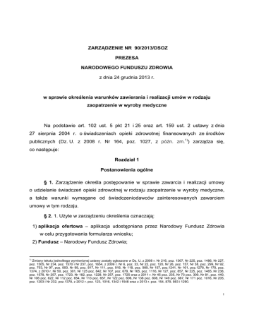 ZARZĄDZENIE NR 90/2013/DSOZ PREZESA NARODOWEGO FUNDUSZU ZDROWIA z dnia 24 grudnia 2013 r. w sprawie określenia warunków zawierania i realizacji umów w rodzaju zaopatrzenie w wyroby medyczne Na podstawie art. 102 ust. 5 pkt 21 i 25 oraz art. 159 ust. 2 ustawy z dnia 27 sierpnia 2004 r. o świadczeniach opieki zdrowotnej finansowanych ze środków publicznych (Dz. U. z 2008 r. Nr 164, poz. 1027, z późn. zm.1)) zarządza się, co następuje: Rozdział 1 Postanowienia ogólne § 1. Zarządzenie określa postępowanie w sprawie zawarcia i realizacji umowy o udzielanie świadczeń opieki zdrowotnej w rodzaju zaopatrzenie w wyroby medyczne, a także warunki wymagane od świadczeniodawców zainteresowanych zawarciem umowy w tym rodzaju. § 2. 1. Użyte w zarządzeniu określenia oznaczają: 1) aplikacja ofertowa – aplikacja udostępniana przez Narodowy Fundusz Zdrowia w celu przygotowania formularza wniosku; 2) Fundusz – Narodowy Fundusz Zdrowia; 1) Zmiany tekstu jednolitego wymienionej ustawy zostały ogłoszone w Dz. U. z 2008 r. Nr 216, poz. 1367, Nr 225, poz. 1486, Nr 227, poz. 1505, Nr 234, poz. 1570 i Nr 237, poz. 1654, z 2009 r. Nr 6, poz. 33, Nr 22, poz. 120, Nr 26, poz. 157, Nr 38, poz. 299, Nr 92, poz. 753, Nr 97, poz. 800, Nr 98, poz. 817, Nr 111, poz. 918, Nr 118, poz. 989, Nr 157, poz.1241, Nr 161, poz.1278, Nr 178, poz. 1374, z 2010 r. Nr 50, poz. 301, Nr 125 poz. 842, Nr 107, poz. 679, Nr 165, poz. 1116, Nr 127, poz. 857, Nr 225, poz. 1465, Nr 238, poz. 1578, Nr 257, poz. 1723, Nr 182, poz. 1228. Nr 257, poz. 1725 oraz z 2011 r. Nr 45 poz. 235, Nr 73 poz. 390, Nr 81, poz. 440, Nr 106 poz. 622, Nr 112 poz. 654, Nr 113 poz. 657, Nr 122 poz. 696, Nr 138 poz. 808, Nr 149 poz. 887, Nr 171 poz. 1016, Nr 205, poz. 1203 i Nr 232, poz.1378, z 2012 r. poz. 123, 1016, 1342 i 1548 oraz z 2013 r. poz. 154, 879, 983 i 1290. 1 3)formularz wniosku – formularz wniosku o zawarcie umowy o udzielanie świadczeń opieki zdrowotnej w rodzaju zaopatrzenie w wyroby medyczne, sporządzony za pomocą aplikacji ofertowej, w formie elektronicznej i papierowej; 4)Karta potwierdzenia uprawnienia na zaopatrzenie w wyroby medyczne przysługujące comiesięcznie – dokument wydawany przez oddział wojewódzki Funduszu, który przez okres do 12 miesięcy służy do potwierdzenia wystawionych zleceń i ich realizacji; 5)rozporządzenie MZ – rozporządzenie Ministra Zdrowia z dnia 6 grudnia 2013 r. w sprawie wykazu wyrobów medycznych wydawanych na zlecenie (Dz. U. poz. 1565); 6) miejsce udzielania świadczeń – lokal podmiotu wykonującego czynności z zakresu zaopatrzenia w wyroby medyczne, spełniający wymagania określone w rozporządzeniu Ministra Zdrowia z dnia 12 grudnia 2013 r. w sprawie szczegółowych wymagań, jakim powinien odpowiadać lokal podmiotu wykonującego czynności z zakresu zaopatrzenia w wyroby medyczne dostępne na zlecenie (Dz. U. poz.1570); 7) Oddział Funduszu – oddział wojewódzki Funduszu; 8) Ogólne warunki umów - warunki umów określone w załączniku do rozporządzenia Ministra Zdrowia z dnia 6 maja 2008 r. w sprawie ogólnych warunków umów o udzielanie świadczeń opieki zdrowotnej (Dz. U. Nr 81, poz. 484); 9) ustawa – ustawa z dnia 27 sierpnia 2004 r. o świadczeniach opieki zdrowotnej finansowanych ze środków publicznych; 10) ustawa o refundacji – ustawa z dnia 12 maja 2011 r. o refundacji leków, środków spożywczych specjalnego przeznaczenia żywieniowego oraz wyrobów medycznych (Dz. U. Nr 122, poz. 696, z późn.zm.2)); 11) ustawa o wyrobach medycznych - ustawa z dnia 20 maja 2010 r. o wyrobach medycznych (Dz. U. Nr 107, poz. 679 oraz z 2011 r. Nr 102, poz. 586 i Nr 113, poz.657); 2) Zmiany tekstu jednolitego wymienionej ustawy zostały ogłoszone w Dz. U. z 2012 r. poz. 95 i 742 oraz z 2013 r. poz. 766 i 1290. 2 12) Portal Narodowego Funduszu Zdrowia – informatyczne środowisko komunikacji, określone w zarządzeniu Nr 45/2009/DSOZ Prezesa Narodowego Funduszu Zdrowia z dnia 5 października 2009 r. w sprawie korzystania z Portalu Narodowego Funduszu Zdrowia (z późn.zm); 13) świadczenie – świadczenie gwarantowane, o którym mowa w art. 5 pkt 37 i w art. 15 ust. 2 pkt 9 ustawy; 14) wniosek – wniosek osoby ubiegającej się o zawarcie umowy o udzielanie świadczeń, który składa się z formularza wniosku oraz dokumentów, o których mowa w § 7; 15) wnioskodawca- świadczeniodawca w rozumieniu art. 5 pkt 41 lit. d ustawy, ubiegający się o zawarcie umowy o udzielanie świadczeń; 16) wyrób medyczny przysługujący comiesięcznie – wyrób medyczny wymieniony w załączniku do rozporządzenia MZ, dla którego okres użytkowania określono „raz na miesiąc”; 17) wyrób medyczny wykonywany na zamówienie – wyrób medyczny, o którym mowa w art. 2 ust. 1 pkt 42 ustawy o wyrobach medycznych oraz wymieniony w załączniku do rozporządzenia MZ; 18) wyrób medyczny produkowany seryjnie – wyrób medyczny wymieniony w załączniku do rozporządzenia MZ; 19) zlecenie – dokument, którego wystawienie jest warunkiem uzyskania świadczenia, który stanowi podstawę do rozliczenia świadczenia. 2. Określenia inne niż wymienione w ust. 1, użyte w zarządzeniu, mają znaczenie nadane im w przepisach odrębnych, w tym, w szczególności w ustawie, ustawie o refundacji, rozporządzeniu MZ oraz Ogólnych warunkach umów. 3. Ilekroć w niniejszym zarządzeniu jest mowa o świadczeniach gwarantowanych z zakresu zaopatrzenia w wyroby medyczne będące przedmiotami ortopedycznymi oraz środki pomocnicze, należy przez to rozumieć świadczenia z zakresu zaopatrzenia w wyroby medyczne na zlecenie osoby uprawnionej, oraz ich naprawy, o których mowa w ustawie o refundacji. 3 Rozdział 2 Przedmiot postępowania i umowy § 3. Przedmiotem postępowania, o którym mowa w § 1, jest zawarcie umowy z wnioskodawcą spełniającym w każdym miejscu udzielania świadczeń wymagania określone, w szczególności, w przepisach: 1) ustawy oraz rozporządze