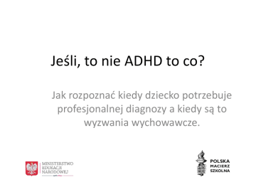 Jeśli, to nie ADHD to co? Jak rozpoznać kiedy dziecko potrzebuje profesjonalnej diagnozy a kiedy są to wyzwania wychowawcze. Plan: • Co to jest ADHD? • Objawy ADHD • Jak odróżnić ADHD od innych problemów zachowania • Rodzina a dziecko • Praca w klasie - zasady Attention deficit hyperactivity disorder (ADHD) • Zespół Nadpobudliwości Psychoruchowe jest najczęściej występującym zaburzeniem psychicznym okresu dzieciństwa. Choroba objawia się zaburzeniami koncentracji, nadmierną impulsywnością i nadruchliwością. • Częstość jej występowania na świecie wynosi od 3% do 5 % W ADHD występują objawy: • zaburzenia koncentracji uwagi • nadmierna impulsywność • nadruchliwość Objawy występują między 5 a 7 (wg NHS diagnoza miedzy 6 a 12 ) rokiem życia i muszą sie utrzymywać przez przynajmniej 6 miesięcy w dwóch środowiskach dziecka np. dom i szkoła. Wg ICD-10 zespół hiperkinetyczny, w leczeniu wymaga kilku metod terapeutycznych, w tym oddziaływanie psychospołeczne, psychoterapię i farmakoterapię Jakie powinnam zadać pytanie diagnostyczne pani Kowalskiej? Objawy ADHD: brak koncentracji: impulsywność • - słucha nieuważnie, • - nie jest w stanie skupić się na szczegółach, • - łatwo się rozprasza pod wpływem zewnętrznych zdarzeń, • - nie pamięta, co miało zrobić, • - jest mało spostrzegawcze, • - często buja w obłokach, • - w środku zdania zapomina, o czym mówiło. • - wyrywa się z odpowiedzią zanim zostanie zadane pytanie, • - często przerywa innym, • - podejmuje pochopne decyzje, • - wydaje się agresywne, bo nie potrafi powstrzymywać się od natychmiastowego zaspokajania potrzeb, • - łatwo, bez zastanowienia, akceptuje cudze pomysły. nadmierna ruchliwość kłopoty w relacjach z dziećmi • - nie jest w stanie usiedzieć na miejscu, • - ma często nerwowe ruchy rąk albo nóg, • - nie umie spokojnie bawić się ani odpoczywać, • - często jest nadmiernie gadatliwe, hałaśliwe, • - często robi rzeczy bardzo ryzykowne, nie umiejąc przewidzieć konsekwencji, • - ma kłopoty z wieczornym zaśnięciem. • - ma zazwyczaj nie najlepszą pozycję w grupie, jest samotne, • - nie umie przegrywać, • - musi koncentrować na sobie uwagę, • - jest zazwyczaj niepewne i nieśmiałe, ma złe zdanie na własny temat, • - nie umie czekać na swoją kolej. Kolejne pytanie do pani Kowalskiej: Co robi dziecko jak wydaje mu Pani polecenie lub przypomina zasadę? Gdy dziecko wykazuje zachowania niepożądane : po wydaniu polecenia lub przypomnienia zasady • Dziecko wróciło do wykonywania zadania • Dziecko odmówiło wykonania zadania – celowe łamanie norm Kolejne pytanie do pani Kowalskiej: Wasza obserwacja dziecka z perspektywy nauczycielki/ nauczyciela – jest ważna jako wsparcie diagnozy dziecka. Dlaczego dzieci łamią zasady? Co poleciliby Państwo pani Kowalskiej? Zasady w klasie ??????? • Po co? • Jest to podpowiedz pozytywnych zachowań, które będą towarzyszyć dziecku w pózniejszym życiu: “Wszystkiego, co naprawdę trzeba wiedzieć o tym, jak żyć, co robić i jak postępować, nauczyłem się w przedszkolu. Mądrość nie znajdowała się na szczycie wiedzy zdobytej w szkole średniej, ale w piaskownicy niedzielnej szkółki. Tam się nauczyłem, że trzeba: • • • • • • • • dzielić wszystko, postępować uczciwie, nie bić innych, odkładać na miejsce każdą znalezioną rzecz, sprzątać po sobie, nie brać nic, co do mnie nie należy, powiedzieć "przepraszam", jeśli się kogoś uraziło, myć ręce przed jedzeniem” (Robert Fulghuma, 1991) Zasady tworzenia zasad • • • • • • • • • wspólnie ustalone spisane/ narysowane konkretne krótkie pozytywne 6-8 zasad obowiązują obydwie strony podlegają wymianom nie podlegaja dyskusji „(Nie)łatwe powroty do domu? Badanie funkcjonowania dzieci i młodzieży powracających z emigracji” Projekt który prowadzony jest przez Fundację Centrum im. Bronisława Geremka we współpracy z zespołem psychologów z Uniwersytetu Jagiellońskiego, pod kierunkiem prof. dr hab. Haliny Grzymała-Moszczyńskiej Dziekuję za uwagę Ania Jurek [email protected]