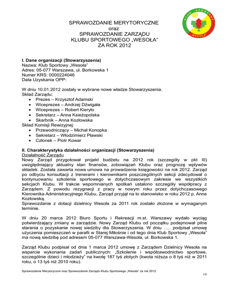 SPRAWOZDANIE MERYTORYCZNE oraz SPRAWOZDANIE ZARZĄDU KLUBU SPORTOWEGO „WESOŁA” ZA ROK 2012 I. Dane organizacji (Stowarzyszenia) Nazwa: Klub Sportowy „Wesoła” Adres: 05-077 Warszawa, ul. Borkowska 1 Numer KRS: 0000224046 Data Uzyskania OPP: W dniu 10.01.2012 zostały w wybrane nowe władze Stowarzyszenia. Skład Zarządu: Prezes – Krzysztof Adamski Wiceprezes – Andrzej Dźwigała Wiceprezes – Robert Kieryło Sekretarz – Anna Ksieżopolska Skarbnik – Anna Kozłowska Skład Komisji Rewizyjnej: Przewodniczący – Michał Konopka Sekretarz – Włodzimierz Pławski Członek – Piotr Kowar II. Charakterystyka działalności organizacji (Stowarzyszenia) Działalność Zarządu Nowy Zarząd przygotował projekt budżetu na 2012 rok (szczegóły w pkt III) uwzględniający aktualny stan finansów, zobowiązań Klubu oraz prognozę wpływów składek. Została zawarta nowa umowa na prowadzenie księgowości na rok 2012. Zarząd po odbyciu konsultacji z trenerami i kierownikami poszczególnych sekcji zdecydował o kontynuowaniu szkolenia sportowego w dotychczasowym zakresie we wszystkich sekcjach Klubu. W trakcie wspomnianych spotkań ustalono szczegóły współpracy z Zarządem. Z powodu rezygnacji z pracy w nowym roku przez dotychczasowego Kierownika Administracyjnego Klubu, Zarząd przyjął na to stanowisko w roku 2012 p. Anne Kozłowską. Sprawozdanie z dotacji dzielnicy Wesoła za 2011 rok zostało złożone w wymaganym terminie. W dniu 20 marca 2012 Biuro Sportu i Rekreacji m.st. Warszawy wydało wyciąg potwierdzający zmiany w zarządzie. Nowy Zarząd Klubu od początku podejmował pilne starania o pozyskanie nowej siedziby dla Stowarzyszenia. W dniu ….. podpisał umowę użyczenia pomieszczeń w parafii w Starej Miłośnie i od tego dnia Klub Sportowy „Wesoła” ma nową siedzibę pod adresem 05-077 Warszawa-Wesoła, ul. Borkowska 1. Zarząd Klubu podpisał od dnia 1 marca 2012 umowę z Zarządem Dzielnicy Wesoła na wsparcie wykonania zadań publicznych: „Szkolenie i współzawodnictwo sportowe, szczególnie dzieci i młodzieży” na kwotę 187 tyś złotych (kwota niższa o 8 tyś niż w 2011 roku, o 13 tyś niż 2010 roku). Sprawozdanie Merytoryczne oraz Sprawozdanie Zarządu Klubu Sportowego „Wesoła” za rok 2012 1/8 W dniu 30 maja 2012 odbyło się Nadzwyczajne Walne Zebranie Członków Klubu Sportowego „Wesoła” w celu przyjęcia sprawozdania finansowego i merytorycznego za rok 2011. Klub jako organizacja pożytku publicznego w roku 2012 był wyłączony z otrzymywania 1% podatku od osób fizycznych za rok 2011 (podobnie jak w poprzednim roku). Jednak został wpisany na listę Organizacji uprawnionych do otrzymywania 1% procenta podatku za rok 2012 (wpłaty w roku 2013). Zarząd Klubu w grudniu złożył ofertę do Dzielnicy Wesoła m. st. Warszawy na „Szkolenie i współzawodnictwo sportowe, szczególnie dzieci i młodzieży” na rok 2013 w wymaganym terminie oraz drugą ofertę do Biura Sportu i Rekreacji m. st. Warszawy na „Szkolenie i współzawodnictwo sportowe dzieci i młodzieży”. Pozyskanie środków z obu źródeł umożliwi w roku 2013 finansowanie szkolenia na dotychczasowym poziomie. Klub Sportowy „Wesoła” prowadzi nieodpłatną i odpłatną działalność pożytku publicznego. Stowarzyszenie nie prowadzi działalności gospodarczej. Działalność Sportowa Klub Sportowy „Wesoła” w ramach nieodpłatnej działalności pożytku publicznego podejmowanymi działaniami zachęcał do czynnego uprawiania sportu, propagował sportowy tryb życia, integrował mieszkańców poprzez organizację własnych turniejów sportowych, a także poprzez branie aktywnego udziału w festynach organizowanych przez dzielnicę Wesoła m. st. Warszawy. W ramach odpłatnej działalności pożytku publicznego Klub Sportowy „Wesoła” prowadził regularne treningi, zapewniał udział we współzawodnictwie sportowym, organizował obozy sportowe, zakupował stroje sportowe dla zawodników. Klub w 2012 roku prowadził szkolenie sportowe w 4 sekcjach sportowych obejmujące 382 osoby, w tym: 1. piłka nożna – ok 340 zawodników w 18 grupach. Trenerzy: Andrzej Czesuch, Andrzej Dźwigała, Krzysztof Adamski, Paweł Przygodzki, Robert Gubiec, Adam Szymczak, Mariusz Horych, Mateusz Jaworski, Wiesław Krawczyk. 2. badminton – 15 zawodników Trenerzy: Jacek Szafrański. Kierownik sekcji: Jacek Szafrański. 3. szachy – 12 zawodników. Trenerzy: Adrianna Staniszewska. Kierownik sekcji: Paweł Staniszewski. 4. tenis stołowy – 15 zawodników. Trenerzy: Dawid Petrów, Krzysztof Piwowarski Kierownik sekcji: Dawid Petrów. Sprawozdanie Merytoryczne oraz Sprawozdanie Zarządu Klubu Sportowego „Wesoła” za rok 2012 2/8 SEKCJA PIŁKI NOŻNEJ SZKOLENIE SPORTOWE Szkolenie w sekcji piłki nożnej odbywało się w następujących grupach: 1. Seniorzy – liga Okręgowa 2. Seniorzy – klasa B 3. rocznik 1995/96 (do końca czerwca 2012 – później włączenie do seniorów) 4. rocznik 1998/99 5. rocznik 2000/01 – grupa zaawansowana 6. rocznik 2000/01 – grupa naborowa 7. rocznik 2002/03 – grupa zaawansowana 8. rocznik 2002/03 – grupa średnio-zaawansowana 9. rocznik 2002/03 – grupa naborowa 10. rocznik 2002/03 – grupa naborowa 11. rocznik 2004/05 – grupa zaawansowana 12. rocznik 2004/05 – grupa średnio-zaawansowana 13. rocznik 2004/05 – grupa naborowa 14. rocznik 2004/05 – grupa naborowa 15. rocznik 2006/07 – grupa początkująca 16. rocznik 2006/07 – grupa początkująca 17. rocznik 2006/07 – grupa naborowa 18. rocznik 2006/07 – grupa naborowa W Klubie funkcjonuję również drużyna Oldbojów, która nie jest objęta szkoleniem sportowym. W porównaniu do roku 2011 znacznie zwiększyła się liczba zawodników trenujących w sekcji piłki nożnej. W maju 2012 klub rozpoczął nabory do nowego rocznika 2006/07. W czerwcu 2012 rocznik 1995 został włączony do drużyny seniorów. We wrześniu i październiku 2012 klub utw