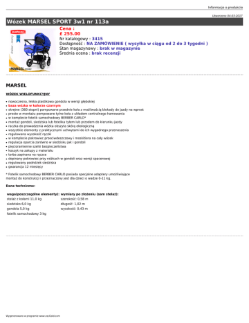 Informacje o produkcie Utworzono 04-03-2017 Wózek MARSEL SPORT 3w1 nr 113a Cena : £ 255.00 Nr katalogowy : 3415 Dostępność : NA ZAMÓWIENIE ( wysyłka w ciągu od 2 do 3 tygodni ) Stan magazynowy : brak w magazynie Średnia ocena : brak recenzji MARSEL WÓZEK WIELOFUNKCYJNY ● ● ● ● ● ● ● ● ● ● ● ● ● ● ● ● ● nowoczesna, lekka plastikowa gondola w wersji głębokiej baza wózka w kolorze czarnym skrętne (360 stopni) pompowane przednie koła z możliwością blokady do jazdy na wprost proste w montażu pompowane tylne koła z układem centralnego hamowania w komplecie fotelik samochodowy BERBER CARLO* montaż gondoli, siedziska lub fotelika tyłem lub przodem do kierunku jazdy raczka do prowadzenia wózka obszyta skórą ekologiczną wszystkie elementy z praktycznymi uchwytami do ich wygodnego przenoszenia regulowana wysokość rączki w komplecie pokrowiec przeciwdeszczowy i moskitiera na cały wózek regulacja oparcia zarówno w siedzisku jak i gondoli pięcioramienne szelki bezpieczeństwa koszyk na zakupy z materiału torba zapinana na rączce dopinany pokrowiec przy nóżkach w gondoli oraz wersji spacerowej regulowany podnóżek siedziska gwarancja 12 miesięcy * Fotelik samochodowy BERBER CARLO posiada specjalne adaptery umożliwiające montaż do konstrukcji i przeznaczony jest dla dzieci o wadze 0-11 kg. Dane techniczne: waga(poszczególne elementy): wymiary po złożeniu (sam stelaż): stelaż z kołami 11,0 kg szerokość: 0,58 m siedzisko 6,0 kg długość: 1,02 m gondola 5,0 kg wysokość: 0,43 m fotelik samochodowy 3 kg Wygenerowano w programie www.oscGold.com