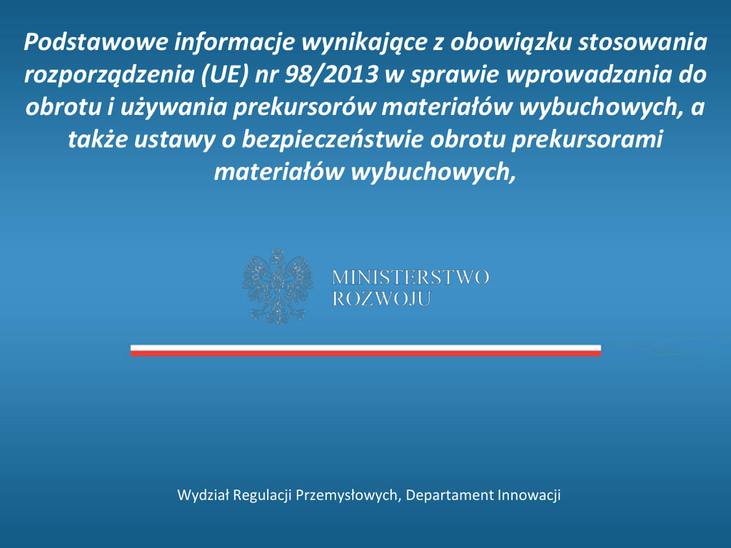 Podstawowe informacje wynikające z obowiązku stosowania rozporządzenia (UE) nr 98/2013 w sprawie wprowadzania do obrotu i używania prekursorów materiałów wybuchowych, a także ustawy o bezpieczeństwie obrotu prekursorami materiałów wybuchowych, Wydział Regulacji Przemysłowych, Departament Innowacji Prekursory materiałów wybuchowych Rozporządzenie Parlamentu Europejskiego i Rady (UE) Nr 98/2013 z dnia 15 stycznia 2013 r. w sprawie wprowadzenia do obrotu i używania prekursorów materiałów wybuchowych Rozporządzenia obowiązuje od 2 września 2014 roku. Ustawa z dnia 13 kwietnia 2016 r. o bezpieczeństwie obrotu prekursorami materiałów wybuchowych Ustawa weszła w życie 15 sierpnia 2016 roku. Cel : wprowadzenie zharmonizowanych przepisów ograniczających dostęp przeciętnych użytkowników do substancji chemicznych i mieszanin, które mogą być użyte do nielegalnego wytwarzania materiałów wybuchowych. Prekursory materiałów wybuchowych Rozporządzenia (UE) Nr 98/2013 nie stosuje się do: a) wyrobów w rozumieniu rozporządzenia (WE) nr 1907/2006; b) wyrobów pirotechnicznych c) produktów leczniczych Rozporządzenie ma zastosowanie do substancji wymienionych w załącznikach I i II lub aktach delegowanych oraz mieszanin lub substancji zawierających te substancje Prekursory materiałów wybuchowych Rozporządzenie (UE) 98/2013 zawiera 2 załączniki i wyszczególnia 15 substancji chemicznych. Substancje wymienione w załączniku I podlegają ograniczeniom jako prekursory materiałów wybuchowych. Substancje wymienione w obu załącznikach podlegają obowiązkowi zgłaszania przez podmioty gospodarcze do krajowego punktu kontaktowego. Substancje wymienione w załączniku II podlegają jedynie obowiązkowi zgłaszania, a nie podlegają ograniczeniom. Prekursory materiałów wybuchowych Substancje chemiczne wymienione w załączniku I wraz ze stężeniami granicznymi, powyżej których stają się prekursorami materiałów wybuchowych podlegającymi ograniczeniom: nadtlenek wodoru -12% wagowo* nitrometan - 30% wagowo* kwas azotowy - 3% wagowo* chloran potasu - 40% wagowo* nadchloran potasu - 40% wagowo* chloran sodu - 40% wagowo* nadchloran sodu - 40% wagowo* * - wartość stężenia granicznego Prekursory materiałów wybuchowych Substancje chemiczne wymienione w załączniku II, w odniesieniu do których podejrzane transakcje podlegają zgłoszeniu: urotropina kwas siarkowy aceton azotan potasu azotan sodu azotan wapnia azotan wapniowo-amonowy azotan amonu [w stężeniu 16% wyrażonym stosunkiem wagi N do NH4NO3 lub wyższym] Prekursory materiałów wybuchowych Artykuł 12 rozporządzenia (UE) 98/2013 upoważnia Komisję Europejską do przyjmowania odrębnych aktów delegowanych w odniesieniu: • do każdej zmiany stężenia granicznego w zał. I • każdej nowej substancji, która dodawana jest do zał. II Akty delegowane wydane na podstawie art. 12 rozporządzenia (UE) 98/2013 będą ogłaszane, w drodze obwieszczenia, w dzienniku Urzędowym Rzeczypospolitej Polskiej, przez ministra właściwego ds. gospodarki Prekursory materiałów wybuchowych Komisja Europejska obecnie w aktach delegowanych proponuje rozszerzenie załącznika II o 3 substancje: glin, sproszkowany magnez, sproszkowany azotanu magnezu, heksahydrat, MgN2O6·6H2O Uzasadnienie: Glin i magnez w postaci sproszkowanej mogą być wykorzystane do nielegalnego wytwarzania materiałów wybuchowych. Heksahydrat azotanu magnezu posiada podobne właściwości utleniające jak inne sole azotanowe wymienione w załączniku II i jest dla nich alternatywą. Prekursory materiałów wybuchowych Definicje: Przeciętny użytkownik – każda osoba fizyczna działająca w celach niezwiązanych z jej działalnością handlową, gospodarczą lub zawodową. Prekursor materiałów wybuchowych – substancja wymieniona w załączniku I do rozporządzenia nr 98/2013, w stężeniu wyższym niż odpowiadające określonemu w nim stężeniu granicznemu; obejmuje mieszaninę lub inną substancję, która zawiera taką wymienioną substancję w stężeniu wyższym niż odpowiadające stężenie graniczne. Podejrzana transakcja - każda transakcja dotycząca substancji wymienionych w załącznikach – lub mieszanin lub substancji zawierających te substancje – w tym transakcje obejmujące użytkowników zawodowych, w przypadku gdy są uzasadnione powody, by podejrzewać, że dana substancja lub mieszanina jest przeznaczona do nielegalnego wytwarzania materiałów wybuchowych Prekursory materiałów wybuchowych Znaczne ilości Przestępcy niekoniecznie muszą nabywać duże ilości tych substancji. Stosunkowo niewielkie ilości mogą być wystarczające do wytworzenia znacznej ilości materiałów wybuchowych, wykorzystując dość łatwo dostępną wiedzę i ogólnodostępny sprzęt Prekursory materiałów wybuchowych Wytyczne KE do Rozporządzenia PE i Rady (UE) Nr 98/2013 Informacje, w jaki sposób rozpoznać i zgłosić podejrzane transakcje, w szczególności w odniesieniu do stężeń lub ilości substancji wymienionych w załączniku II, poniżej których zwykle niepotrzebne są żadne działania. Informacje, w jaki sposób rozpoznać i zgłosić przypadki zniknięcia i kradzieży znacznych ilości. Inne informacje, które mogą zostać uznane za użyteczne. Wytyczne mają na celu ułatwić i zharmonizować implementację rozporządzenia. Skierowane są zarówno dla właściwych organów administracji publicznej i operatorów ekonomicznych. Prekursory materiałów wybuchowych Wytyczne dotyczące środków prewencyjnych (sugestie): Odpowiednie magazynowanie (pomieszczenia zabezpieczone przed włamaniem, nadzór kamer wideo, ograniczony dostęp dla personelu i klientów) Zredukowanie ryzyka podczas transportu (zaufana firma transportowa, stosowanie barier fizycznych zabezpieczających przed włamaniem, unikanie długich postojów podczas trasy) Staranne prowadzenie dokumentacji posiadanych towarów (częste inwentaryz