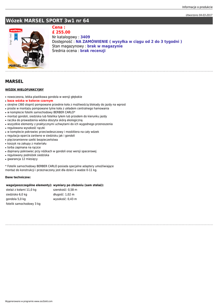 Informacje o produkcie Utworzono 04-03-2017 Wózek MARSEL SPORT 3w1 nr 64 Cena : £ 255.00 Nr katalogowy : 3409 Dostępność : NA ZAMÓWIENIE ( wysyłka w ciągu od 2 do 3 tygodni ) Stan magazynowy : brak w magazynie Średnia ocena : brak recenzji MARSEL WÓZEK WIELOFUNKCYJNY ● ● ● ● ● ● ● ● ● ● ● ● ● ● ● ● ● nowoczesna, lekka plastikowa gondola w wersji głębokie baza wózka w kolorze czarnym skrętne (360 stopni) pompowane przednie koła z możliwością blokady do jazdy na wprost proste w montażu pompowane tylne koła z układem centralnego hamowania w komplecie fotelik samochodowy BERBER CARLO* montaż gondoli, siedziska lub fotelika tyłem lub przodem do kierunku jazdy raczka do prowadzenia wózka obszyta skórą ekologiczną wszystkie elementy z praktycznymi uchwytami do ich wygodnego przenoszenia regulowana wysokość rączki w komplecie pokrowiec przeciwdeszczowy i moskitiera na cały wózek regulacja oparcia zarówno w siedzisku jak i gondoli pięcioramienne szelki bezpieczeństwa koszyk na zakupy z materiału torba zapinana na rączce dopinany pokrowiec przy nóżkach w gondoli oraz wersji spacerowej regulowany podnóżek siedziska gwarancja 12 miesięcy * Fotelik samochodowy BERBER CARLO posiada specjalne adaptery umożliwiające montaż do konstrukcji i przeznaczony jest dla dzieci o wadze 0-11 kg. Dane techniczne: waga(poszczególne elementy): wymiary po złożeniu (sam stelaż): stelaż z kołami 11,0 kg szerokość: 0,58 m siedzisko 6,0 kg długość: 1,02 m gondola 5,0 kg wysokość: 0,43 m fotelik samochodowy 3 kg Wygenerowano w programie www.oscGold.com