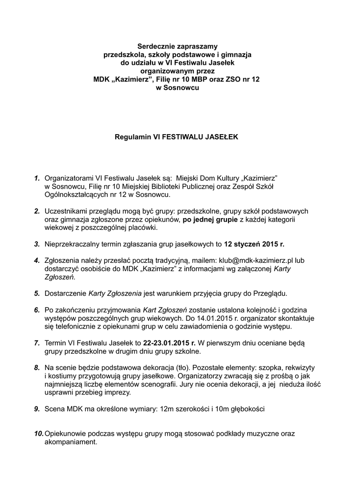 Serdecznie zapraszamy przedszkola, szkoły podstawowe i gimnazja do udziału w VI Festiwalu Jasełek organizowanym przez MDK „Kazimierz”, Filię nr 10 MBP oraz ZSO nr 12 w Sosnowcu Regulamin VI FESTIWALU JASEŁEK 1. Organizatorami VI Festiwalu Jasełek są: Miejski Dom Kultury „Kazimierz” w Sosnowcu, Filię nr 10 Miejskiej Biblioteki Publicznej oraz Zespół Szkół Ogólnokształcących nr 12 w Sosnowcu. 2. Uczestnikami przeglądu mogą być grupy: przedszkolne, grupy szkół podstawowych oraz gimnazja zgłoszone przez opiekunów, po jednej grupie z każdej kategorii wiekowej z poszczególnej placówki. 3. Nieprzekraczalny termin zgłaszania grup jasełkowych to 12 styczeń 2015 r. 4. Zgłoszenia należy przesłać pocztą tradycyjną, mailem: [email protected] lub dostarczyć osobiście do MDK „Kazimierz” z informacjami wg załączonej Karty Zgłoszeń. 5. Dostarczenie Karty Zgłoszenia jest warunkiem przyjęcia grupy do Przeglądu. 6. Po zakończeniu przyjmowania Kart Zgłoszeń zostanie ustalona kolejność i godzina występów poszczególnych grup wiekowych. Do 14.01.2015 r. organizator skontaktuje się telefonicznie z opiekunami grup w celu zawiadomienia o godzinie występu. 7. Termin VI Festiwalu Jasełek to 22-23.01.2015 r. W pierwszym dniu oceniane będą grupy przedszkolne w drugim dniu grupy szkolne. 8. Na scenie będzie podstawowa dekoracja (tło). Pozostałe elementy: szopka, rekwizyty i kostiumy przygotowują grupy jasełkowe. Organizatorzy zwracają się z prośbą o jak najmniejszą liczbę elementów scenografii. Jury nie ocenia dekoracji, a jej nieduża ilość usprawni przebieg imprezy. 9. Scena MDK ma określone wymiary: 12m szerokości i 10m głębokości 10. Opiekunowie podczas występu grupy mogą stosować podkłady muzyczne oraz akompaniament. 11. Na sali widowiskowej dostępny będzie odtwarzacz płyt CD-audio (odczyt tylko formatu audio). Utwory na płycie CD prosimy nagrać w prawidłowej kolejności. Istnieje możliwość odtwarzania utworów w formacie mp3 z pamięci przenośnych z portem USB. Nośniki typu kasety magnetofonowe nie będą odtwarzane. Wszelkich informacji dot. nagłośnienia oraz oświetlenia sceny udziela Jacek Górka- tel. 501 484 099. Pozostałe pytania prosimy kierować pod nr tel. 32 269 41 19. 12. Organizatorzy przewidują dla laureatów nagrody, dla pozostałych wykonawców dyplomy uczestnictwa, a dla opiekunów certyfikaty osiągnięć dydaktycznych 13. Prezentacje grup będą oceniane przez jury w kategoriach wiekowych: Przedszkole i klasy „0” Szkoła Podstawowa klasy 1-6 Gimnazjum 14. Kryteria oceny: dykcja, gra aktorska, ruch sceniczny - choreografia, śpiew, reżyseria. Nie ocenia się czasu występu oraz elementów scenografii. 15. Łączny czas występu nie powinien przekraczać 30 minut dla przedszkoli oraz szkół podstawowych, do 40 min dla gimnazjów. 16. Ogłoszenie wyników nastąpi w dniu 26.01.2014 r. Opiekunowie, których grupy otrzymały nagrody albo wyróżnienia zostaną poinformowani telefonicznie w dniu ogłoszenia wyników. Uroczyste wręczenie nagród odbędzie się 27.01.2015 r. o godz. 13.00 w Miejskim Domu Kultury „Kazimierz”(sala widowiskowa). Wyniki będą udostępnione na stronie internetowej - www.mdk-kazimierz.pl oraz na facebooku. 17. Decyzje jury są ostateczne i nieodwołalne. 18. Organizatorzy zastrzegają sobie prawo dokonania zmian w regulaminie. 19. Kontakt: tel. 32 269 41 19, mail: [email protected]