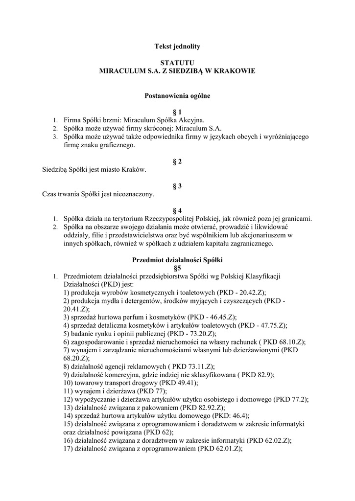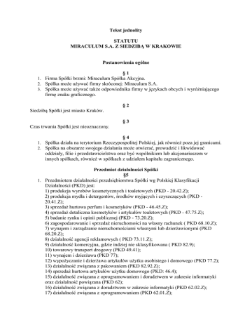 Tekst jednolity STATUTU MIRACULUM S.A. Z SIEDZIBĄ W KRAKOWIE Postanowienia ogólne §1 1. Firma Spółki brzmi: Miraculum Spółka Akcyjna. 2. Spółka może używać firmy skróconej: Miraculum S.A. 3. Spółka może używać także odpowiednika firmy w językach obcych i wyróżniającego firmę znaku graficznego. §2 Siedzibą Spółki jest miasto Kraków. §3 Czas trwania Spółki jest nieoznaczony. §4 1. Spółka działa na terytorium Rzeczypospolitej Polskiej, jak również poza jej granicami. 2. Spółka na obszarze swojego działania może otwierać, prowadzić i likwidować oddziały, filie i przedstawicielstwa oraz być wspólnikiem lub akcjonariuszem w innych spółkach, również w spółkach z udziałem kapitału zagranicznego. Przedmiot działalności Spółki §5 1. Przedmiotem działalności przedsiębiorstwa Spółki wg Polskiej Klasyfikacji Działalności (PKD) jest: 1) produkcja wyrobów kosmetycznych i toaletowych (PKD - 20.42.Z); 2) produkcja mydła i detergentów, środków myjących i czyszczących (PKD 20.41.Z); 3) sprzedaż hurtowa perfum i kosmetyków (PKD - 46.45.Z); 4) sprzedaż detaliczna kosmetyków i artykułów toaletowych (PKD - 47.75.Z); 5) badanie rynku i opinii publicznej (PKD - 73.20.Z); 6) zagospodarowanie i sprzedaż nieruchomości na własny rachunek ( PKD 68.10.Z); 7) wynajem i zarządzanie nieruchomościami własnymi lub dzierżawionymi (PKD 68.20.Z); 8) działalność agencji reklamowych ( PKD 73.11.Z); 9) działalność komercyjna, gdzie indziej nie sklasyfikowana ( PKD 82.9); 10) towarowy transport drogowy (PKD 49.41); 11) wynajem i dzierżawa (PKD 77); 12) wypożyczanie i dzierżawa artykułów użytku osobistego i domowego (PKD 77.2); 13) działalność związana z pakowaniem (PKD 82.92.Z); 14) sprzedaż hurtowa artykułów użytku domowego (PKD: 46.4); 15) działalność związana z oprogramowaniem i doradztwem w zakresie informatyki oraz działalność powiązana (PKD 62); 16) działalność związana z doradztwem w zakresie informatyki (PKD 62.02.Z); 17) działalność związana z oprogramowaniem (PKD 62.01.Z); 18) działalność związana z zarządzaniem urządzeniami informatycznymi (PKD 62.03.Z); 19) pozostała działalność wydawnicza (PKD 58.19.Z); 20) przetwarzanie danych; zarządzanie stronami internetowymi (hosting) i podobna działalność (PKD 63.11.Z); 21) działalność wydawnicza w zakresie oprogramowania (PKD 58.2); 22) konserwacja i naprawa maszyn (PKD 33.12.Z); 23) pozostała działalność usługowa w zakresie technologii informatycznych i komputerowych (PKD 62.09.Z); 24) roboty budowlane związane ze wznoszeniem budynków mieszkalnych i niemieszkalnych (PKD 41.20.Z); 25) badania i analizy techniczne (PKD 71.20); 26) doradztwo związane z zarządzaniem (PKD 70.2); 27) fryzjerstwo i pozostałe zabiegi kosmetyczne (PKD 96.02); 28) pozostała działalność wydawnicza (PKD 58.19.Z); 29) działalność usługowa związana z przygotowaniem do druku (PKD 18.13.Z); 30) działalność związana z organizacja targów i wystaw i kongresów (PKD 82.30.Z); 31) pozostała działalność rozrywkowa i rekreacyjna (PKD 93.29.Z); 32) magazynowanie i przechowywanie pozostałych towarów (PKD 52.103); 33) pozostałe doradztwo w zakresie prowadzenia działalności gospodarczej i zarządzania (PKD 70.22.Z); 34) pozostała działalność pocztowa i kurierska (PKD 53.20.Z); 35) produkcja leków i pozostałych wyrobów farmaceutycznych (PKD 21.20.Z); 36) produkcja urządzeń, instrumentów oraz wyrobów medycznych, włączając dentystyczne (PKD 32.50.Z); 37) produkcja barwników i pigmentów (PKD 20.12.Z); 38) produkcja pozostałych wyrobów chemicznych, gdzie indziej niesklasyfikowana (PKD 20.59.Z); 39) produkcja olejków eterycznych (PKD 20.53.Z); 40) produkcja opakowań z tworzyw sztucznych (PKD 22.22.Z); 41) produkcja pozostałych wyrobów z tworzyw sztucznych (PKD 22.29.Z); 42) naprawa i konserwacja pozostałego sprzętu i wyposażenia (PKD 33.19.Z); 43) produkcja gier i zabawek (PKD 32.40.Z); 44) sprzedaż hurtowa wyrobów farmaceutycznych i medycznych (PKD 46.46.Z); 45) sprzedaż hurtowa elektrycznych artykułów użytku domowego (PKD 46.43.Z); 46) sprzedaż hurtowa pozostałych artykułów użytku domowego (PKD 46.49.Z); 47) sprzedaż hurtowa wyrobów chemicznych (PKD 46.75.Z); 48) sprzedaż hurtowa pozostałych półproduktów (PKD 46.76.Z); 49) sprzedaż detaliczna wyrobów farmaceutycznych prowadzona w wyspecjalizowanych sklepach (PKD 47.73.Z); 50) sprzedaż detaliczna prowadzona przez domy sprzedaży wysyłkowej lub Internet (PKD 47.91.Z); 51) przeładunek towarów w pozostałych punktach przeładunkowych (PKD 52.24.C); 52) badania naukowe i prace rozwojowe w dziedzinie pozostałych nauk przyrodniczych i technicznych (PKD 72.19.Z); 53) pozaszkolne formy edukacji sportowej oraz zajęć sportowych i rekreacyjnych (PKD 85.51.Z); 54) działalność agencji informacyjnych (PKD 63.91.Z); 55) działalność fotograficzna (PKD 74.20.Z). 2. Istotna zmiana przedmiotu działalności Spółki następuje bez wykupu akcji akcjonariuszy, którzy nie zgadzają się na zmianę, jeżeli uchwała Walnego Zgromadzenia zostanie podjęta większością trzech czwartych głosów w obecności osób reprezentujących co najmniej połowę kapitału zakładowego. 1. 2. 3. 4. 5. 6. 7. Kapitał zakładowy i akcje §6 Kapitał zakładowy Spółki wynosi 24.336.900 zł (słownie: dwadzieścia cztery miliony trzysta trzydzieści sześć tysięcy dziewięćset złotych) i dzieli się na 5.408.200 (słownie: pięć milionów czterysta osiem tysięcy dwieście) akcji o wartości nominalnej po 4,50zł (cztery złote pięćdziesiąt groszy) każda akcja, w tym: a) 5.388.200 (słownie: pięć milionów trzysta osiemdziesiąt osiem tysięcy dwieście) akcji zwykłych na okaziciela serii A1; b) 20.000 (dwadzieścia tysięcy) akcji zwykłych imiennych serii M1 o kolejnych numerach od 00001 do 20000. Akcje Spółki mogą być obejmowane w zamian za wkłady pieniężne lu